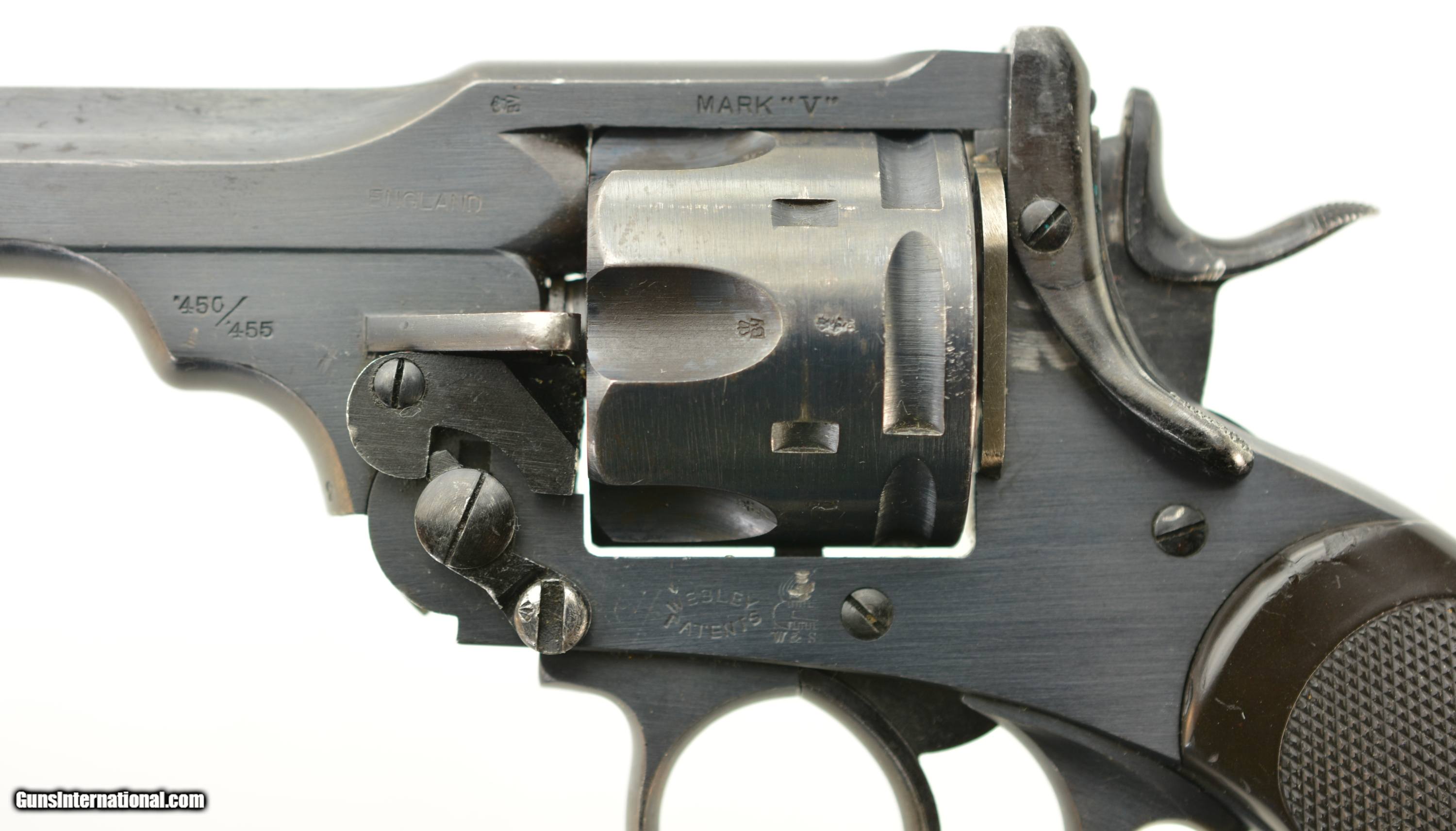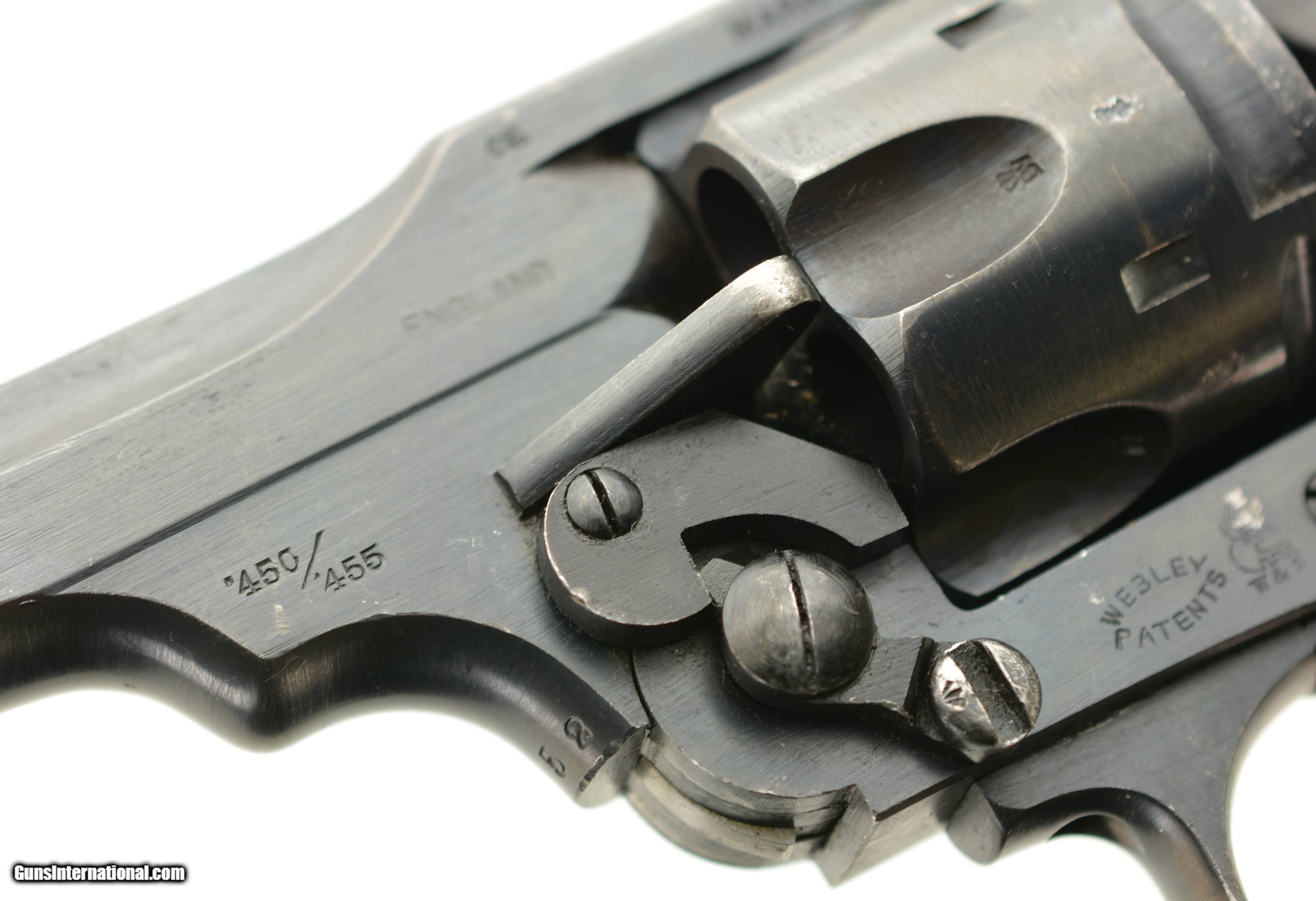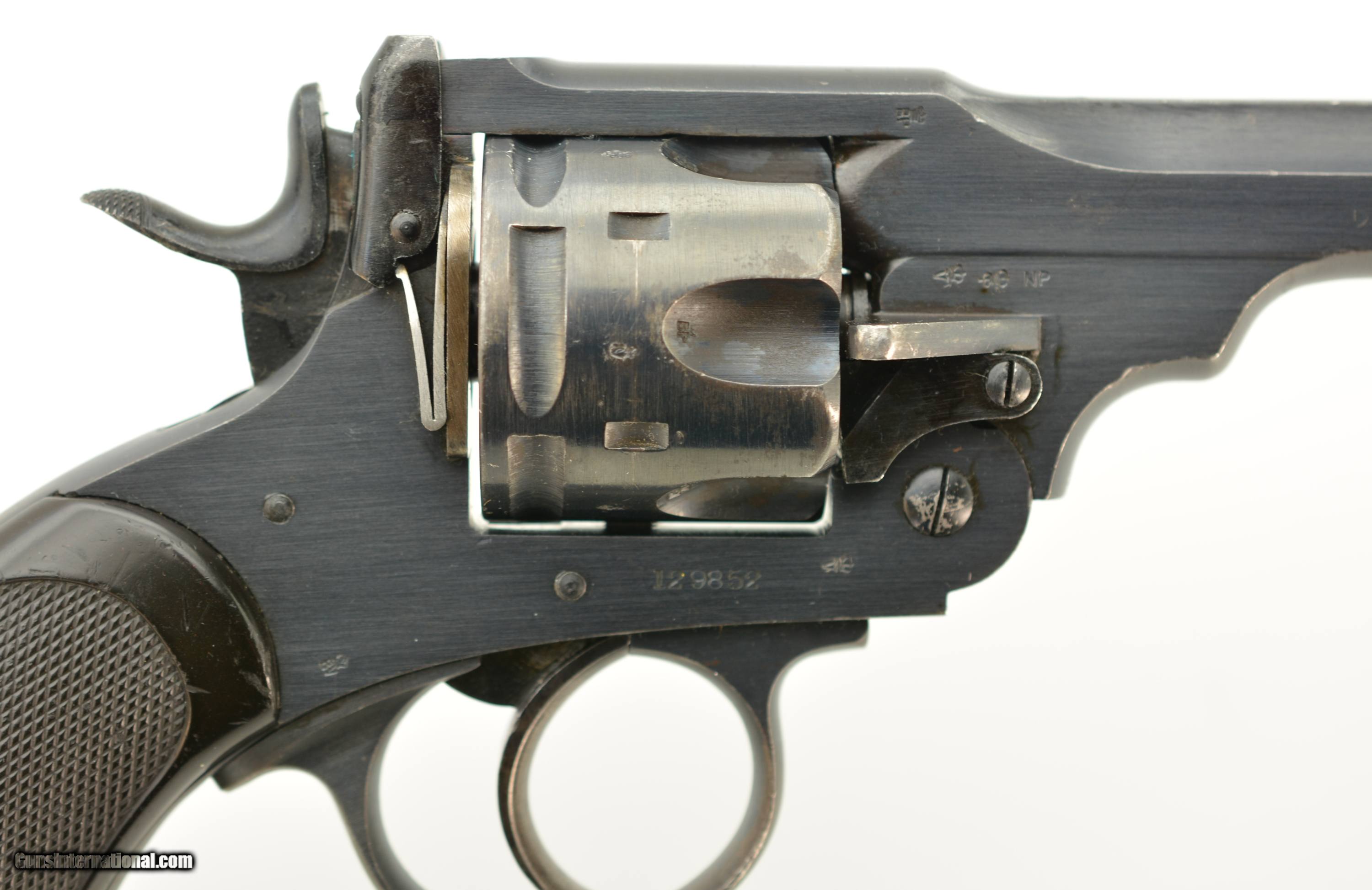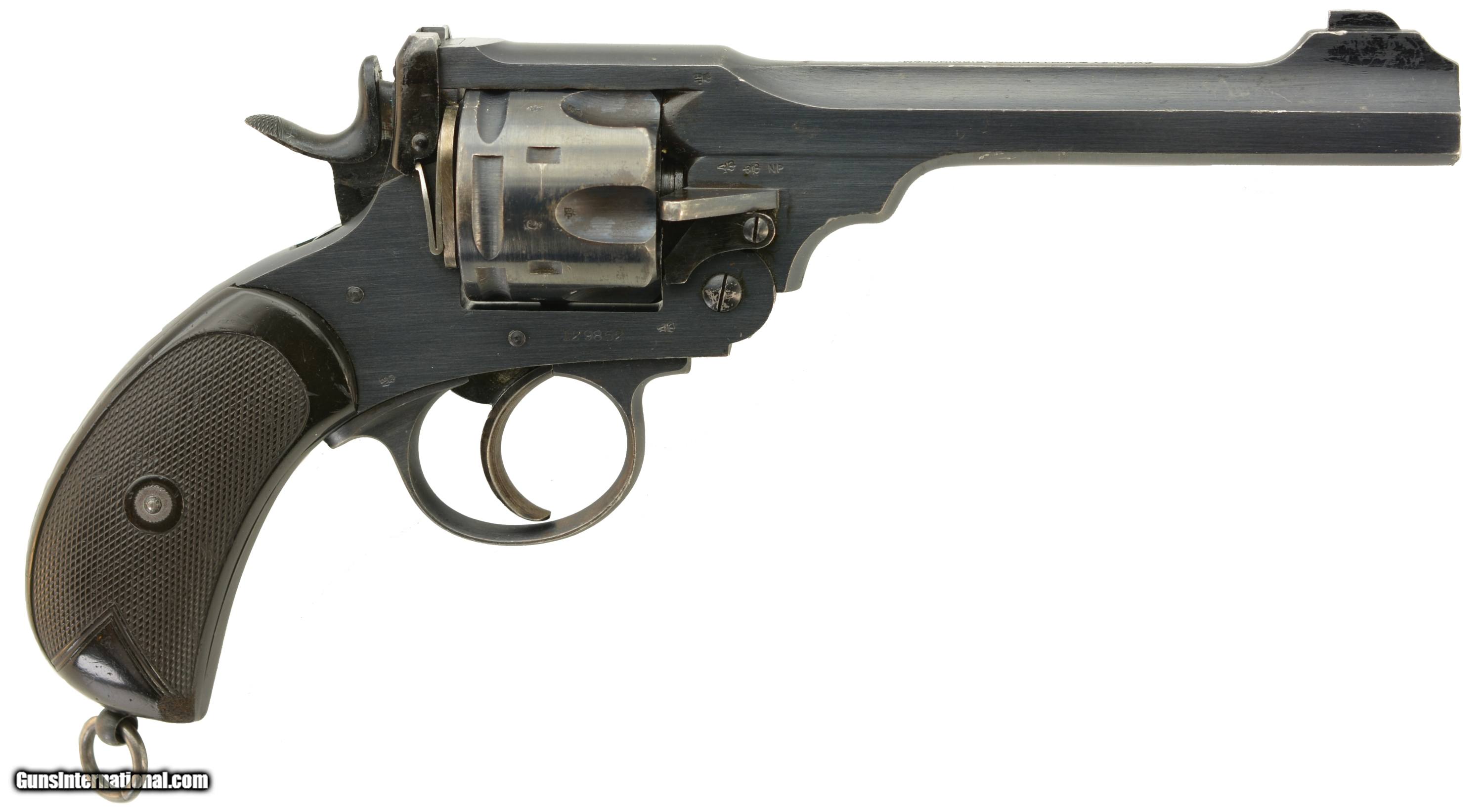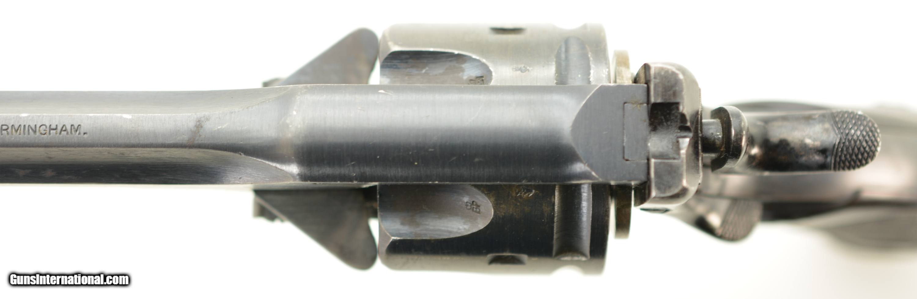 Description: Serial #129852, .455 Webley, 6" barrel with an excellent, bright bore. This is a handsome, commercially marked revolver that retains 95-97% of the original brushed blue finish that has mild silvering along the high and exposed edges, as well as a gentle turn-ring on the cylinder. Traces of Suncorite are present at the front sight, on the hammer, and on the thumb-lever. All markings are crisp, and the checkered Vulcanite grips are in very good-near fine shape with some minor flattening of the points, as well as light surface scratches, and a chip at the toe of the right panel. The lock-up is still tight, and the mechanism functions flawlessly. This example is stamped "England" as required for export. These revolvers were built between 1913 - 1915. The 6" barrel appears to be more scarce than the 4" examples. This is a very nice early Mk. V Webley, in a desirable configuration. FFL or C&R SOLD Curio/Relic: Yes |