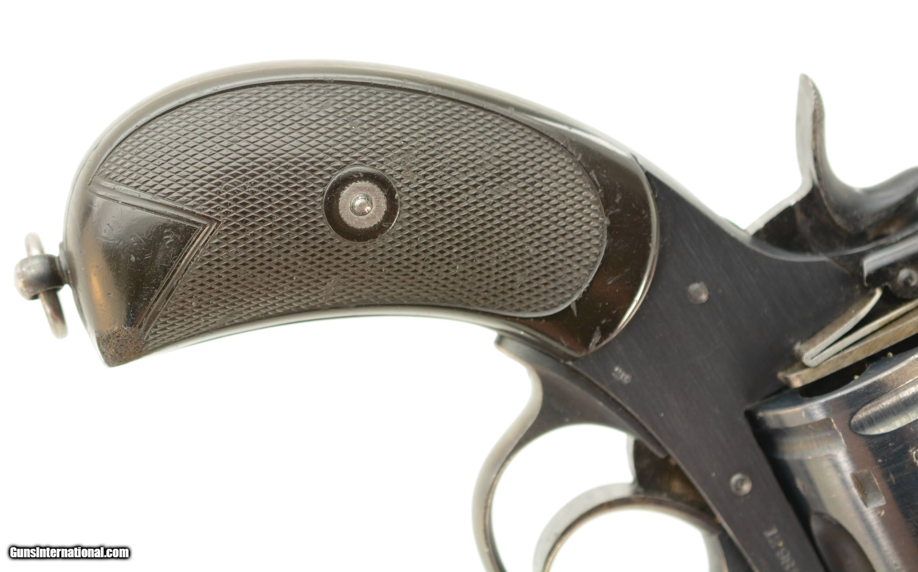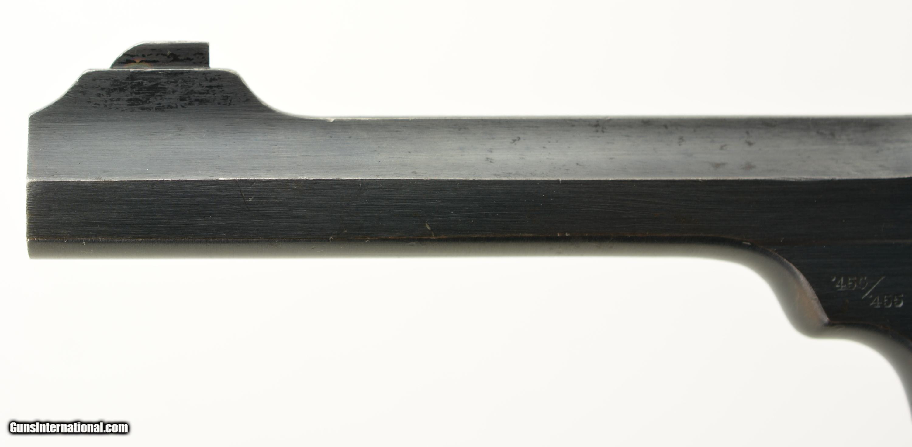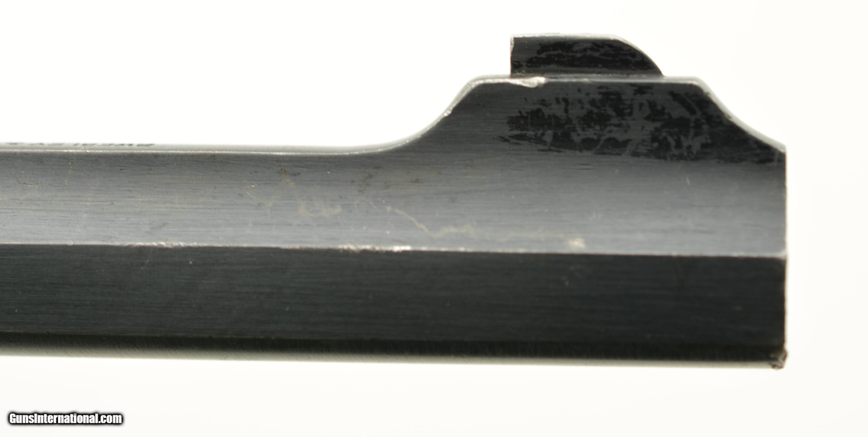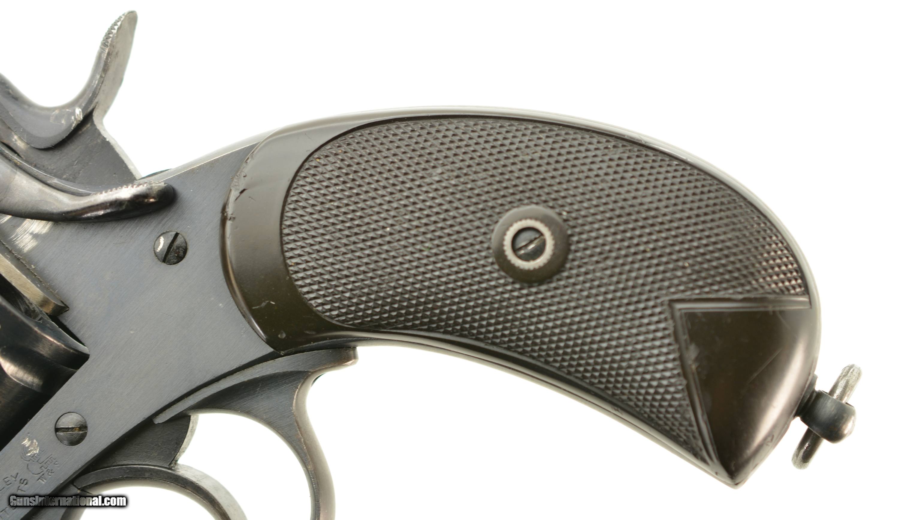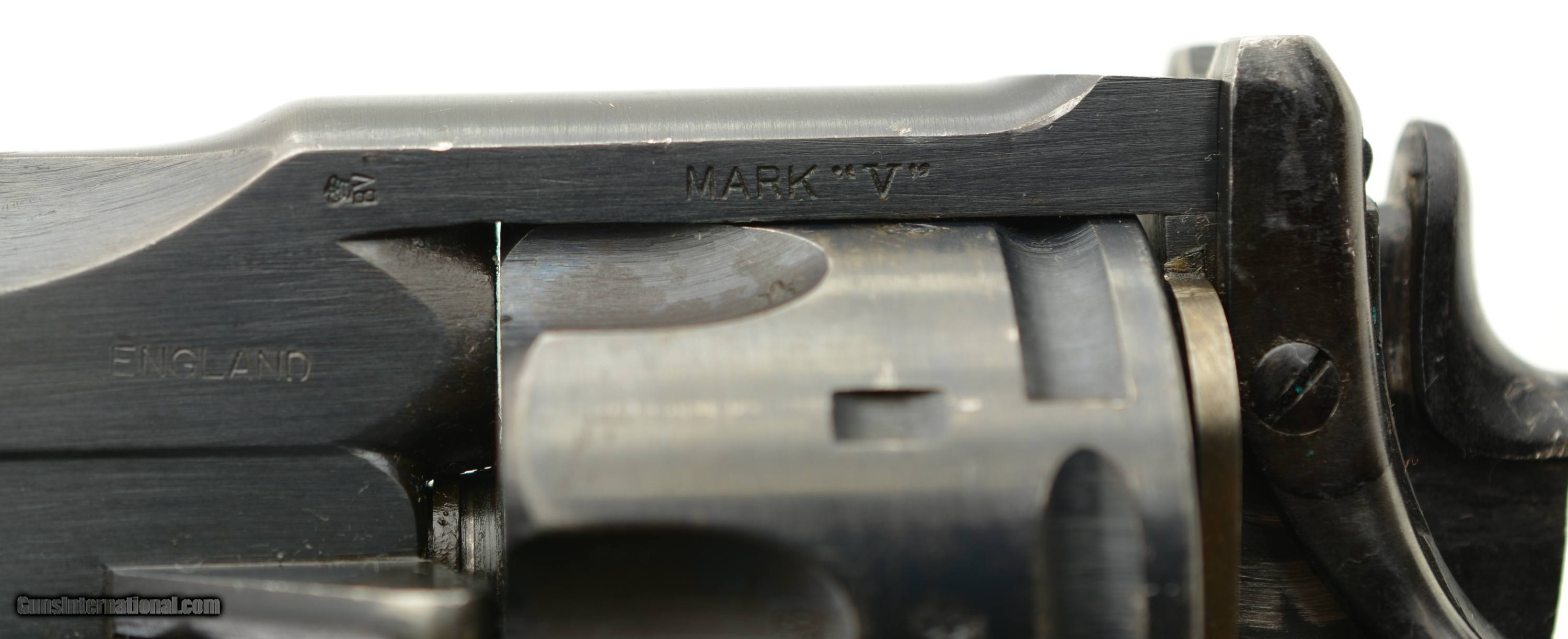 Description: Serial #129852, .455 Webley, 6" barrel with an excellent, bright bore. This is a handsome, commercially marked revolver that retains 95-97% of the original brushed blue finish that has mild silvering along the high and exposed edges, as well as a gentle turn-ring on the cylinder. Traces of Suncorite are present at the front sight, on the hammer, and on the thumb-lever. All markings are crisp, and the checkered Vulcanite grips are in very good-near fine shape with some minor flattening of the points, as well as light surface scratches, and a chip at the toe of the right panel. The lock-up is still tight, and the mechanism functions flawlessly. This example is stamped "England" as required for export. These revolvers were built between 1913 - 1915. The 6" barrel appears to be more scarce than the 4" examples. This is a very nice early Mk. V Webley, in a desirable configuration. FFL or C&R SOLD Curio/Relic: Yes |
