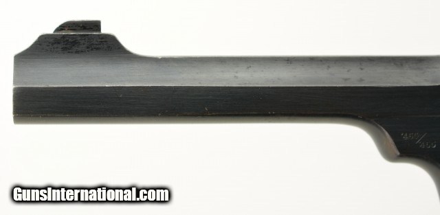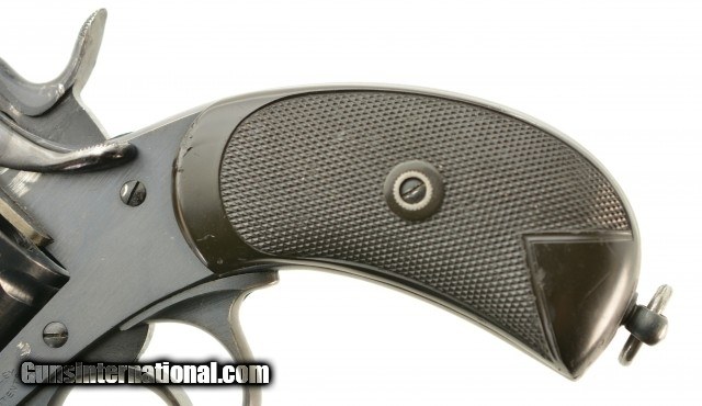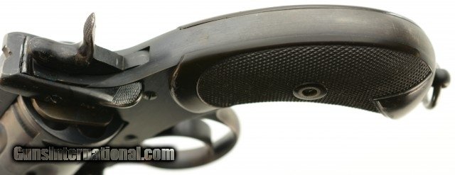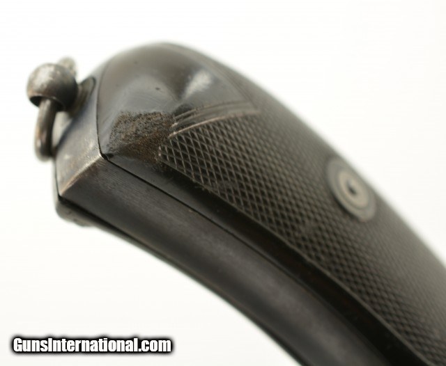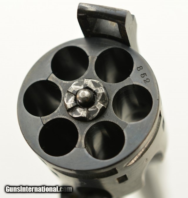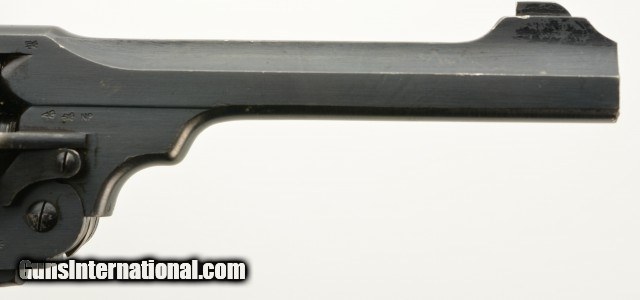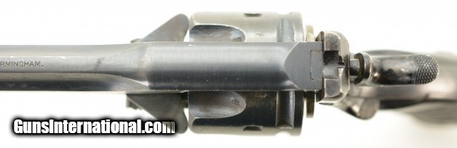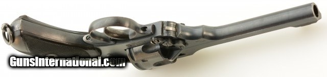 Description: Serial #129852, .455 Webley, 6" barrel with an excellent, bright bore. This is a handsome, commercially marked revolver that retains 95-97% of the original brushed blue finish that has mild silvering along the high and exposed edges, as well as a gentle turn-ring on the cylinder. Traces of Suncorite are present at the front sight, on the hammer, and on the thumb-lever. All markings are crisp, and the checkered Vulcanite grips are in very good-near fine shape with some minor flattening of the points, as well as light surface scratches, and a chip at the toe of the right panel. The lock-up is still tight, and the mechanism functions flawlessly. This example is stamped "England" as required for export. These revolvers were built between 1913 - 1915. The 6" barrel appears to be more scarce than the 4" examples. This is a very nice early Mk. V Webley, in a desirable configuration. FFL or C&R SOLD Curio/Relic: Yes |