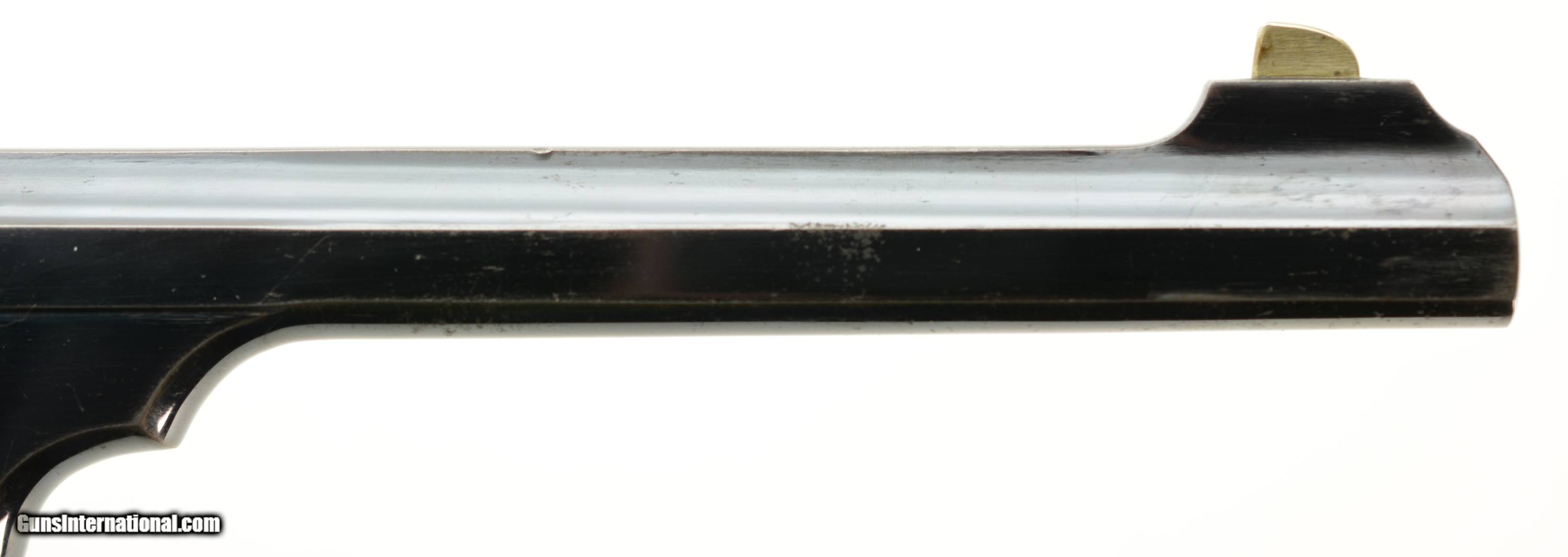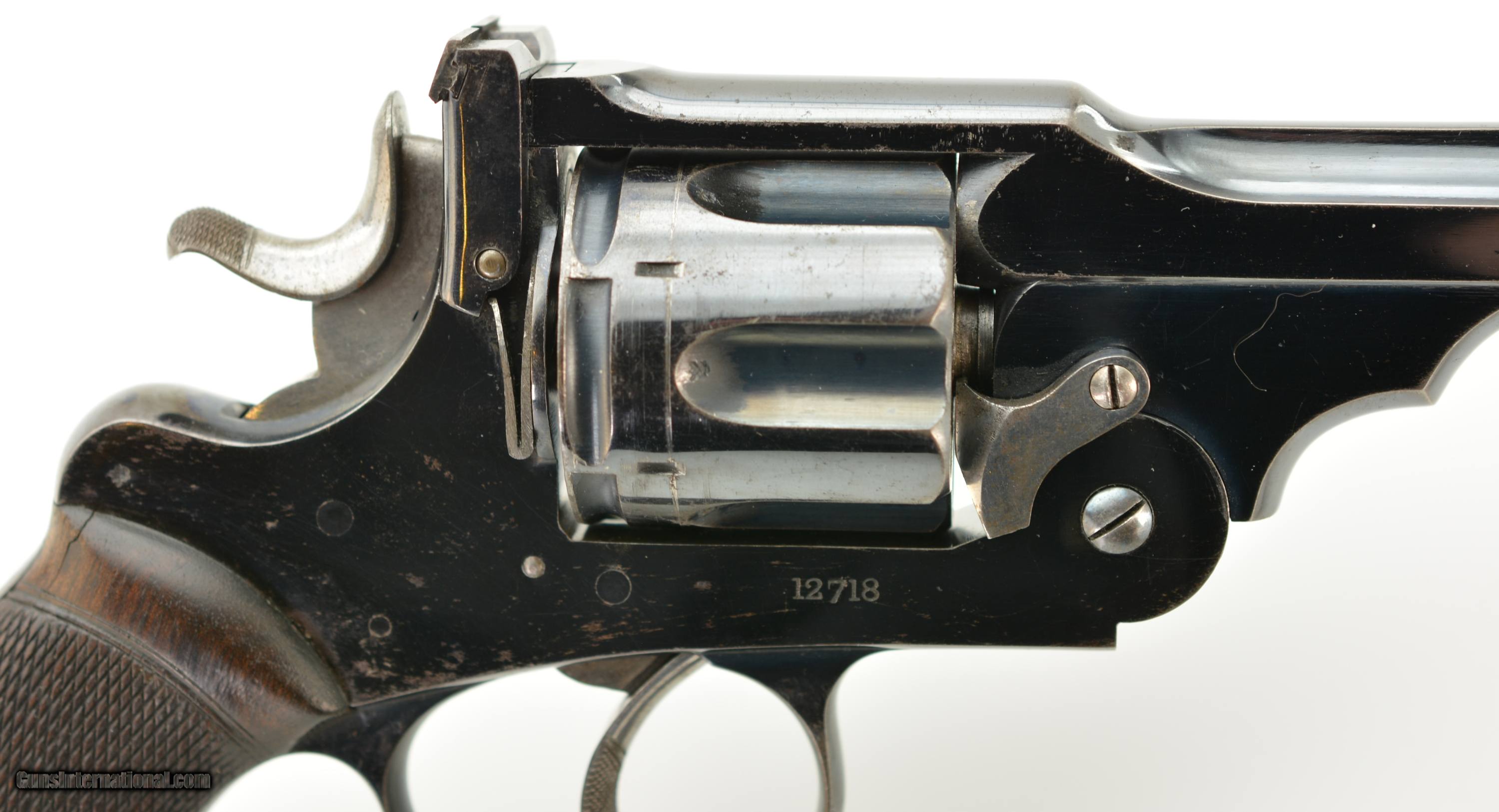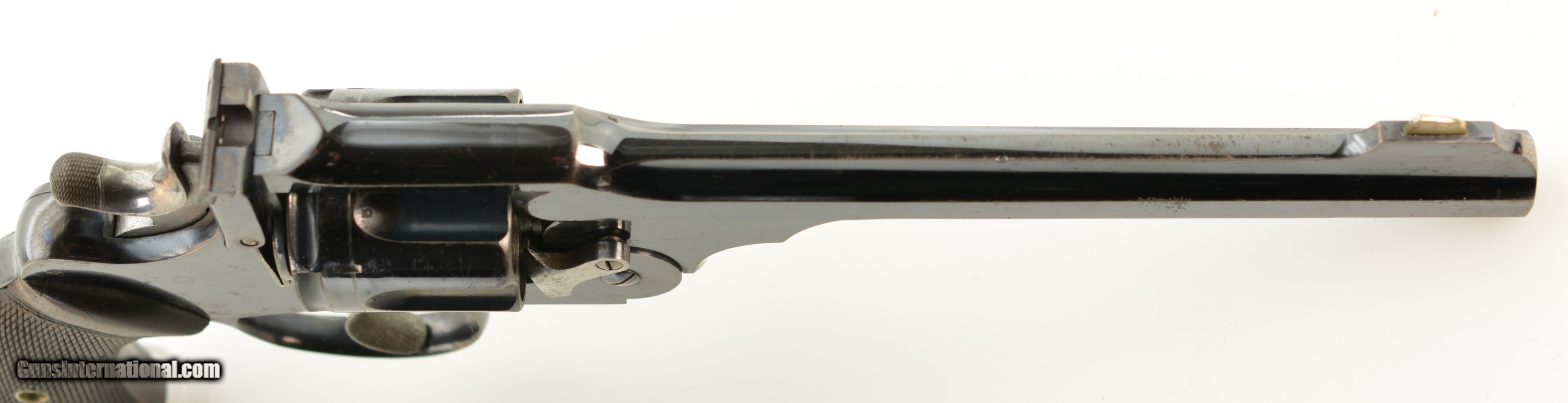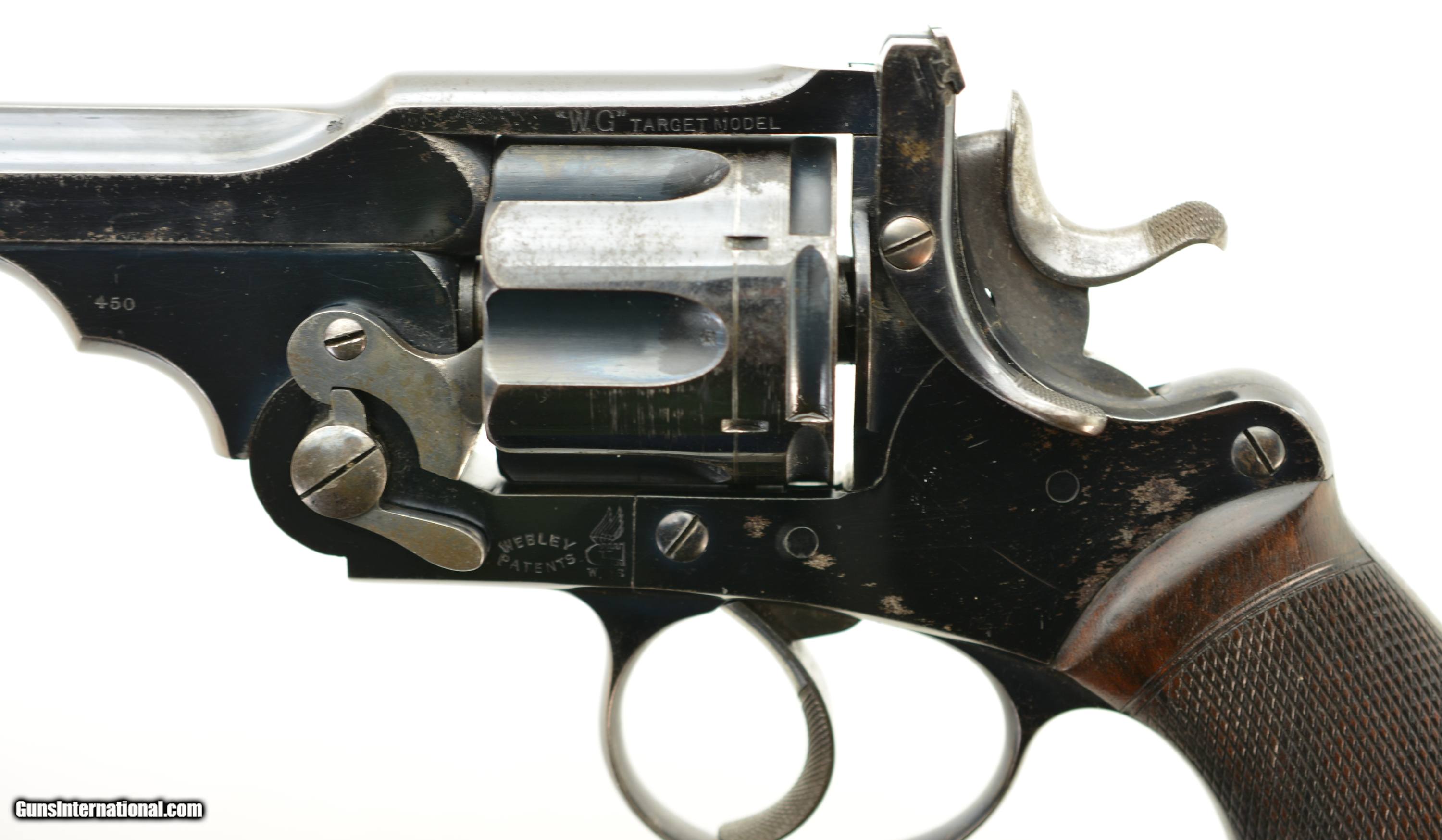 Description: Serial #12718, .450 CF, 7 1/2" barrel with a fine, bright bore that has traces of freckling within the grooves. This is a handsome revolver that matching numbers on the frame, barrel, cylinder, and the interior of the grip panels. The metal retains 90-95% of the original bright, lustrous blue finish with scattered minor handling marks, silvering on the raised edges and projections, as well as mottled gray on the gripstraps. Some mild freckling is also present on the sides of the frame towards the rear. The topstrap has Webley "'WG' TARGET MODEL" marking with the Webley & Scott "Winged Bullet" on the lower left side of the frame, and no retailer marking. The hammer, trigger, and cylinder retention stirrup have some traces of mild freckling on the bright metal while the thumb lever has most of the original blue remaining. The checkered walnut grips are in fine shape with a few minor bruises and handling marks on either panel. The lock-up is still solid and tight, and the action functions flawlessly. This is a lovely example of a desirable WG Target Model, and has an exceptionally high amount of the original finish remaining. It rates excellent overall, and would be a great addition to any collection of fine British firearms. FFL or C&R SOLD Curio/Relic: Yes Manufacturer: Webley Model: WG Serial Number: 12718 Caliber Info: .450 Gauge Info: .450 |