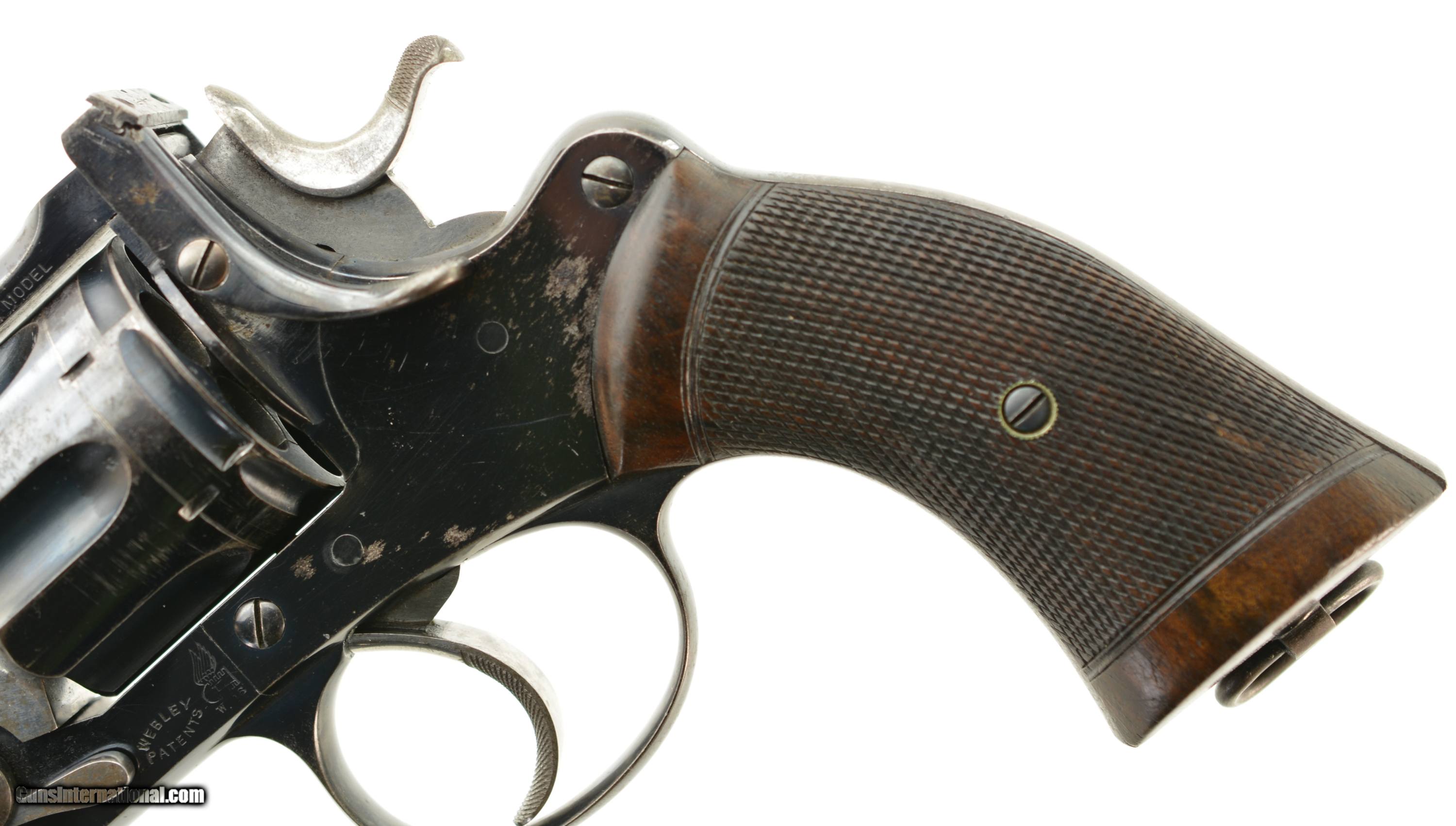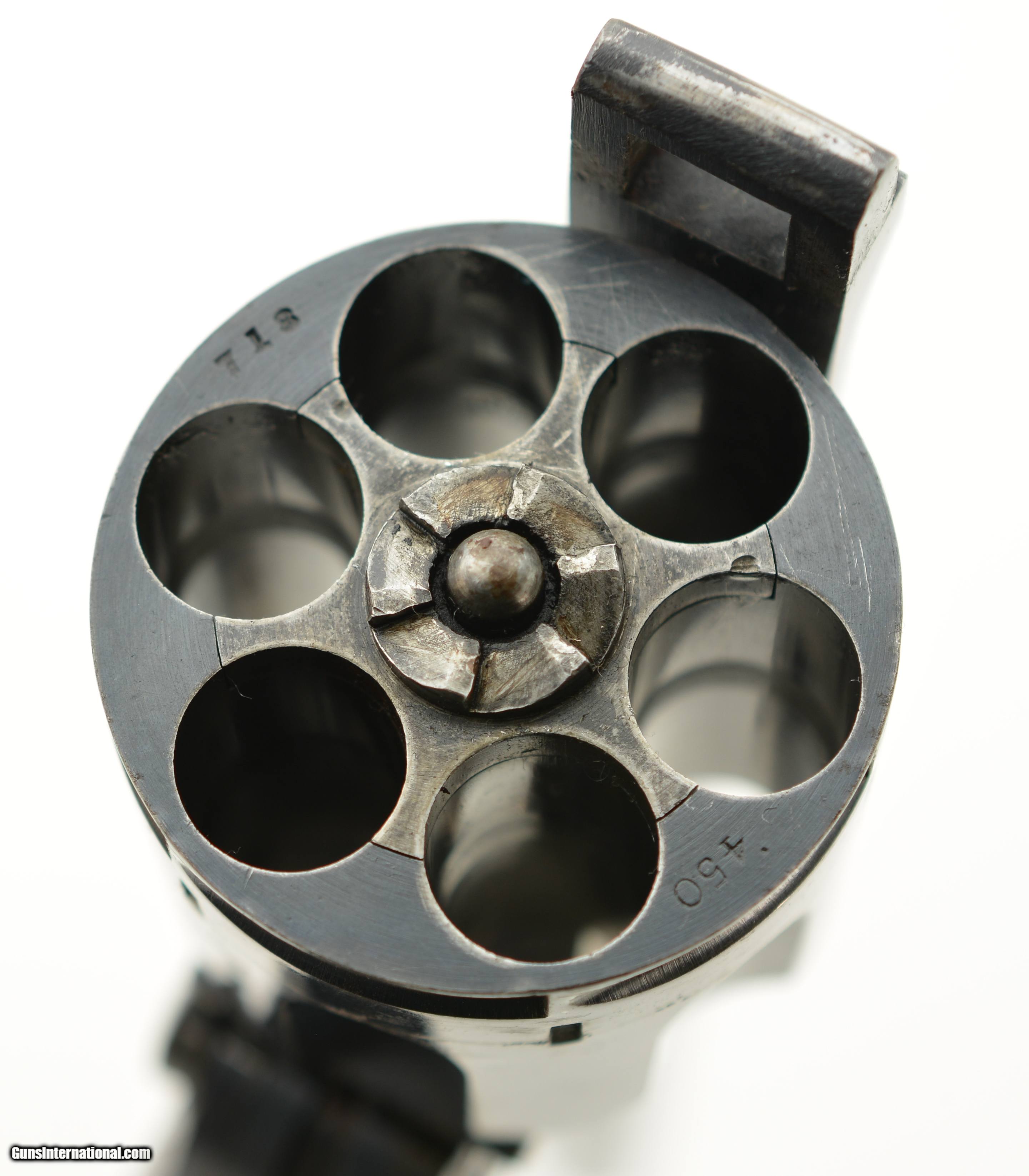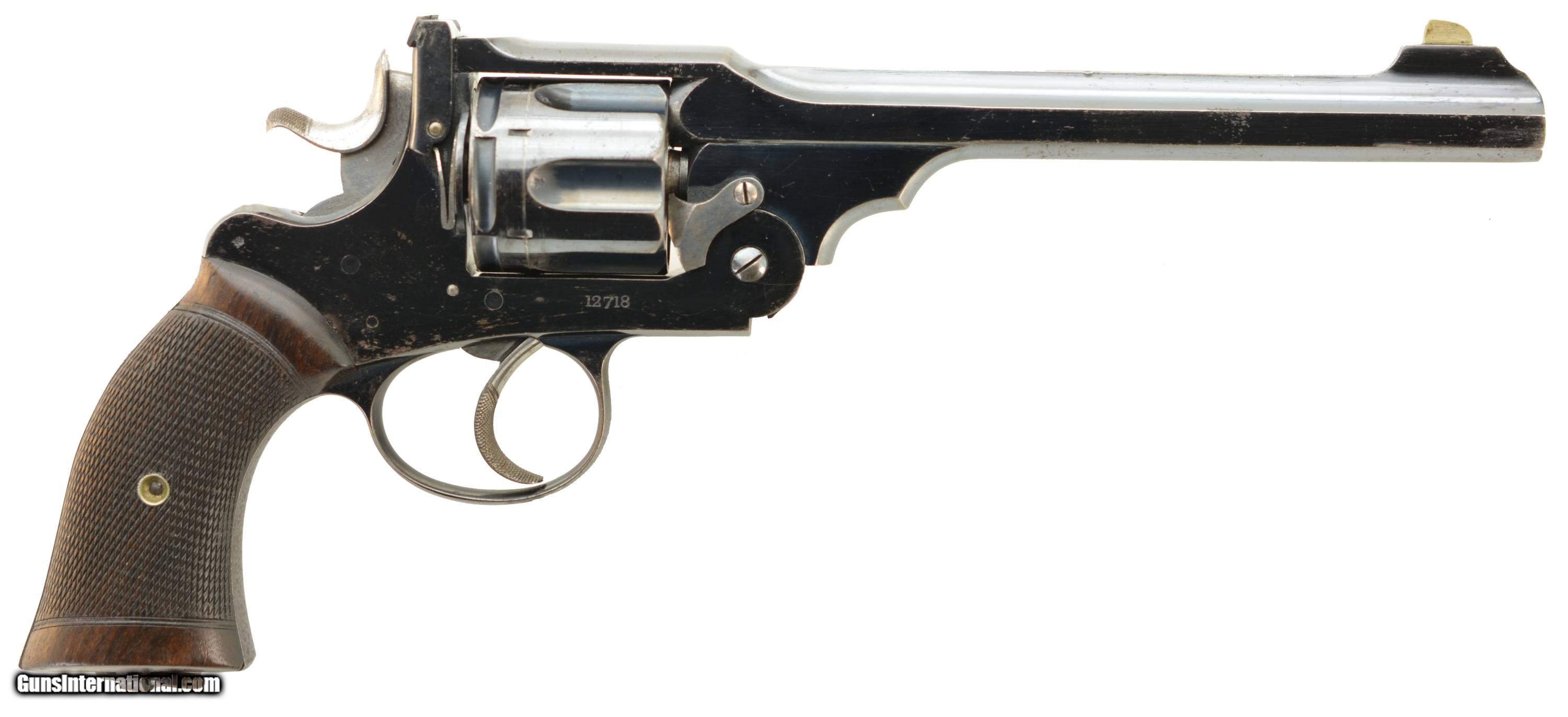 Description: Serial #12718, .450 CF, 7 1/2" barrel with a fine, bright bore that has traces of freckling within the grooves. This is a handsome revolver that matching numbers on the frame, barrel, cylinder, and the interior of the grip panels. The metal retains 90-95% of the original bright, lustrous blue finish with scattered minor handling marks, silvering on the raised edges and projections, as well as mottled gray on the gripstraps. Some mild freckling is also present on the sides of the frame towards the rear. The topstrap has Webley "'WG' TARGET MODEL" marking with the Webley & Scott "Winged Bullet" on the lower left side of the frame, and no retailer marking. The hammer, trigger, and cylinder retention stirrup have some traces of mild freckling on the bright metal while the thumb lever has most of the original blue remaining. The checkered walnut grips are in fine shape with a few minor bruises and handling marks on either panel. The lock-up is still solid and tight, and the action functions flawlessly. This is a lovely example of a desirable WG Target Model, and has an exceptionally high amount of the original finish remaining. It rates excellent overall, and would be a great addition to any collection of fine British firearms. FFL or C&R SOLD |