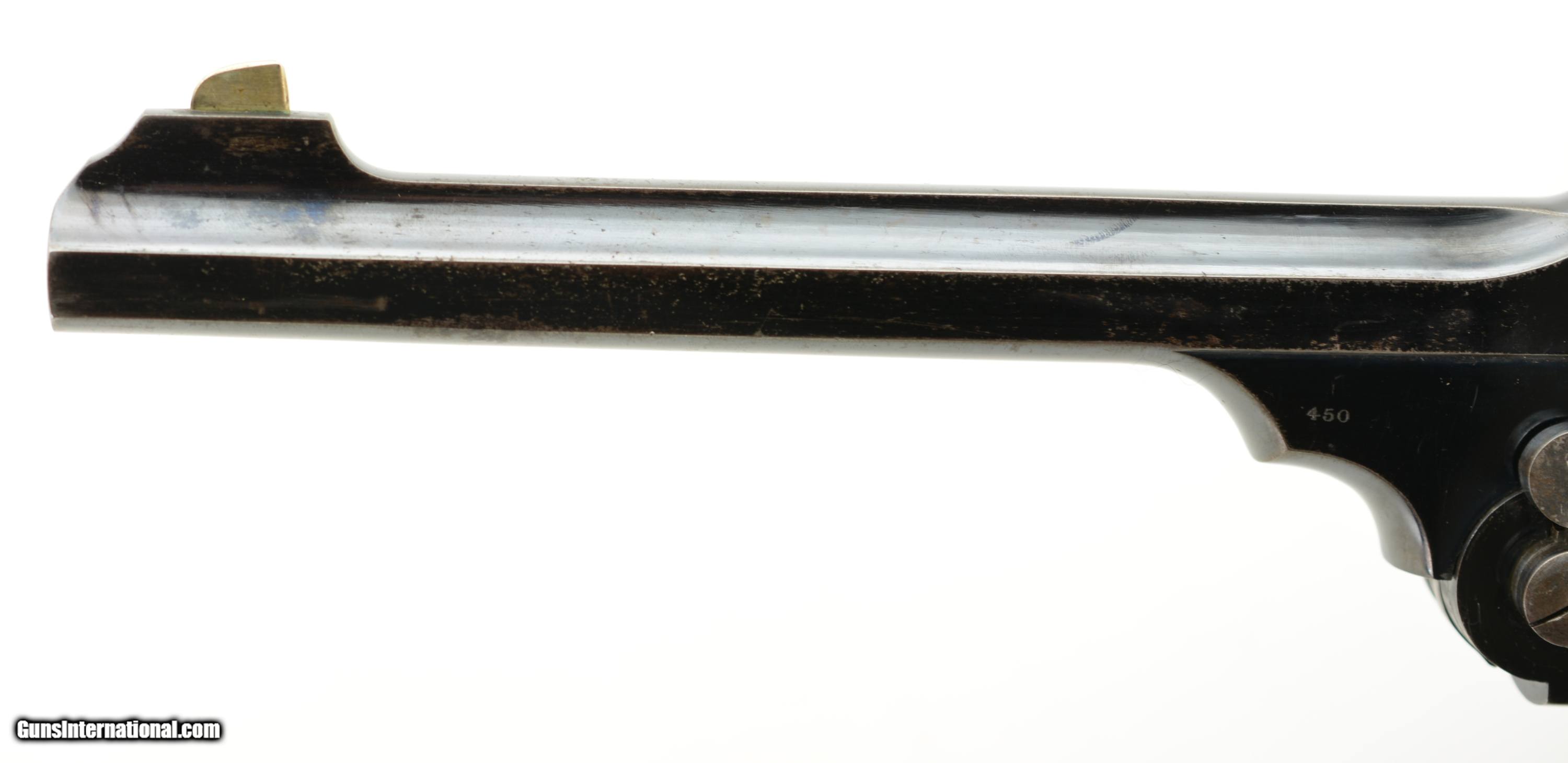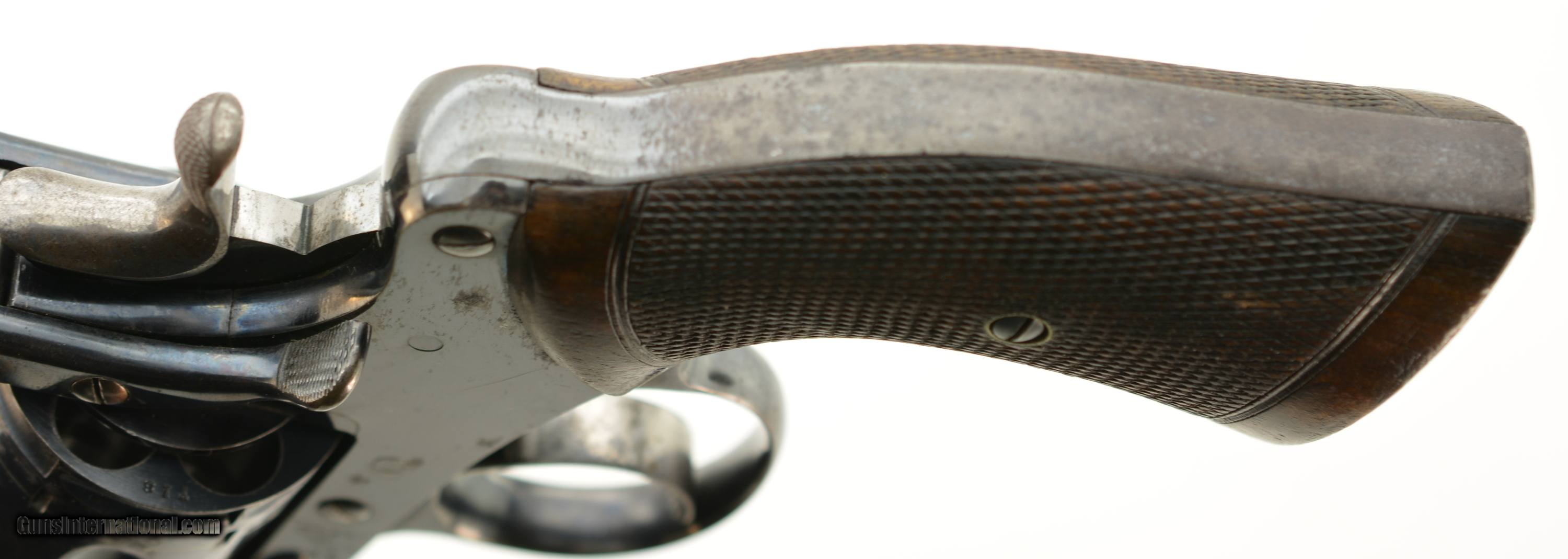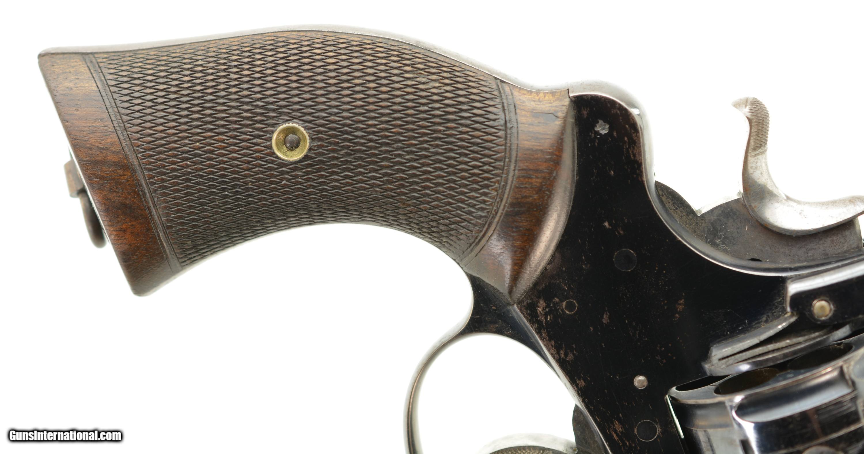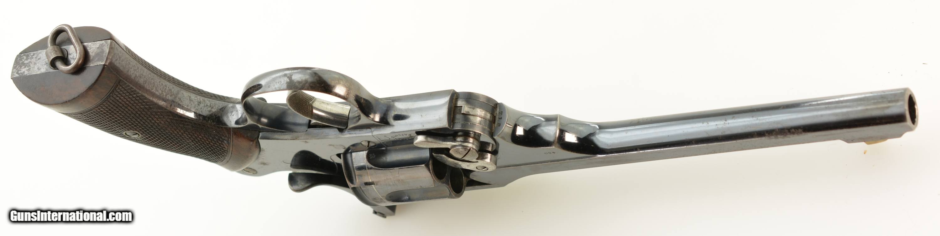 Description: Serial #12718, .450 CF, 7 1/2" barrel with a fine, bright bore that has traces of freckling within the grooves. This is a handsome revolver that matching numbers on the frame, barrel, cylinder, and the interior of the grip panels. The metal retains 90-95% of the original bright, lustrous blue finish with scattered minor handling marks, silvering on the raised edges and projections, as well as mottled gray on the gripstraps. Some mild freckling is also present on the sides of the frame towards the rear. The topstrap has Webley "'WG' TARGET MODEL" marking with the Webley & Scott "Winged Bullet" on the lower left side of the frame, and no retailer marking. The hammer, trigger, and cylinder retention stirrup have some traces of mild freckling on the bright metal while the thumb lever has most of the original blue remaining. The checkered walnut grips are in fine shape with a few minor bruises and handling marks on either panel. The lock-up is still solid and tight, and the action functions flawlessly. This is a lovely example of a desirable WG Target Model, and has an exceptionally high amount of the original finish remaining. It rates excellent overall, and would be a great addition to any collection of fine British firearms. FFL or C&R SOLD |