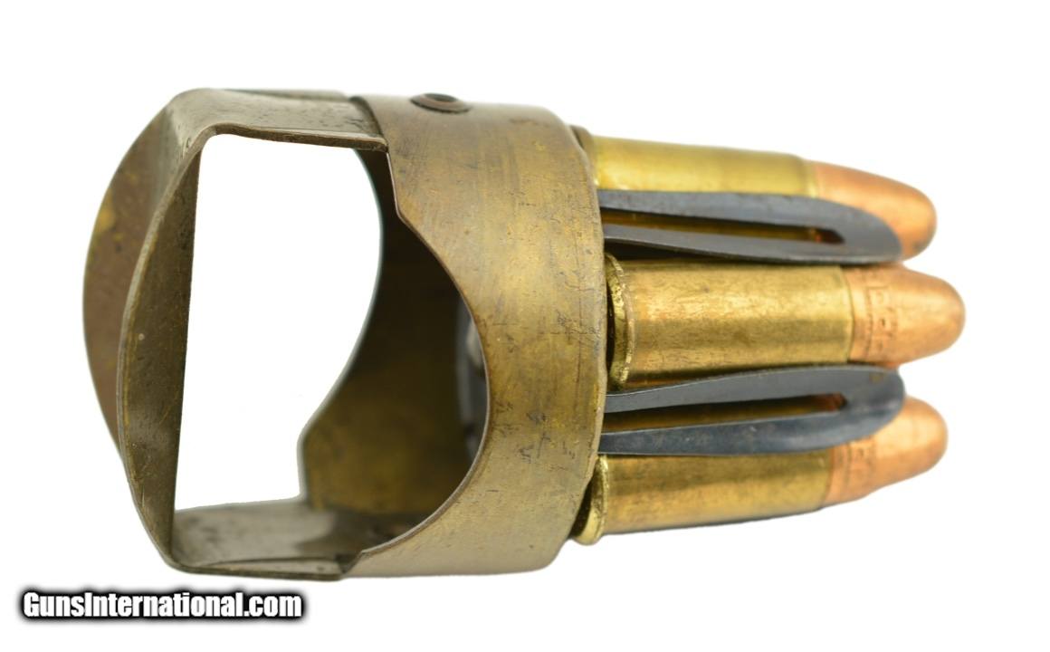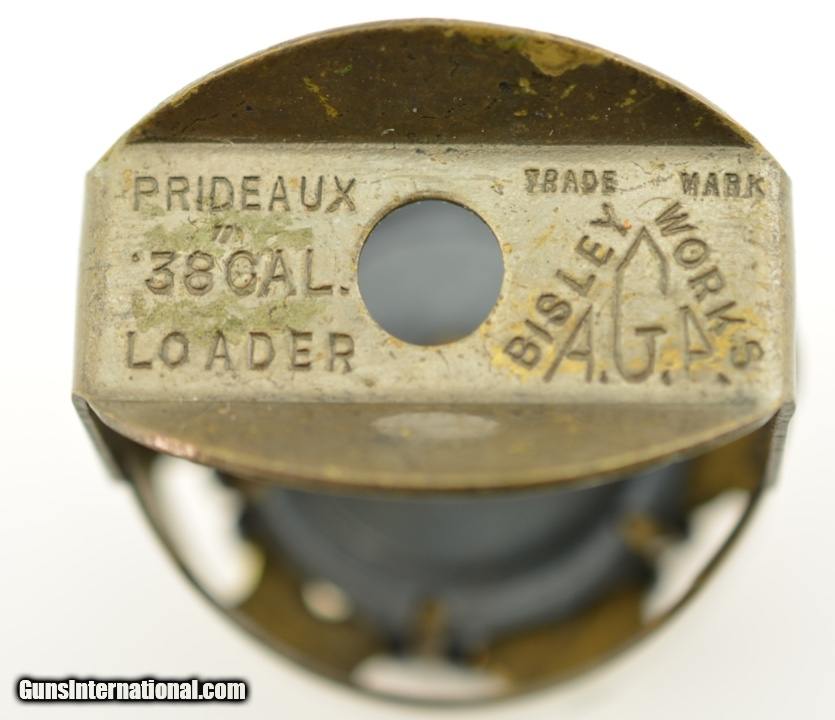Description: This is an original, sheet brass Prideaux revolver loader with spring steel prongs. The brass retains has an overall dull, yellow-ochre patina. The handle has rounded flanges and reads: "PRIDEAUX / .38 CAL. / LOADER" and "TRADE MARK / BISLEY WORKS / A.G.P.". The loader is in very good-fine condition overall, and would make an excellent accessory for a Webley .38 caliber break-open revolver. (Please note: cartridges are shown for reference purposes only and are not included.) SOLD |