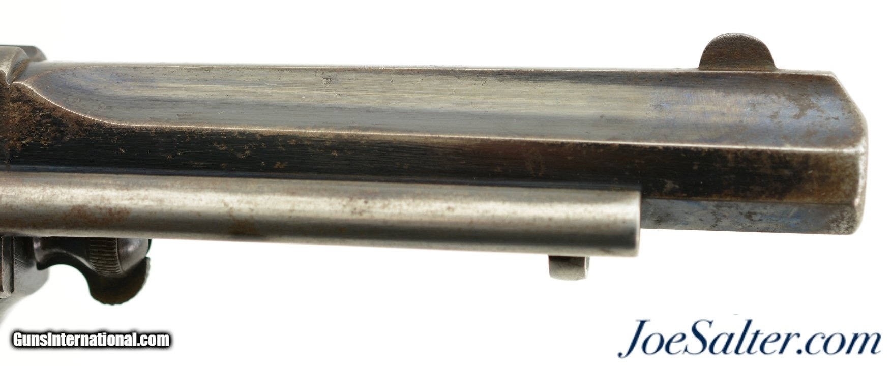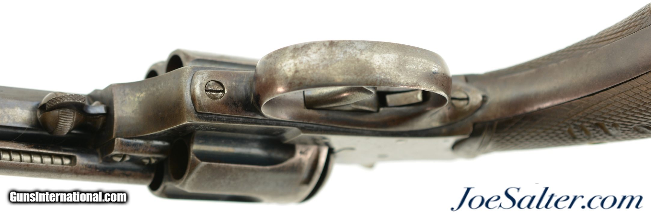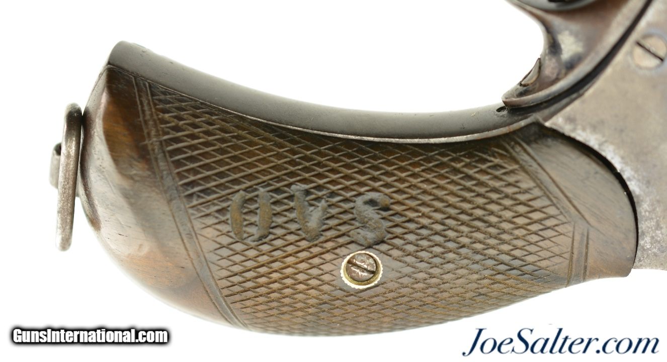 Description: Serial #4217, .450 Webley, 5 1/2" octagon barrel with a fine, bright bore that has mild freckling within the grooves. This is a very rare, state-purchased revolver, probably bought in very small numbers by the OVS (Orange Free State) prior to 1896, and has the Orange Free State "OVS" brand on both grip panels. The metal is in rather good shape, with 30-40% of the original blue remaining, mostly on protected areas, and the balance flaked to a mellow plum-brown patina mixing with pewter gray. Some bright fire bluing can still be seen on the trigger, hammer, and cylinder pin latch, with the balance turned to a freckled gray patina. The checkered walnut grips are in fine shape, with few handling marks or surface blemishes marring the original oil finish. The action still locks up tightly, and is fully functional. The revolver is housed in a period brown leather flap holster with shoulder strap, maker marked, "HAMILTON’S / COLONIAL / SADDLERY" on the cover. The leather is in very good-near fine condition, with only minor scuffs, and the strap, while flaked throughout, is still supple and fully serviceable. A previous owner’s name is neatly written in India ink on the body under the cover flap: "J. Harmse" (there are several OVS burghers who served in Boer Commandos by that name). The name is repeated on the cover, but more faintly, as is a second name, "John Bester." Bester’s name is underscored with two place names and a service occupation: "Christiana / Ladybrand / Despatch / Rider" (again, there are several Johannes Besters who served in the Boer Commandos, although the anglicized spelling might indicate a subsequent British owner). A further set of initials is carved into the leather on the back between the two D-rings, "DH." This very revolver and holster are pictured on pages 268 & 269 of "Carvings From The Veldt & Part Three / Rifle Carvings From The Anglo & Boer War 1899 - 1902" by David C. George (2016). Unlike the ZAR, the OVS does not seem to have made any official handgun purchases from any particular manufacturer, but rather procured limited numbers of handguns from local or regional retailers. That said, "OVS" branded Webley New Model Army No. 5 Express revolvers like this one are known, and this example is in fine condition overall. This is a truly rare Boer War handgun, and would make a fantastic addition to any collection. Antique; Antique: Yes Price: $7,995.00 Contact Seller |