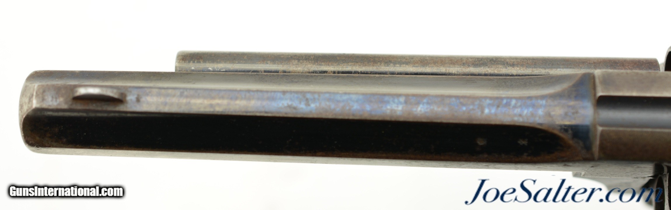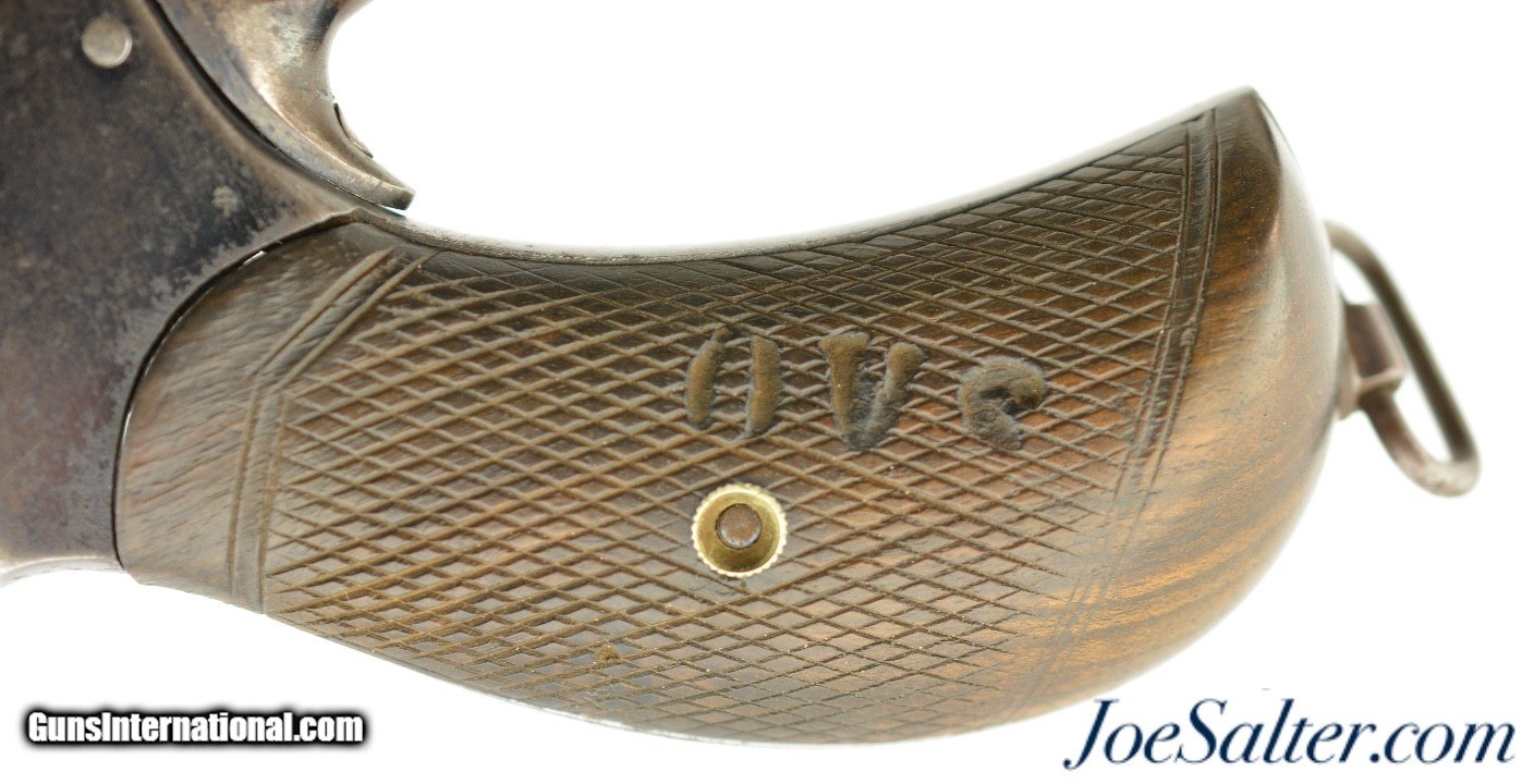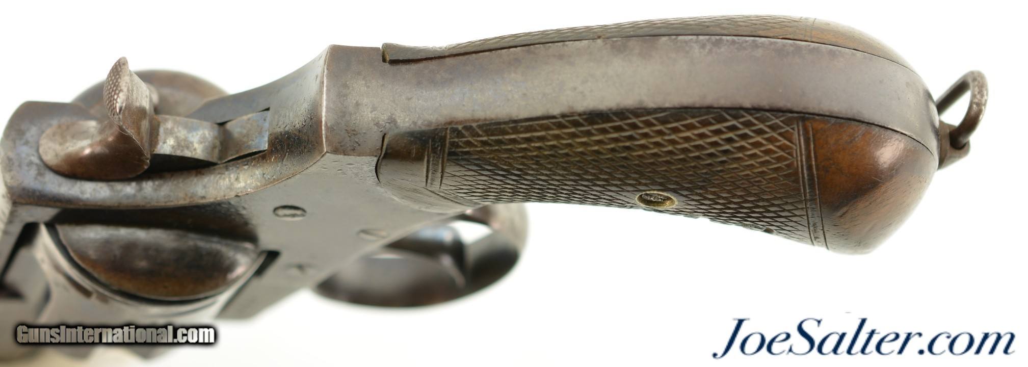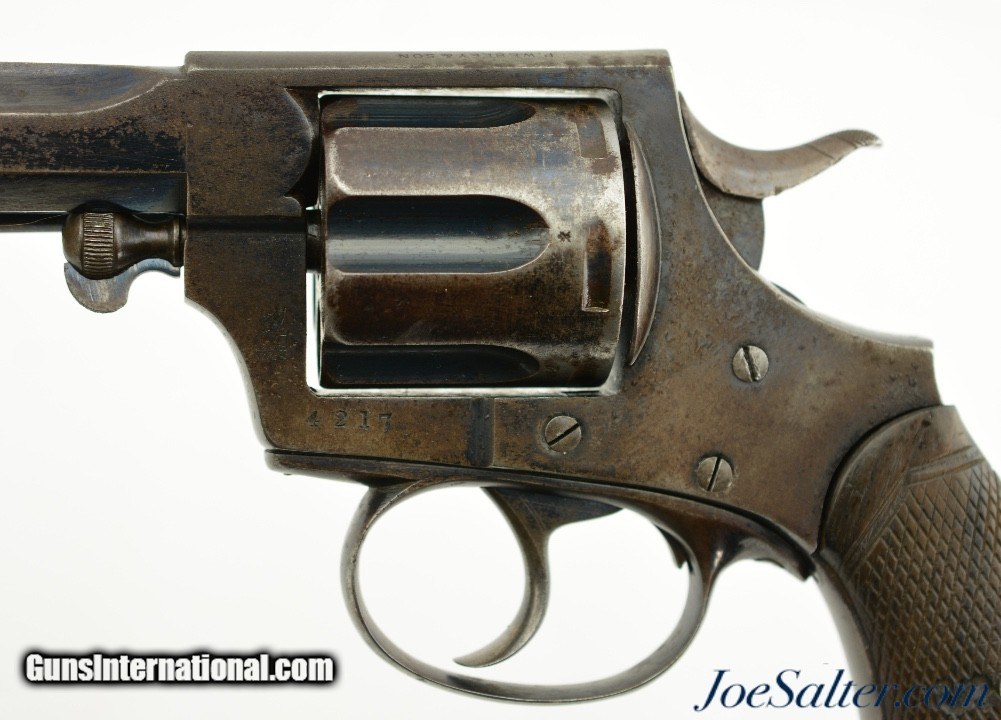 Description: Serial #4217, .450 Webley, 5 1/2" octagon barrel with a fine, bright bore that has mild freckling within the grooves. This is a very rare, state-purchased revolver, probably bought in very small numbers by the OVS (Orange Free State) prior to 1896, and has the Orange Free State "OVS" brand on both grip panels. The metal is in rather good shape, with 30-40% of the original blue remaining, mostly on protected areas, and the balance flaked to a mellow plum-brown patina mixing with pewter gray. Some bright fire bluing can still be seen on the trigger, hammer, and cylinder pin latch, with the balance turned to a freckled gray patina. The checkered walnut grips are in fine shape, with few handling marks or surface blemishes marring the original oil finish. The action still locks up tightly, and is fully functional. The revolver is housed in a period brown leather flap holster with shoulder strap, maker marked, "HAMILTON’S / COLONIAL / SADDLERY" on the cover. The leather is in very good-near fine condition, with only minor scuffs, and the strap, while flaked throughout, is still supple and fully serviceable. A previous owner’s name is neatly written in India ink on the body under the cover flap: "J. Harmse" (there are several OVS burghers who served in Boer Commandos by that name). The name is repeated on the cover, but more faintly, as is a second name, "John Bester." Bester’s name is underscored with two place names and a service occupation: "Christiana / Ladybrand / Despatch / Rider" (again, there are several Johannes Besters who served in the Boer Commandos, although the anglicized spelling might indicate a subsequent British owner). A further set of initials is carved into the leather on the back between the two D-rings, "DH." This very revolver and holster are pictured on pages 268 & 269 of "Carvings From The Veldt & Part Three / Rifle Carvings From The Anglo & Boer War 1899 - 1902" by David C. George (2016). Unlike the ZAR, the OVS does not seem to have made any official handgun purchases from any particular manufacturer, but rather procured limited numbers of handguns from local or regional retailers. That said, "OVS" branded Webley New Model Army No. 5 Express revolvers like this one are known, and this example is in fine condition overall. This is a truly rare Boer War handgun, and would make a fantastic addition to any collection. Antique; Antique: Yes Price: $5,995.00 Contact Seller |