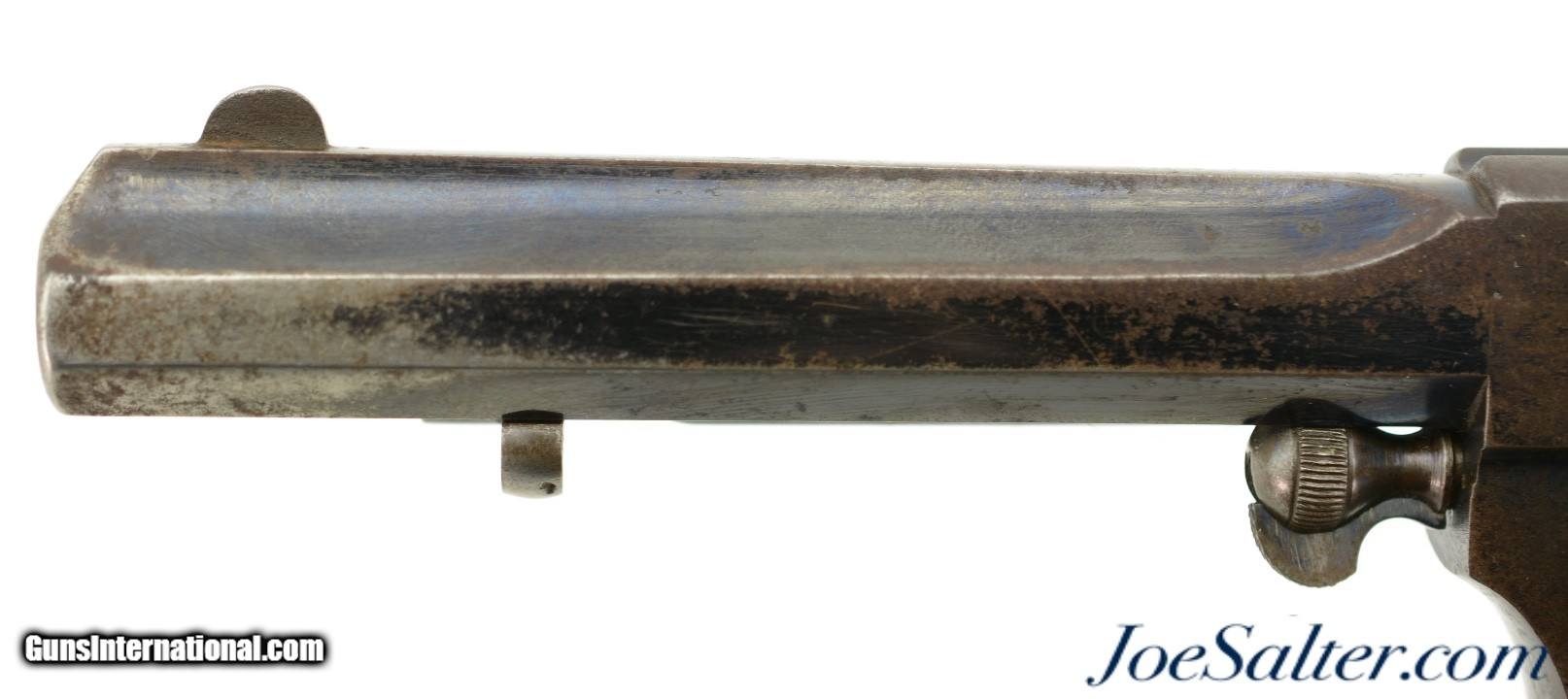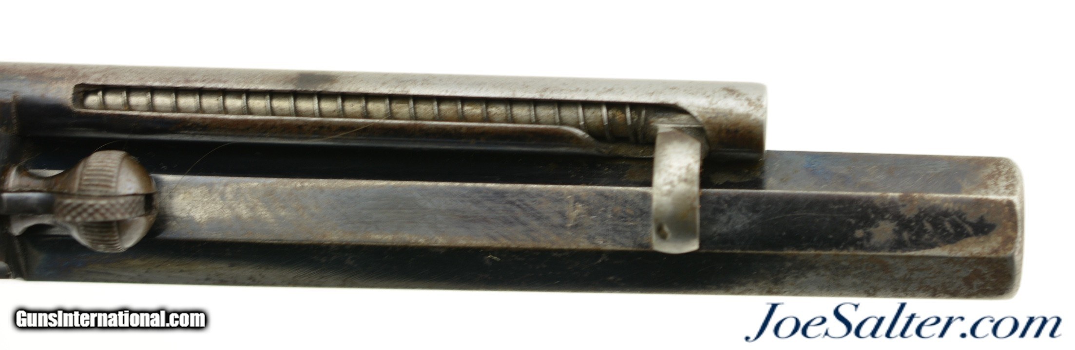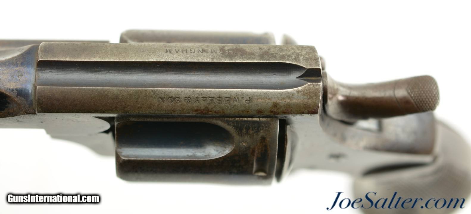 Description: Serial #4217, .450 Webley, 5 1/2" octagon barrel with a fine, bright bore that has mild freckling within the grooves. This is a very rare, state-purchased revolver, probably bought in very small numbers by the OVS (Orange Free State) prior to 1896, and has the Orange Free State "OVS" brand on both grip panels. The metal is in rather good shape, with 30-40% of the original blue remaining, mostly on protected areas, and the balance flaked to a mellow plum-brown patina mixing with pewter gray. Some bright fire bluing can still be seen on the trigger, hammer, and cylinder pin latch, with the balance turned to a freckled gray patina. The checkered walnut grips are in fine shape, with few handling marks or surface blemishes marring the original oil finish. The action still locks up tightly, and is fully functional. The revolver is housed in a period brown leather flap holster with shoulder strap, maker marked, "HAMILTON’S / COLONIAL / SADDLERY" on the cover. The leather is in very good-near fine condition, with only minor scuffs, and the strap, while flaked throughout, is still supple and fully serviceable. A previous owner’s name is neatly written in India ink on the body under the cover flap: "J. Harmse" (there are several OVS burghers who served in Boer Commandos by that name). The name is repeated on the cover, but more faintly, as is a second name, "John Bester." Bester’s name is underscored with two place names and a service occupation: "Christiana / Ladybrand / Despatch / Rider" (again, there are several Johannes Besters who served in the Boer Commandos, although the anglicized spelling might indicate a subsequent British owner). A further set of initials is carved into the leather on the back between the two D-rings, "DH." This very revolver and holster are pictured on pages 268 & 269 of "Carvings From The Veldt & Part Three / Rifle Carvings From The Anglo & Boer War 1899 - 1902" by David C. George (2016). Unlike the ZAR, the OVS does not seem to have made any official handgun purchases from any particular manufacturer, but rather procured limited numbers of handguns from local or regional retailers. That said, "OVS" branded Webley New Model Army No. 5 Express revolvers like this one are known, and this example is in fine condition overall. This is a truly rare Boer War handgun, and would make a fantastic addition to any collection. Antique; Antique: Yes Price: $5,995.00 Contact Seller |
