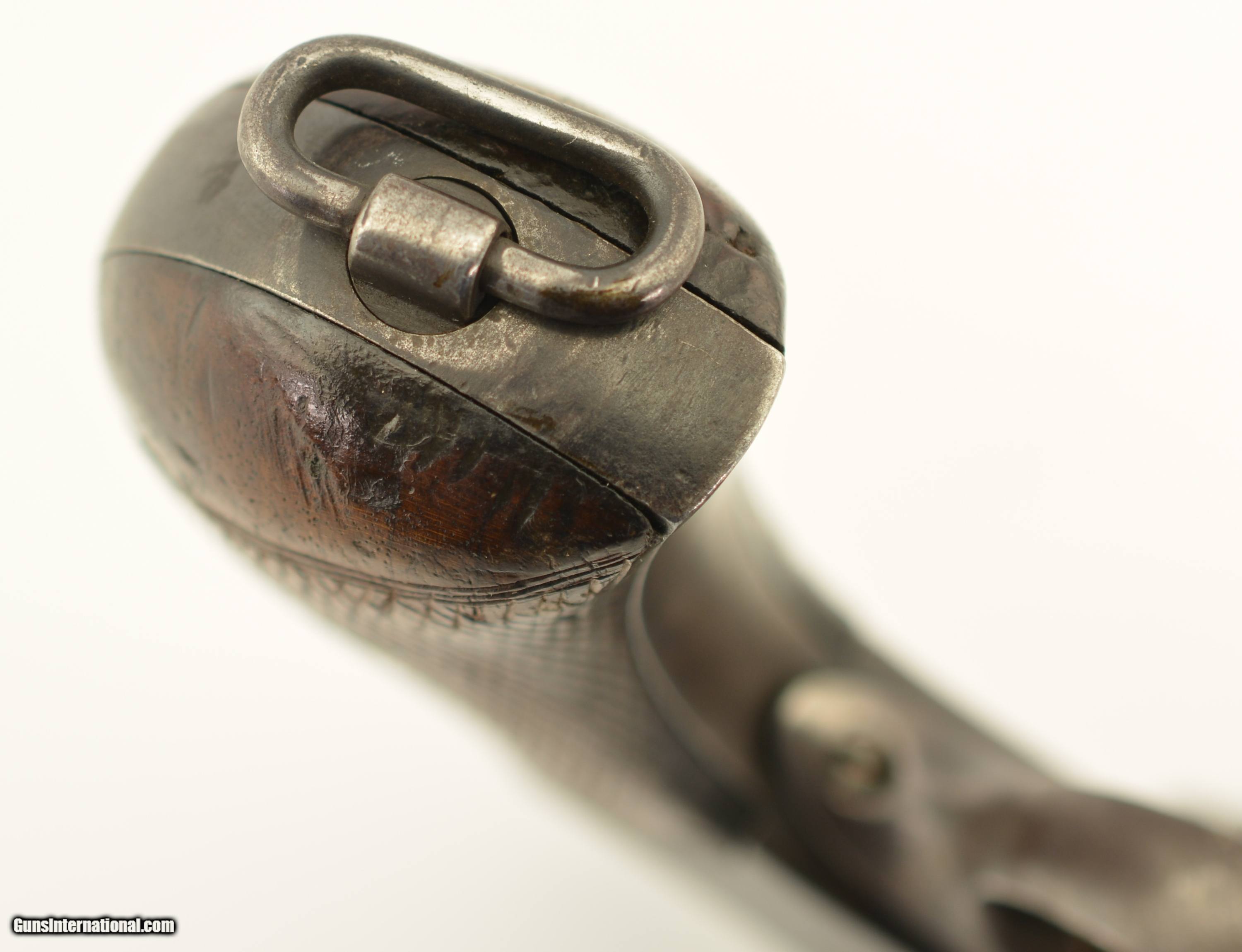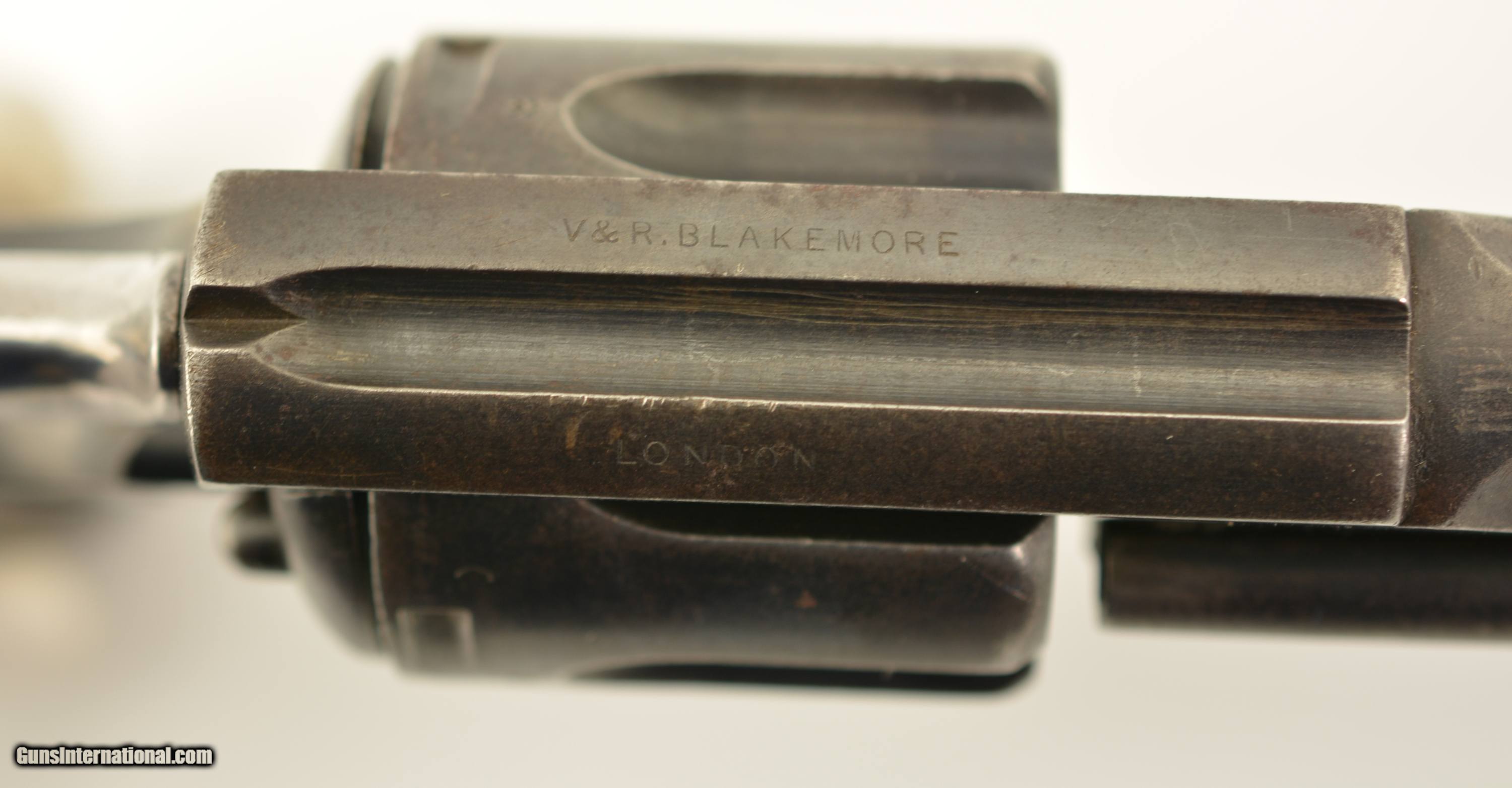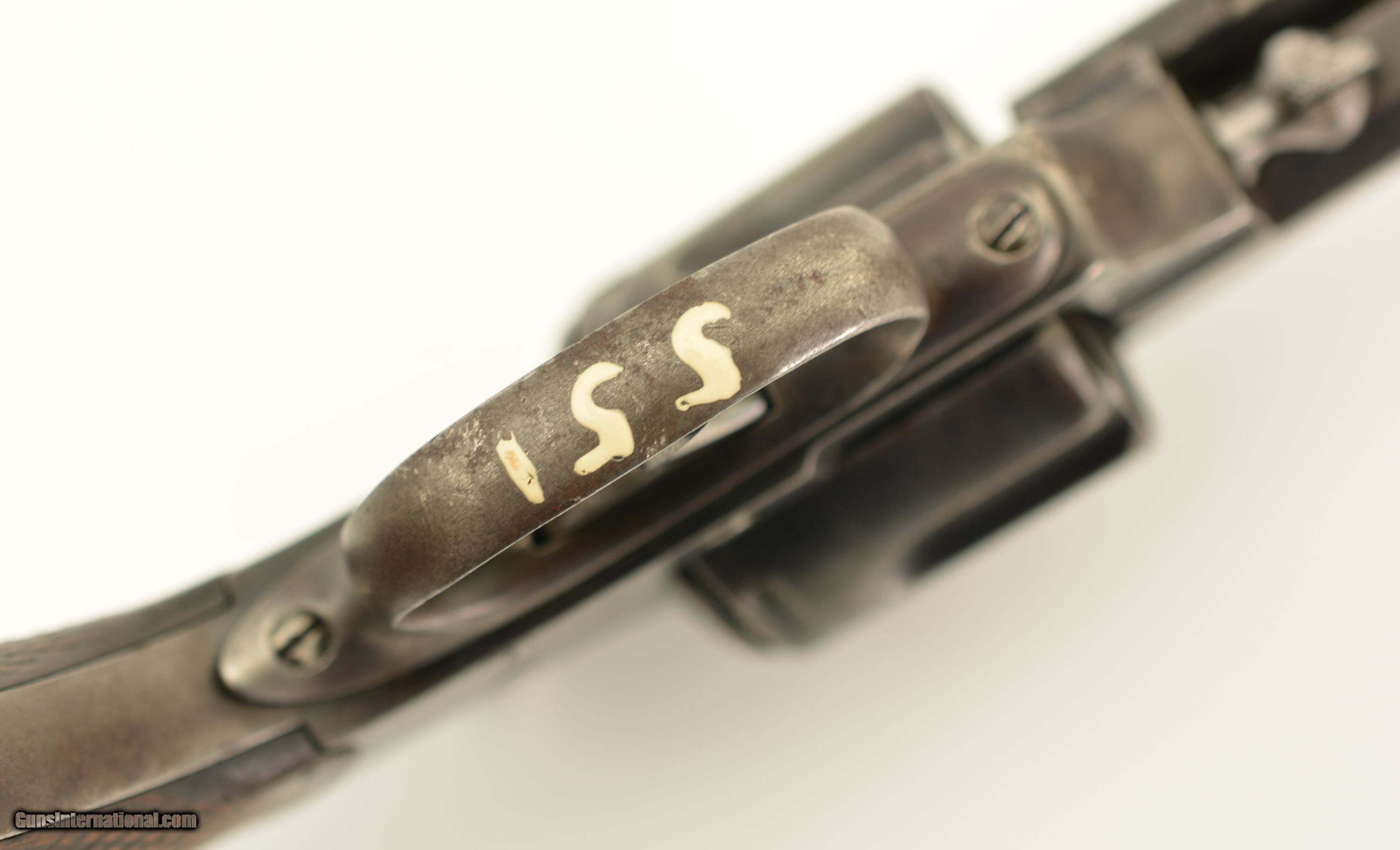 Description: Serial #95524, .476 CF, 5 1/2" barrel with a fine, bright bore that has some mild freckling within the grooves. This is a great looking revolver that has retained 90-95% of an armory reapplied blue finish with even freckling along the barrel, and silvering on the high and exposed edges. The topstrap is retailer marked: "V&R BLAKEMORE / LONDON", with a further Webely & Scott "Winged Bullet" logo on the left side of the frame. The right side of the frame has "CP / 1 / 493" (Cape Police / 1st Division [King William's Town] / gun #493). South African property marks are present on the frame at the front and rear (two opposed "U (Broad Arrow)", and a further Lesotho Mounted Police property stamp is present on the underside of the barrel. The checkered walnut grips are in very good shape, with minor wear and handling marks throughout on both panels. The action lock-up is tight, and the mechanism is fully functional. This very revolver is pictured on page 244 of "Webley Solid Frame Revolvers - Models RIC, MP, and No. 5" by Black, Davis, and Michaud; (2010). This is a comprehensively marked South African police revolver, and is in fine overall condition. Antique SOLD Antique: Yes Manufacturer: Webley Model: No. 5 Serial Number: 95524 Caliber Info: .476 Gauge Info: .476 |