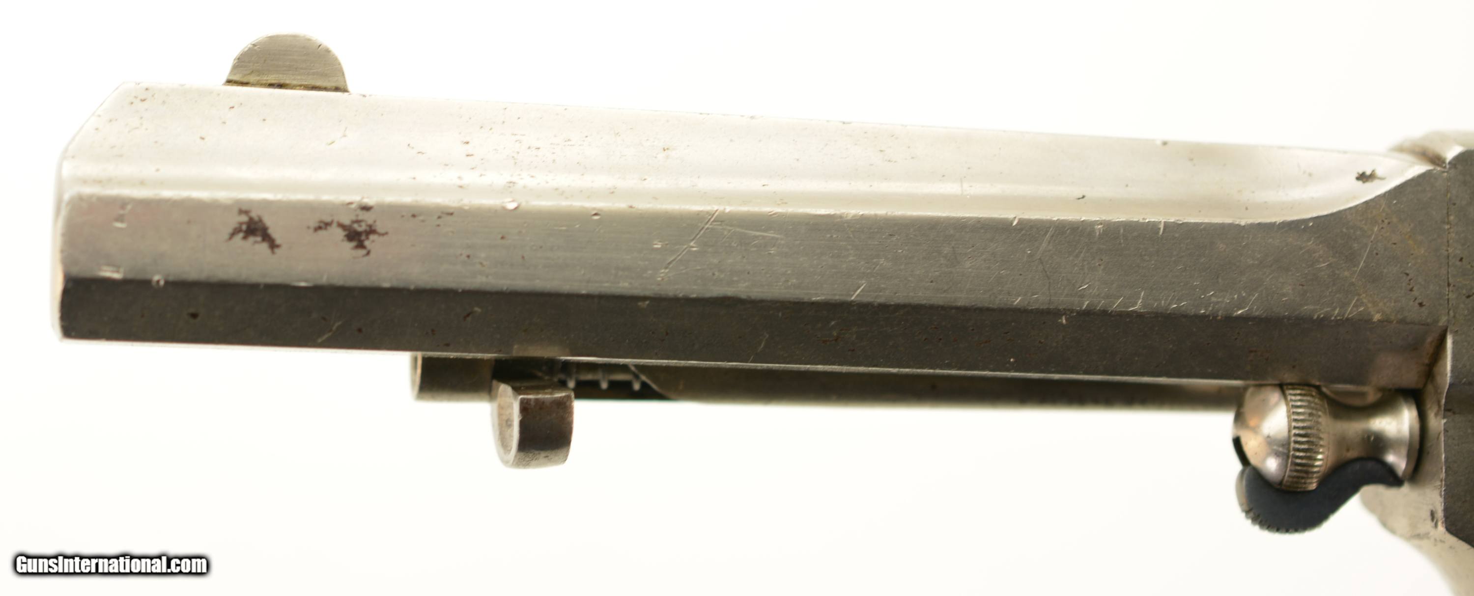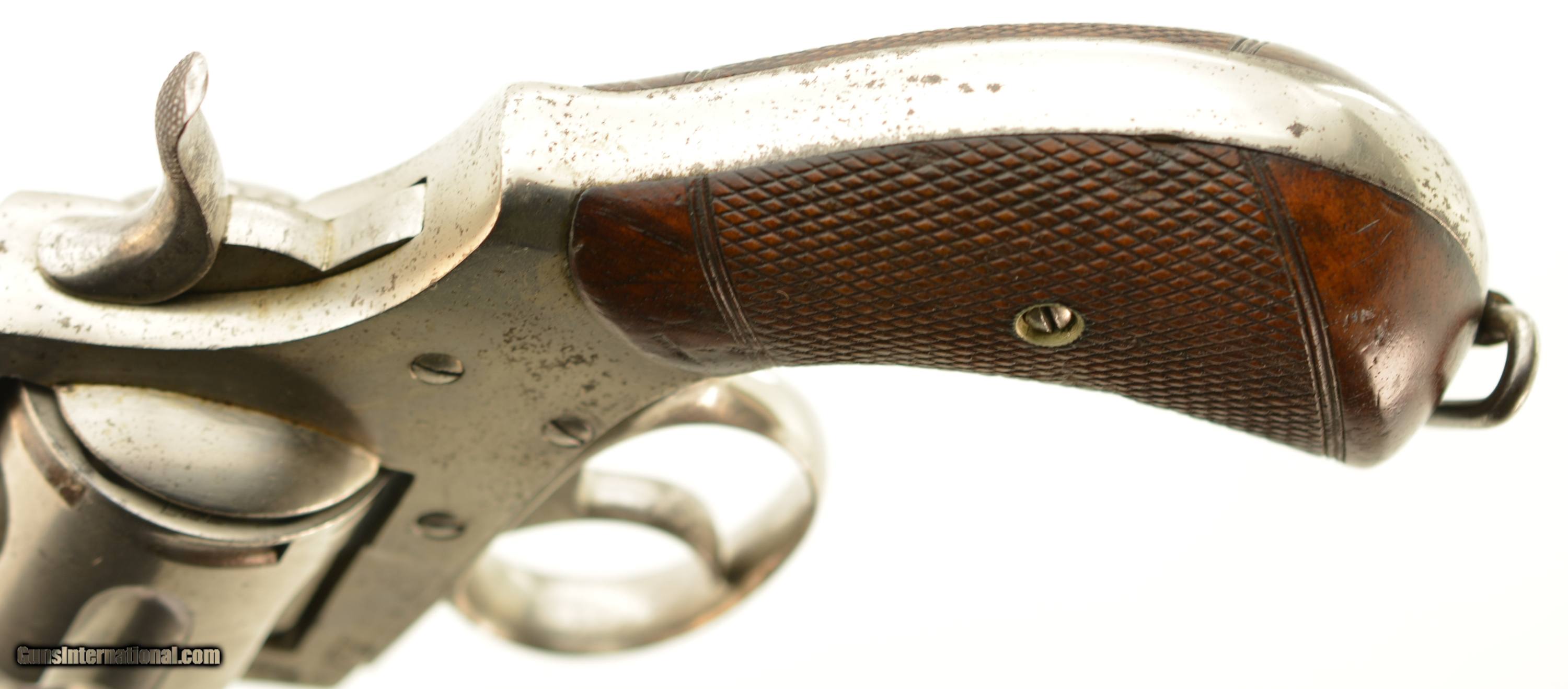 Description: Serial #32777, .455/.476/.45 Long, 5 ½" octagon barrel with a very good, bright bore that has spots of darker freckling and pitting along its length. This is a handsome revolver, with “ARMY & NAVY CSL / EXPRESS" retailer marking on the topstrap, and the Webley “Winged Bullet" on the left side of the frame. The metal retains 85-90% of the original bright nickel finish, with some very mild flaking in spots, and some thin brown freckling throughout. The cylinder is matching numbered, and the cylinder pin latch still has bright fire blue remaining. The checkered walnut bird’s head grips are in very good shape with minor handling marks and blemishes throughout, and a single large bruise on the left grip panel. This very revolver is illustrated on pg. 241 of "Webley Solid Frame Revolvers - Models RIC, MP, and No. 5" by Black, Davis, and Michaud; (2010). It is a fine-near excellent example of a solid frame Webley that is very seldom seen in America. Antique SOLD Antique: Yes Manufacturer: Webley Model: No.5 New Model Caliber Info: .455 Gauge Info: .455 |