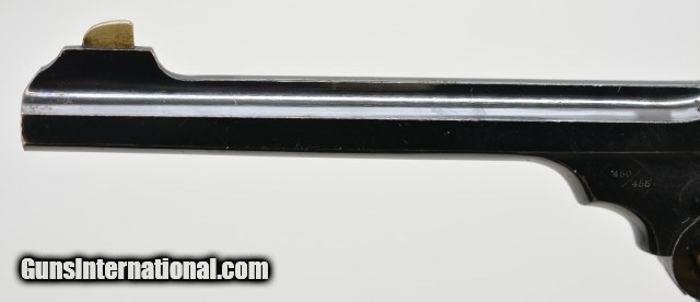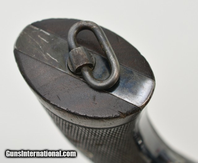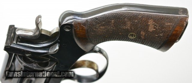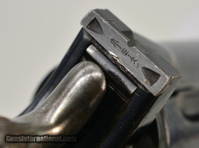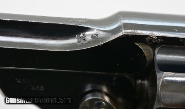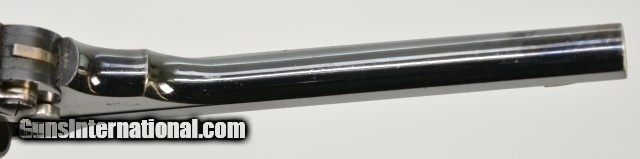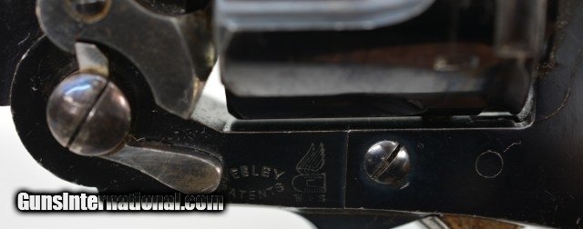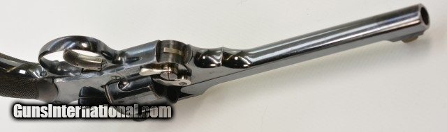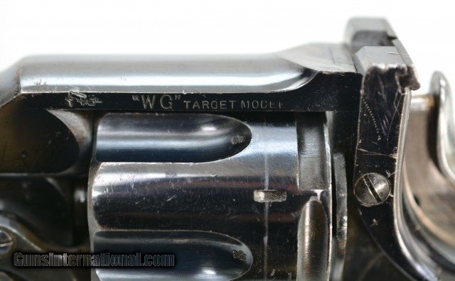 Description: Serial #19976, .450/.455, 7 1/2" barrel with a fine, bright bore that has traces of freckling within the grooves at the breech. This is a handsome revolver that has matching serial numbers throughout, including the grip panels, and retains 92-95% of the original bright, lustrous blue finish with numerous minor handling marks, blemishes, and silvered fading along the raised edges and projections. Some specks of mild freckling are also present on the gripstraps. The topstrap has the Webley "'WG' TARGET MODEL" marking with the Webley & Scott "Winged Bullet" on the lower left side of the frame, and a British military "(Broad Arrow) / (crown) / U6 / F" acceptance proof just ahead of the model marking. The hammer, knurled trigger, and cylinder retention stirrup have some traces of mild freckling on the bright metal while the thumb lever has most of the original blue remaining. The checkered walnut grips are in very good shape with numerous minor bruises and handling marks on either panel. The lock-up is still solid and tight, and the action functions flawlessly. This is the only military marked marked WG Target we have ever seen, and it may well be the only one in the United States. This is a lovely example of a desirable WG Target Model, that has an exceptionally high amount of the original finish remaining, and has extremely rare British military markings. It rates fine-excellent overall, and would be a great addition to any collection of fine British firearms. FFL or C&R SOLD |