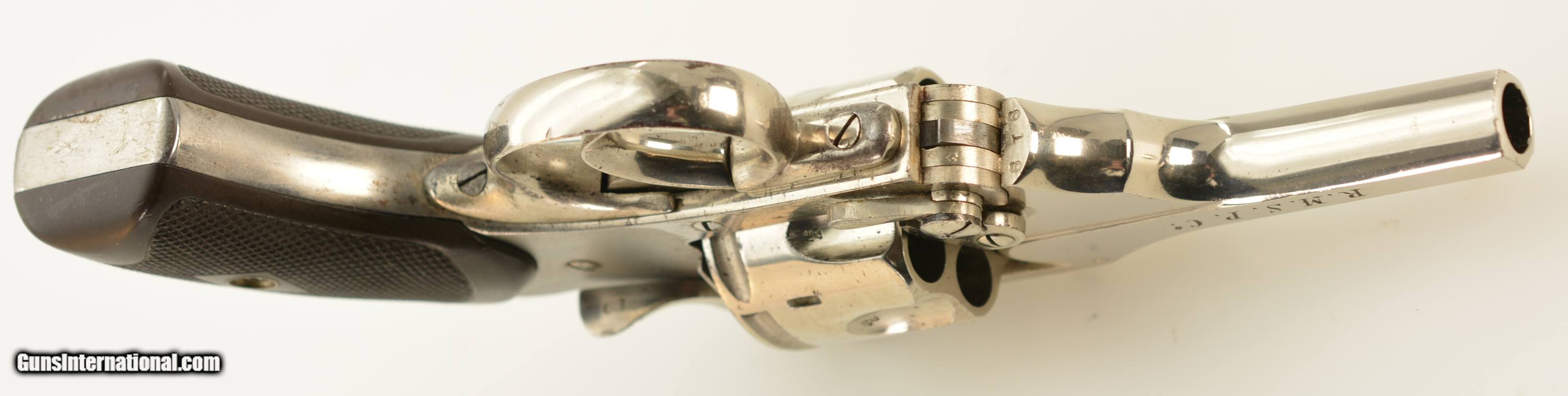 Description: Serial #19919, .380 Revolver, 3" barrel with an excellent, bright bore. This is a handy little small frame revolver that has matching numbers on the frame, cylinder, and barrel and retains 97-98% of the original nickel finish with scattered scratches and minor handling marks, as well as spots of dark freckling on the cylinder. The left barrel flat is engraved: "R.M.S.P. Co." in block letters (the Royal Mail Steam Packet Co.). The checkered Vulcanite grips are in fine condition with only some minor wear and flattening of the points on either panel. The barrel lock-up is tight and the mechanism is fully functional. The Royal Mail Steam Packet Co. was founded in 1839 as a passenger and cargo line, with a contract subsidy to carry mail to and from overseas locations. The line continued operations under that name until 1930, when it collapsed due to a bad financial decisions that caused a scandal involving the line's chairman, Owen Philipps, 1st Baron Kylsant, which eventually led to his serving ten months at Wormwood Scrubs prison. This is an excellent example of a desirable Mk. III .38 revolver, purchased and used by one of the biggest shipping and passenger lines of the Victorian era. FFL or C&R SOLD Curio/Relic: Yes Manufacturer: Webley Model: Mk. III Serial Number: 19919 Caliber Info: .380 Gauge Info: .380 |