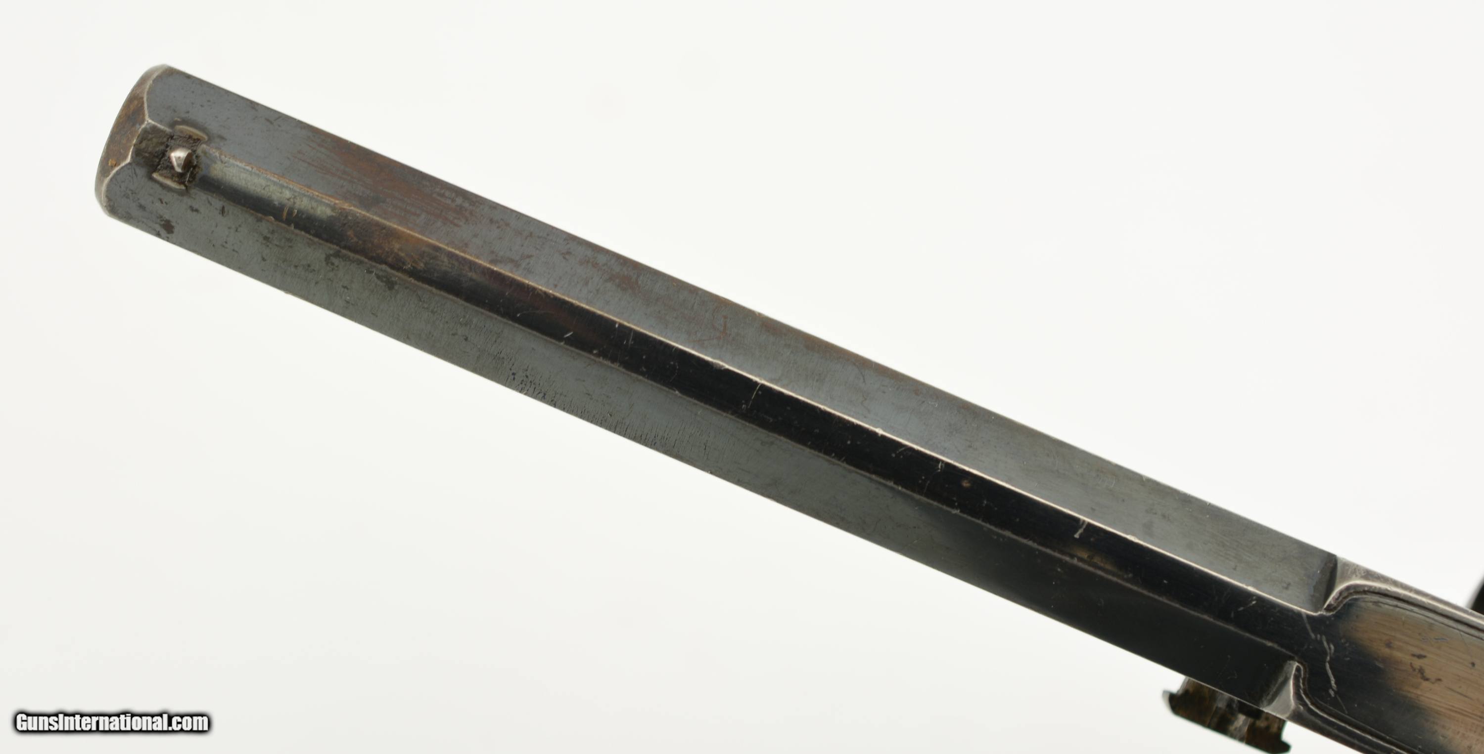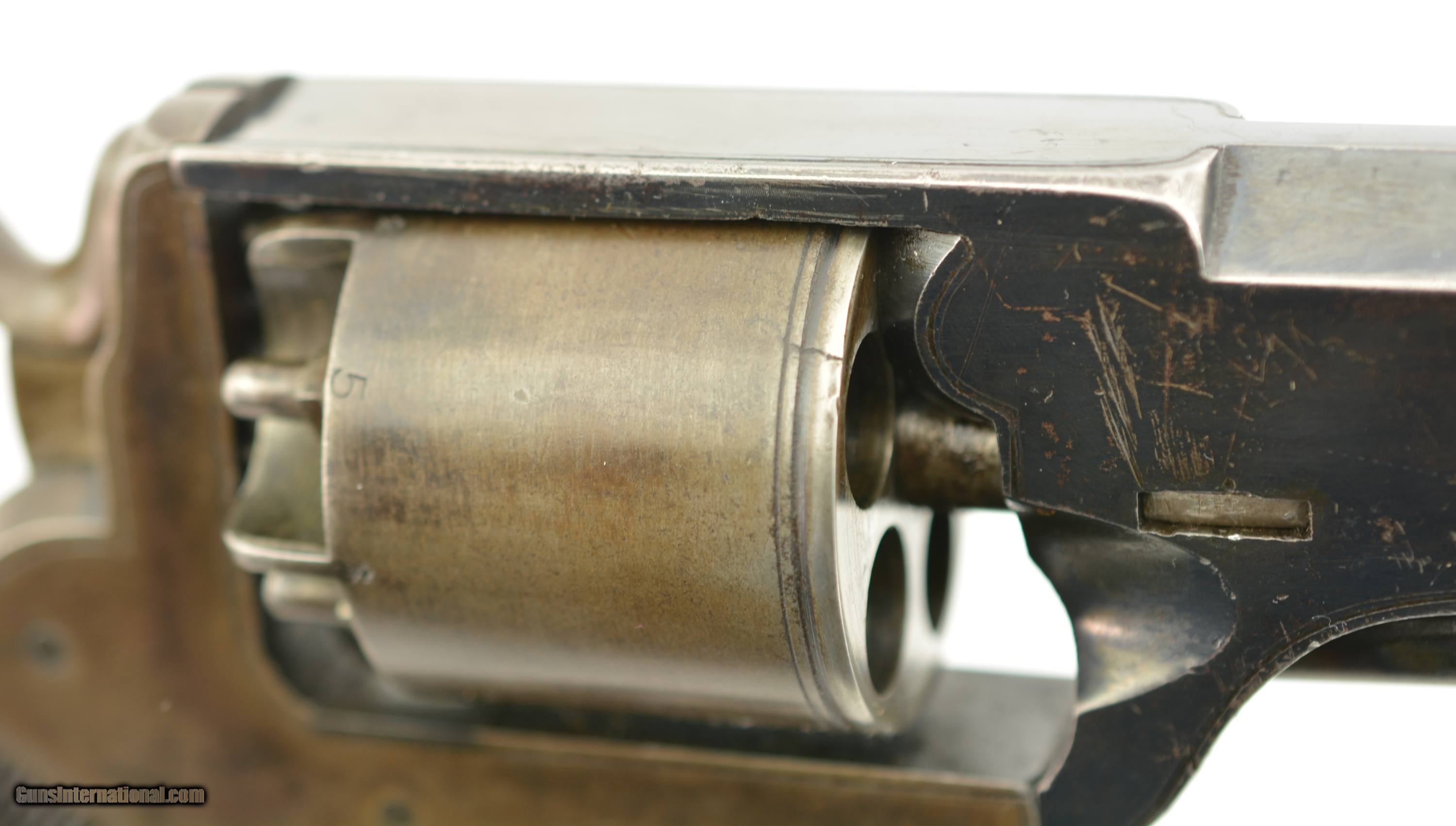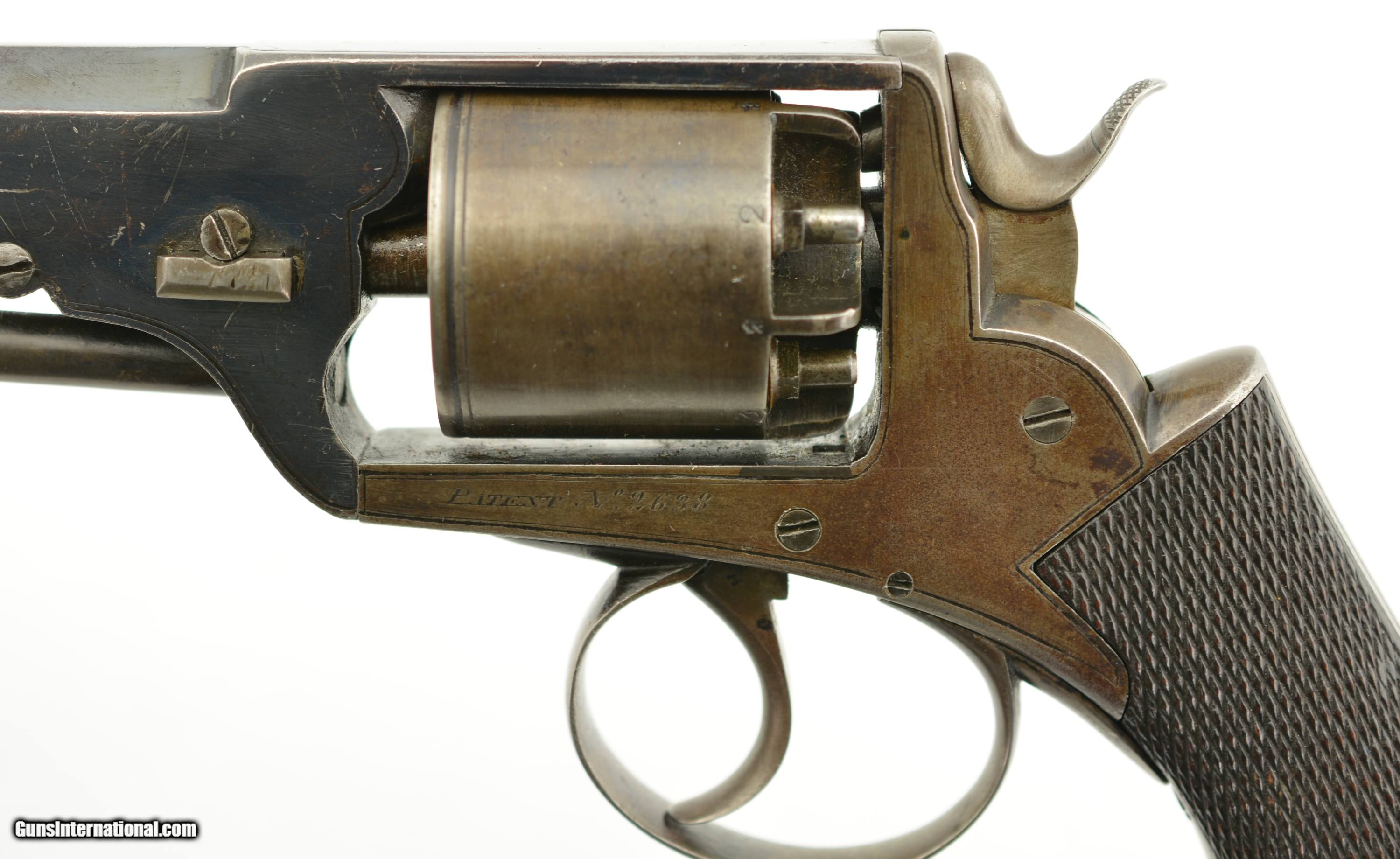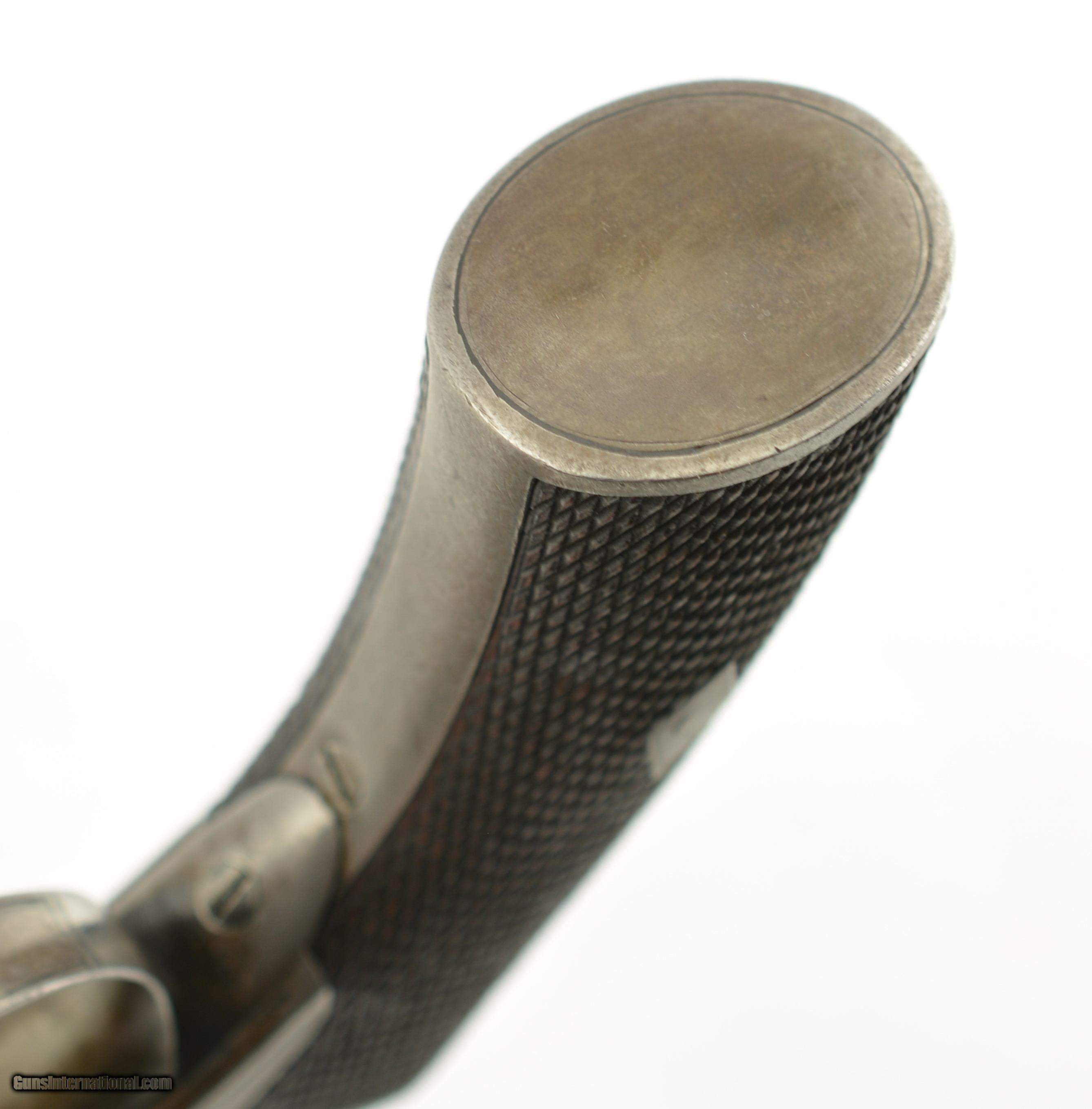 Description: Serial #2638, .450 Cal., 6 1/4" octagon barrel with a very good bore that has mild freckling within the grooves. This is a rarely seen Webley wedge-frame revolver, so named because of the two-piece frame which is locked in place via a Colt-style wedge through the cylinder arbor. The topstrap/barrel retains 95-97% of the original bright blue finish, while the loading lever retains a commensurate amount of the original color case-hardening. The frame, has an overall plum-brown patina, but still has traces of original blue on the underside around the trigger guard. The cylinder has been lightly cleaned, and has a somewhat grayer patina than the frame. Additionally, there are some short stress fractures on the cylinder face around the edge (both at and between the chamber mouths). The checkered walnut grips are in fine shape with some minor flattening of the points, and a few small handling marks. There are no retailer or maker marks, but extensive English proofs are present. This is a fine example of a British Wedge-Frame, and would make a wonderful addition to any collection. Antique SOLD Antique: Yes Manufacturer: Webley Model: Wedge Frame Serial Number: 2638 Caliber Info: .450 Gauge Info: .450 |