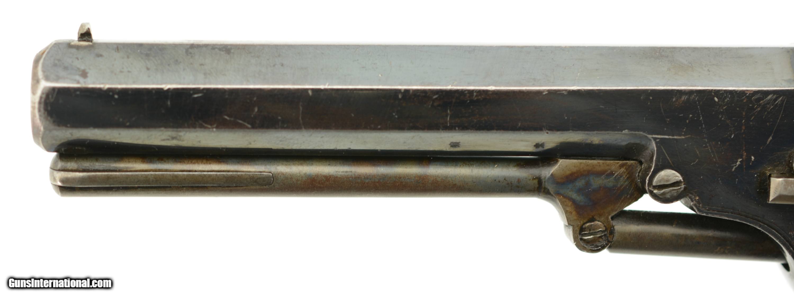 Description: Serial #2638, .450 Cal., 6 1/4" octagon barrel with a very good bore that has mild freckling within the grooves. This is a rarely seen Webley wedge-frame revolver, so named because of the two-piece frame which is locked in place via a Colt-style wedge through the cylinder arbor. The topstrap/barrel retains 95-97% of the original bright blue finish, while the loading lever retains a commensurate amount of the original color case-hardening. The frame, has an overall plum-brown patina, but still has traces of original blue on the underside around the trigger guard. The cylinder has been lightly cleaned, and has a somewhat grayer patina than the frame. Additionally, there are some short stress fractures on the cylinder face around the edge (both at and between the chamber mouths). The checkered walnut grips are in fine shape with some minor flattening of the points, and a few small handling marks. There are no retailer or maker marks, but extensive English proofs are present. This is a fine example of a British Wedge-Frame, and would make a wonderful addition to any collection. Antique SOLD Antique: Yes Manufacturer: Webley Model: Wedge Frame Serial Number: 2638 Caliber Info: .450 Gauge Info: .450 |