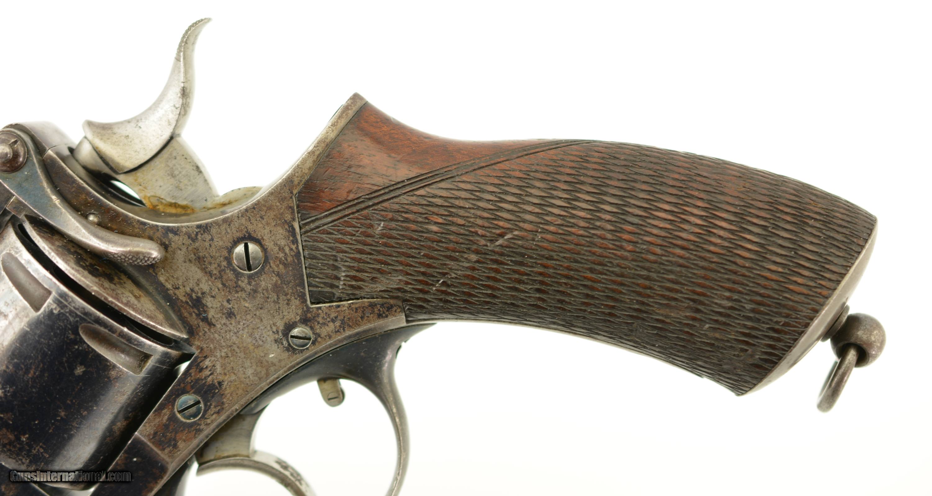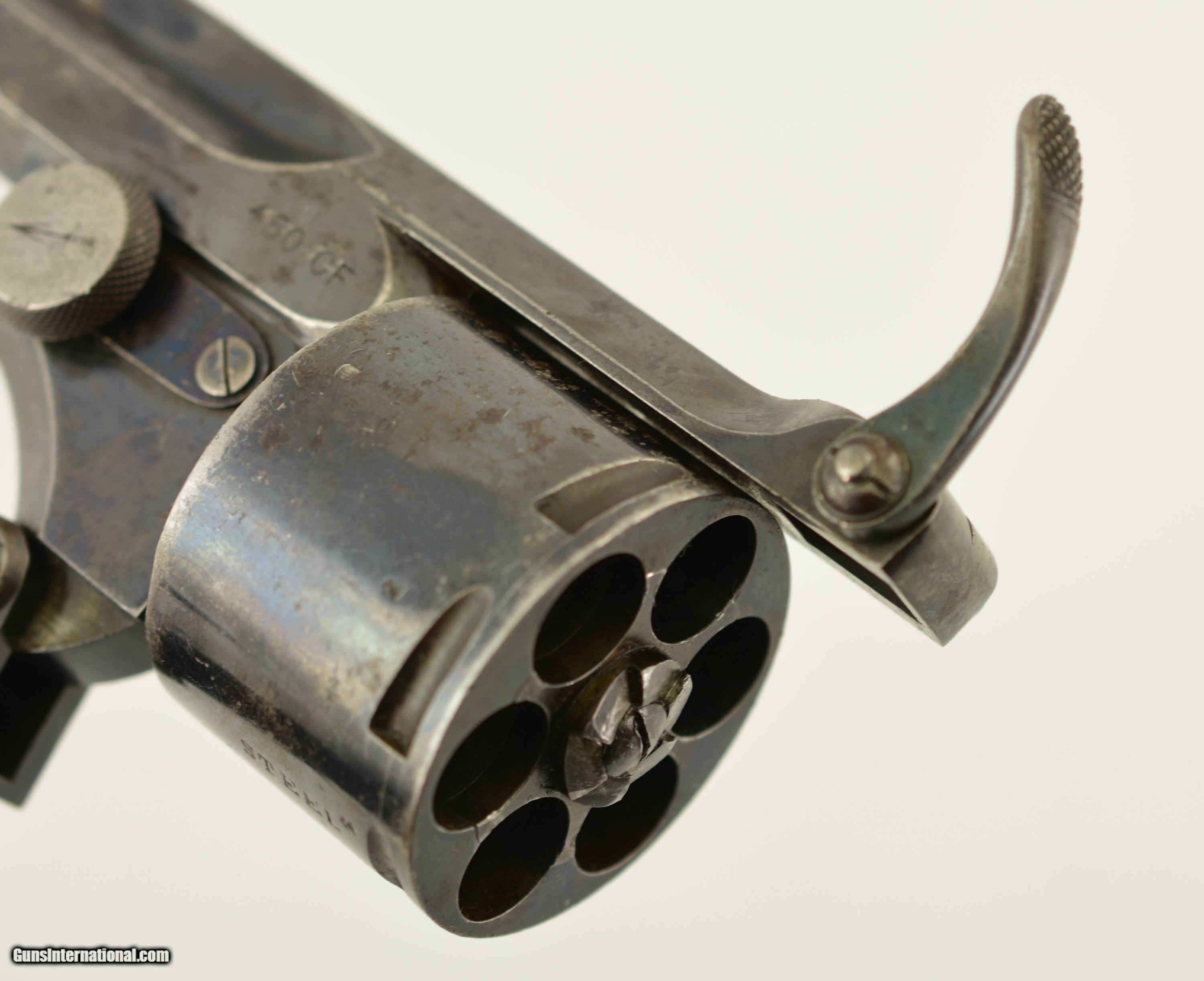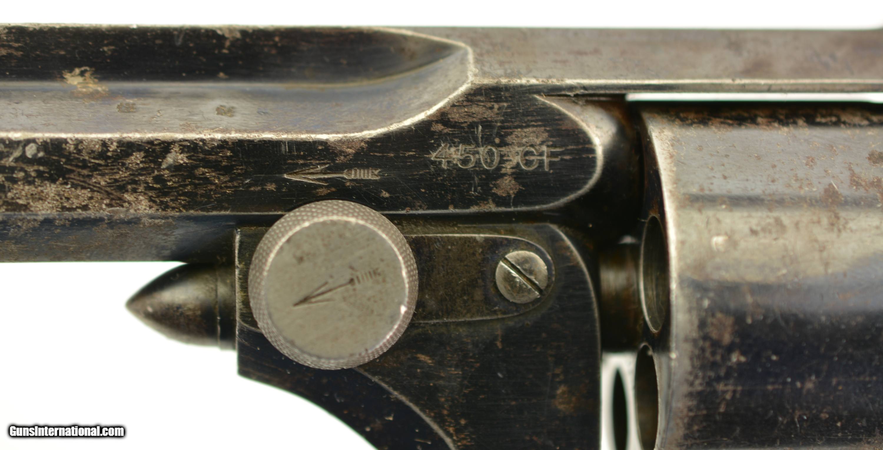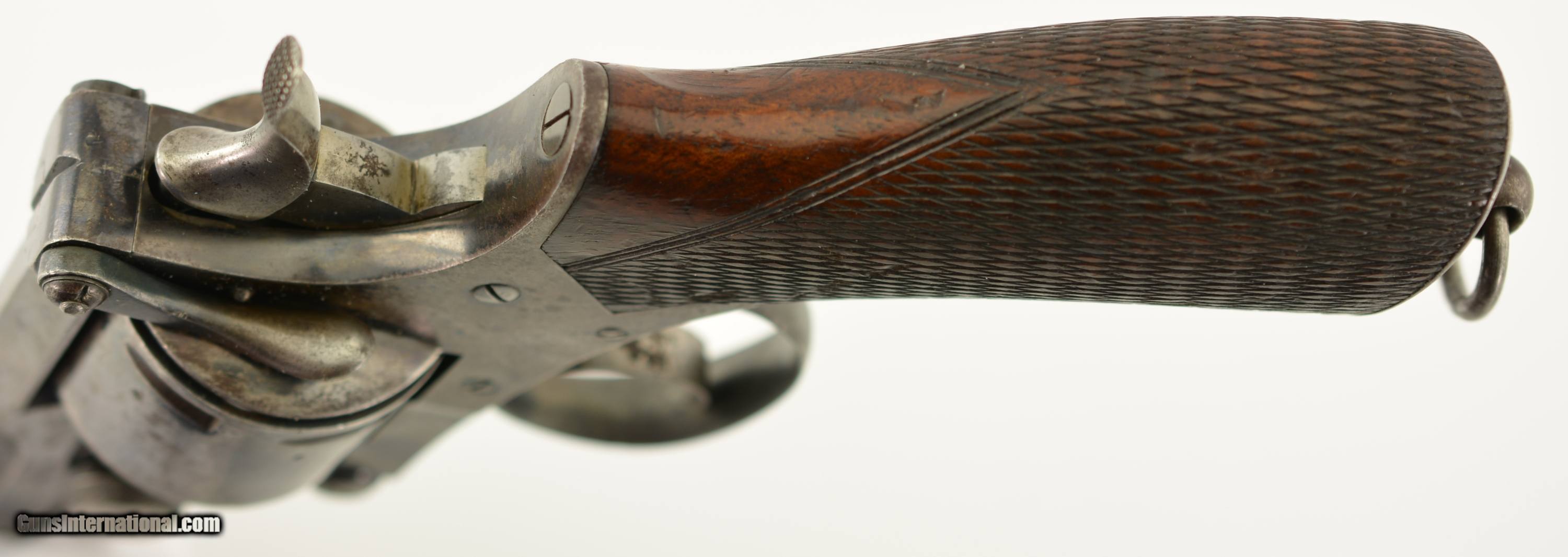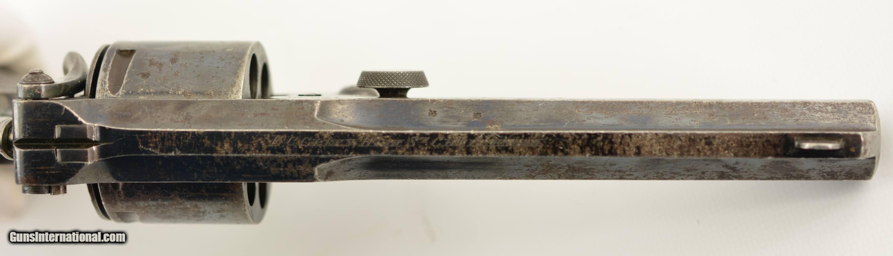 Description: Serial #1884, .450 CF, 5 1/2" ribbed barrel with an excellent, bright bore. This is a handsome, small-hinge revolver that uses a Pryse-type manual barrel latch that swings up and forward in order to break open the gun for loading. The extractor is non-rebounding, and the lock-up is still tight, with only a hint of lateral play in the barrel. The metal retains about 70-75% of the original bright blue with the balance faded to mottled gray, and with silvering along the high and exposed edges. The retailer name is engraved along the barrel rib: "E.C. GREEN HIGH ST. CHELTENHAM", and "STEEL" is stamped twice into the cylinder. The checkered walnut grip is in fine shape, with scattered minor handling marks in the original oil finish on both sides. The action remains fully functional and the revolver rates fine condition overall. These revolvers are very rarely seen in North America, and this example would make a great addition to any collection. Antique SOLD Antique: Yes Manufacturer: Webley Model: Pryse Serial Number: 1884 Caliber Info: .450 Gauge Info: .450 |