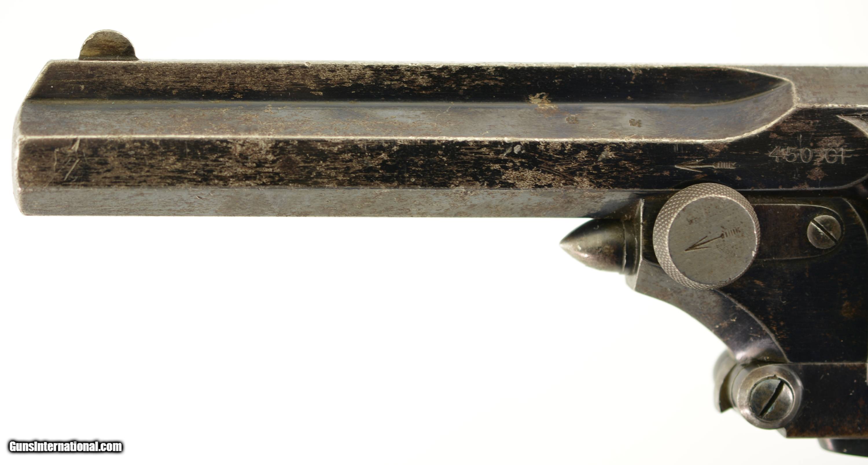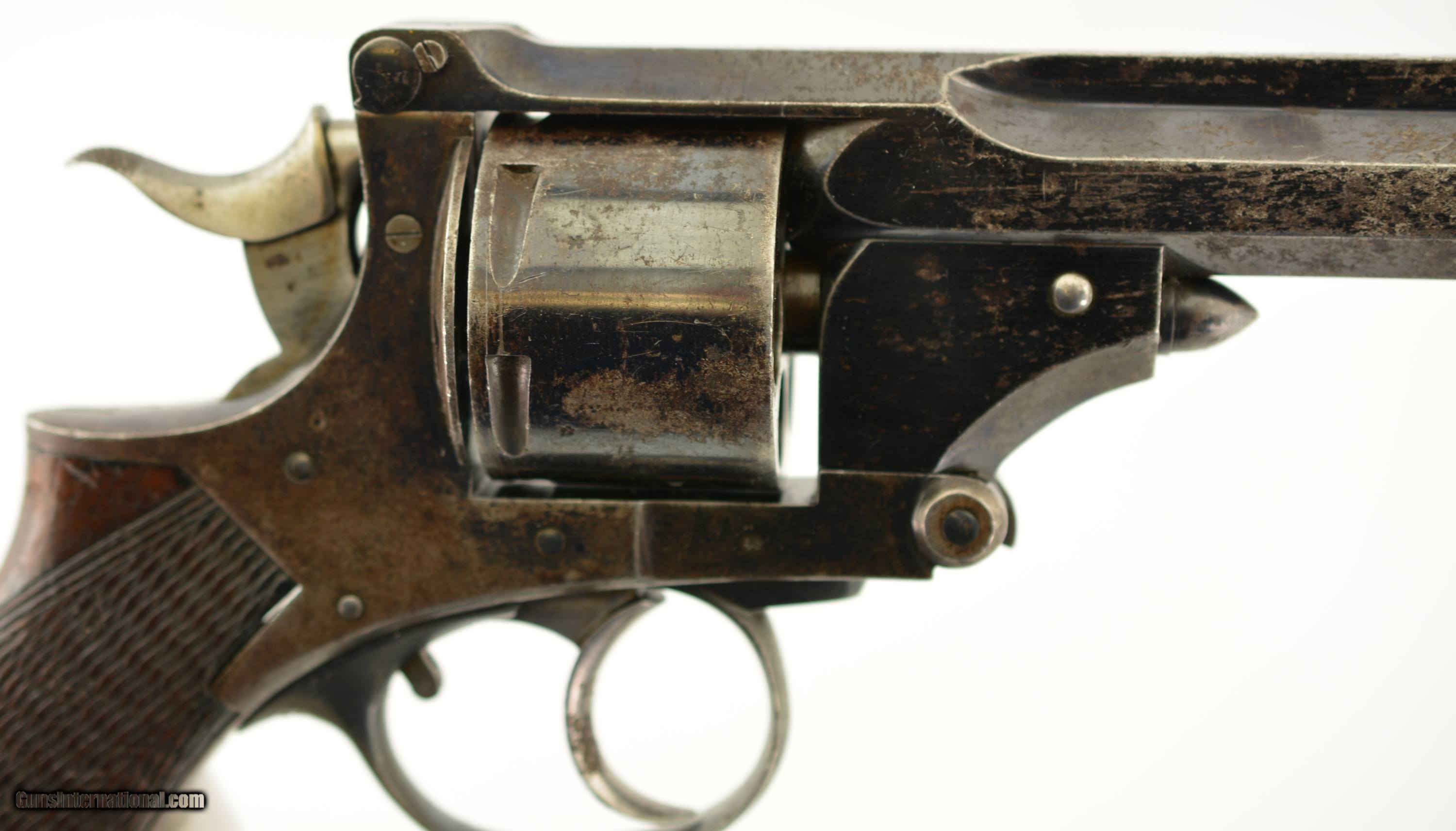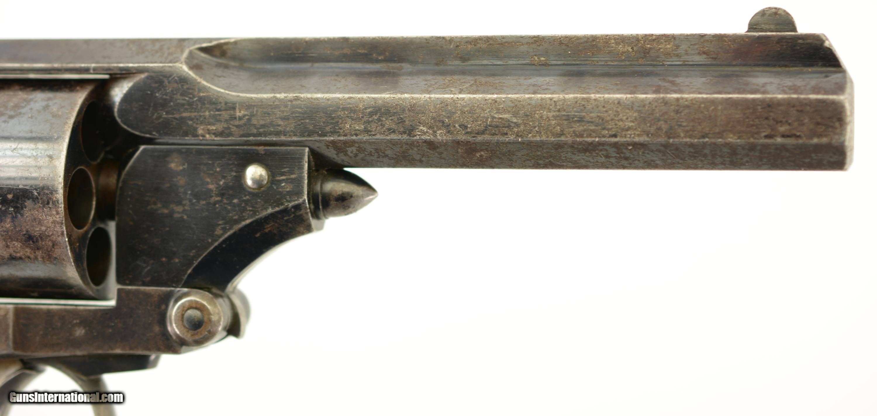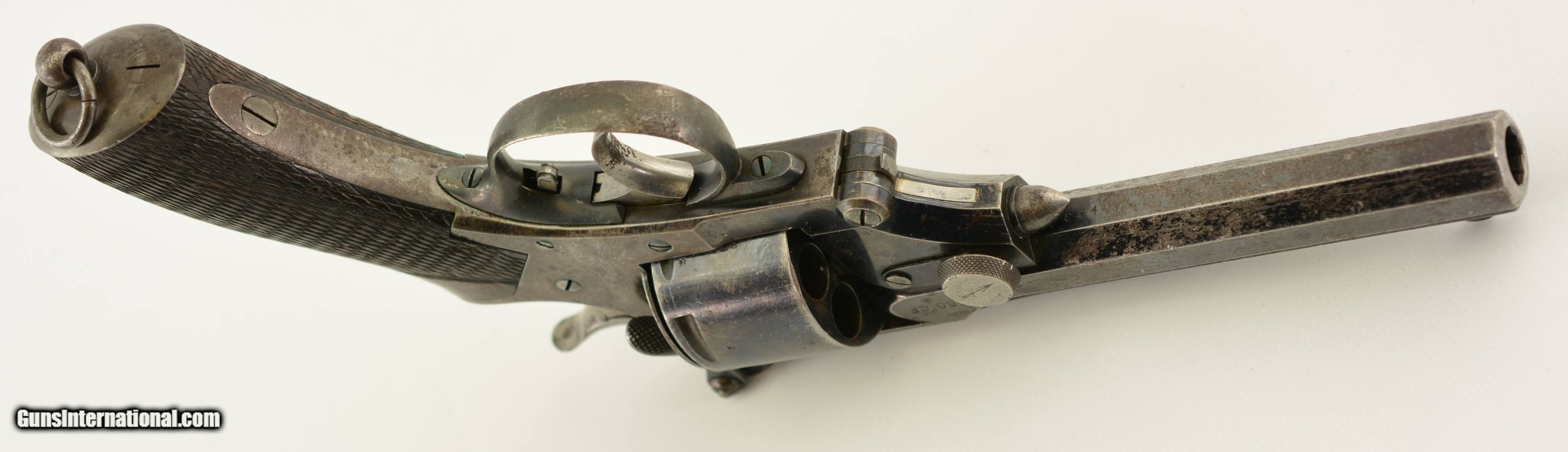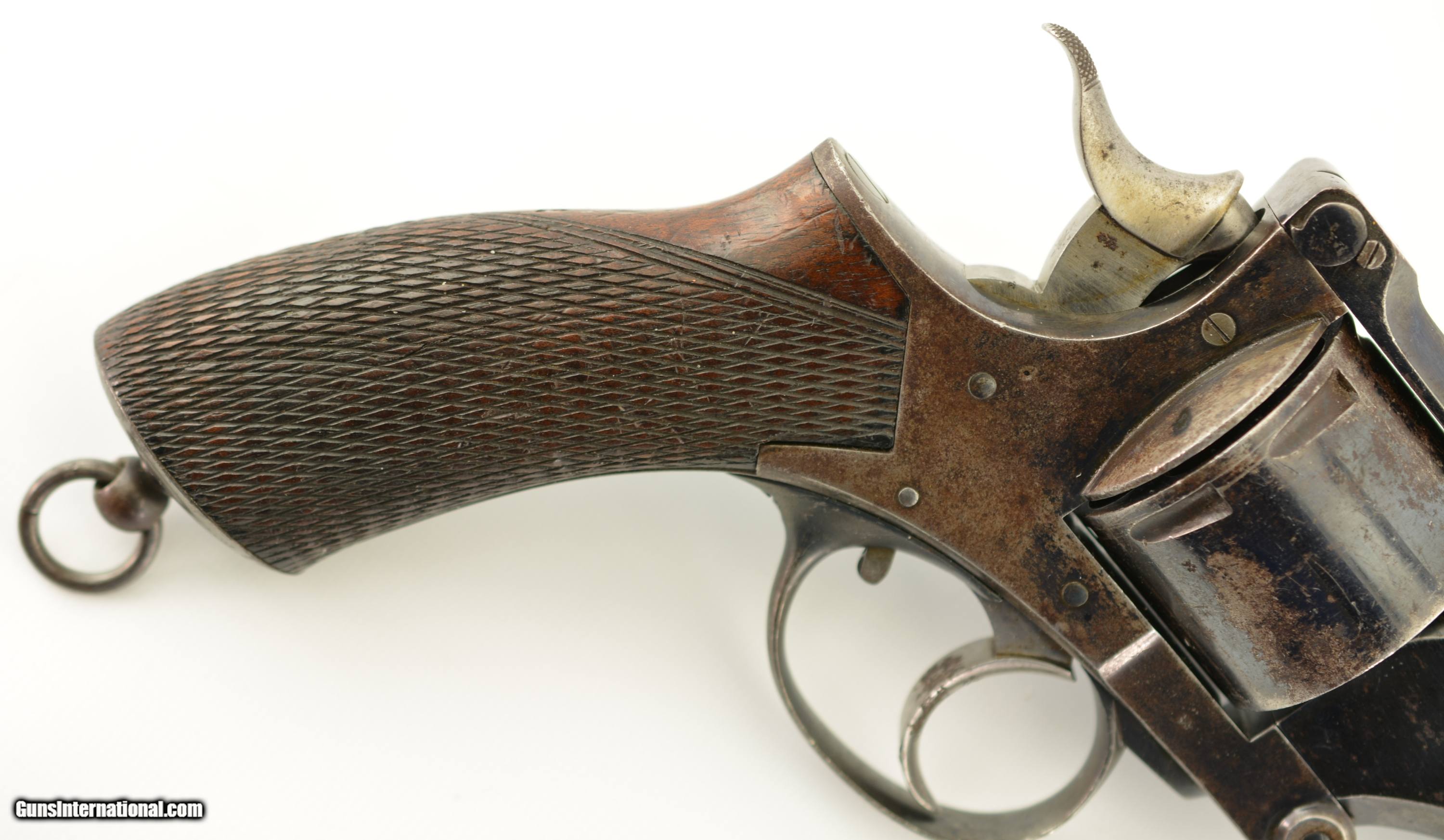 Description: Serial #1884, .450 CF, 5 1/2" ribbed barrel with an excellent, bright bore. This is a handsome, small-hinge revolver that uses a Pryse-type manual barrel latch that swings up and forward in order to break open the gun for loading. The extractor is non-rebounding, and the lock-up is still tight, with only a hint of lateral play in the barrel. The metal retains about 70-75% of the original bright blue with the balance faded to mottled gray, and with silvering along the high and exposed edges. The retailer name is engraved along the barrel rib: "E.C. GREEN HIGH ST. CHELTENHAM", and "STEEL" is stamped twice into the cylinder. The checkered walnut grip is in fine shape, with scattered minor handling marks in the original oil finish on both sides. The action remains fully functional and the revolver rates fine condition overall. These revolvers are very rarely seen in North America, and this example would make a great addition to any collection. Antique SOLD Antique: Yes Manufacturer: Webley Model: Pryse Serial Number: 1884 Caliber Info: .450 Gauge Info: .450 |