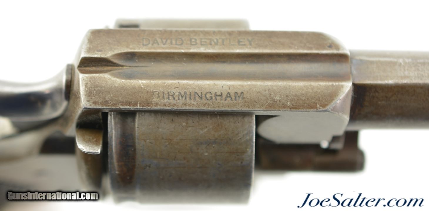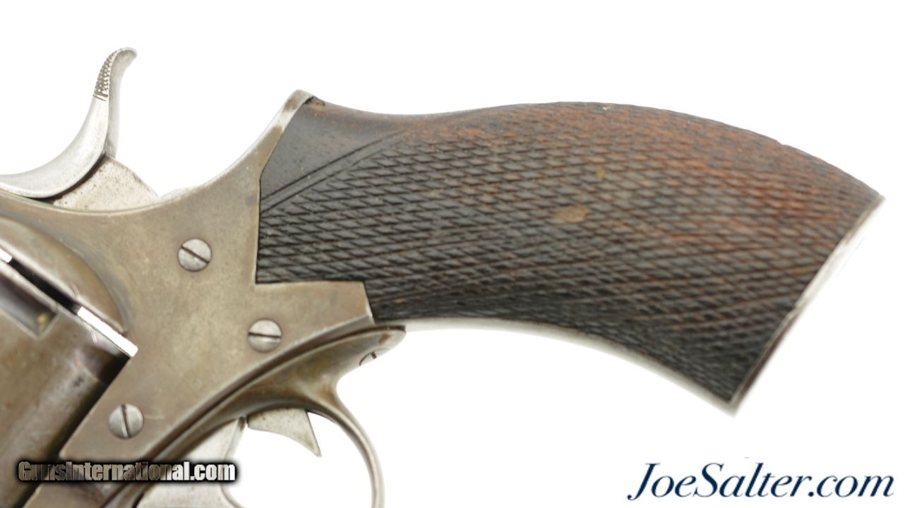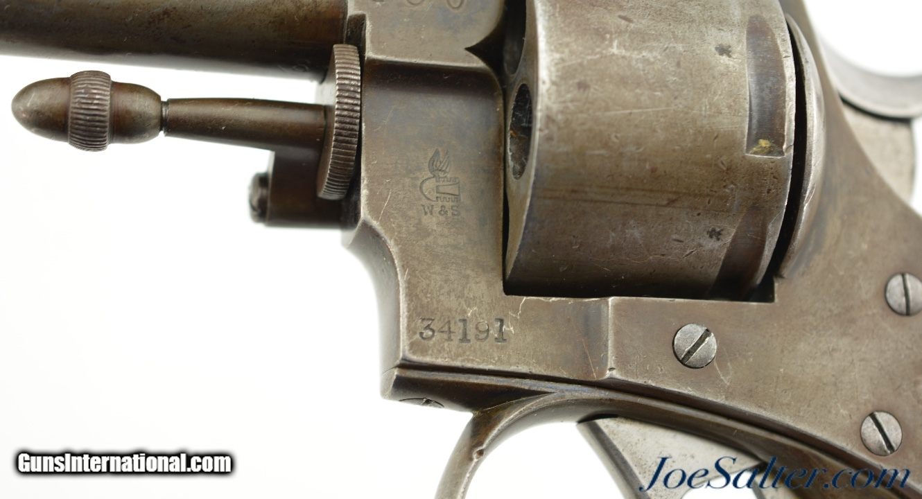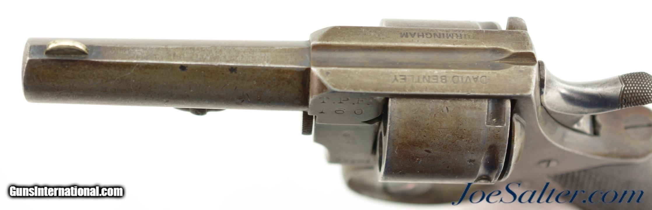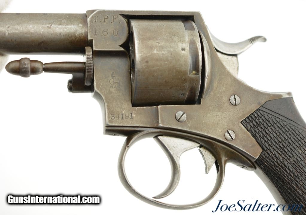 Description: Serial #34191, .442 CF, 3 1/2" barrel with a fine, bright bore that has some traces of mild freckling within the grooves. This is a great looking, transitional model revolver that has all matching serial and assembly numbers. The metal retains traces of the original bright blue on protected areas, with the balance flaked to a mottled, gray and plum-brown patina. The topstrap is marked, "DAVID BENTLEY / BIRMINGHAM," and the left side of the frame has the Webley "Winged Bullet" trademark. Additionally, Toronto Police Force property and inventory markings are present on the left side of the frame: "TPF / 160". The checkered walnut grip is in very good shape with flattening of the points and minor handling marks throughout the original oil finish. Additionally, there are a few very small chips at the top of the grip where it meets the frame knuckle. David Bentley was a well-known Birmingham maker and retailer (in business from 1845 & 1883), and supplied many British dominion and colonial constabularies with Webley revolvers during that time. This is a very good example of a Canadian police-marked RIC revolver, and would make a great addition to a collection. Antique SOLD Antique: Yes |