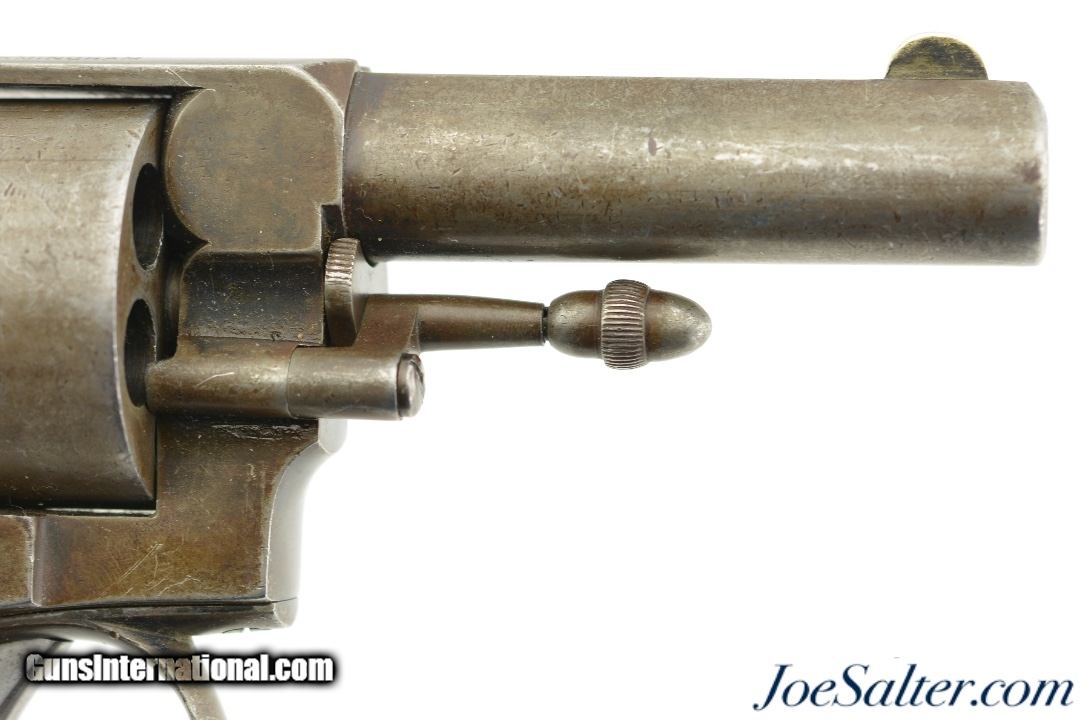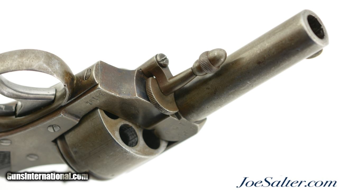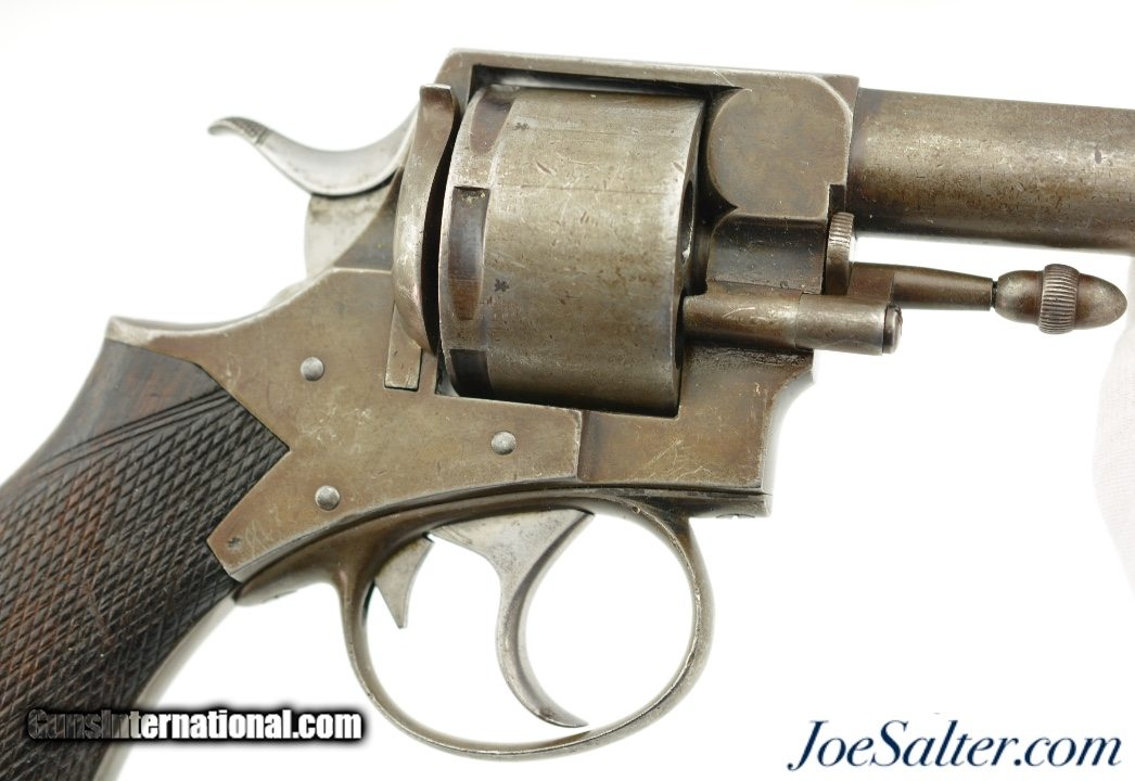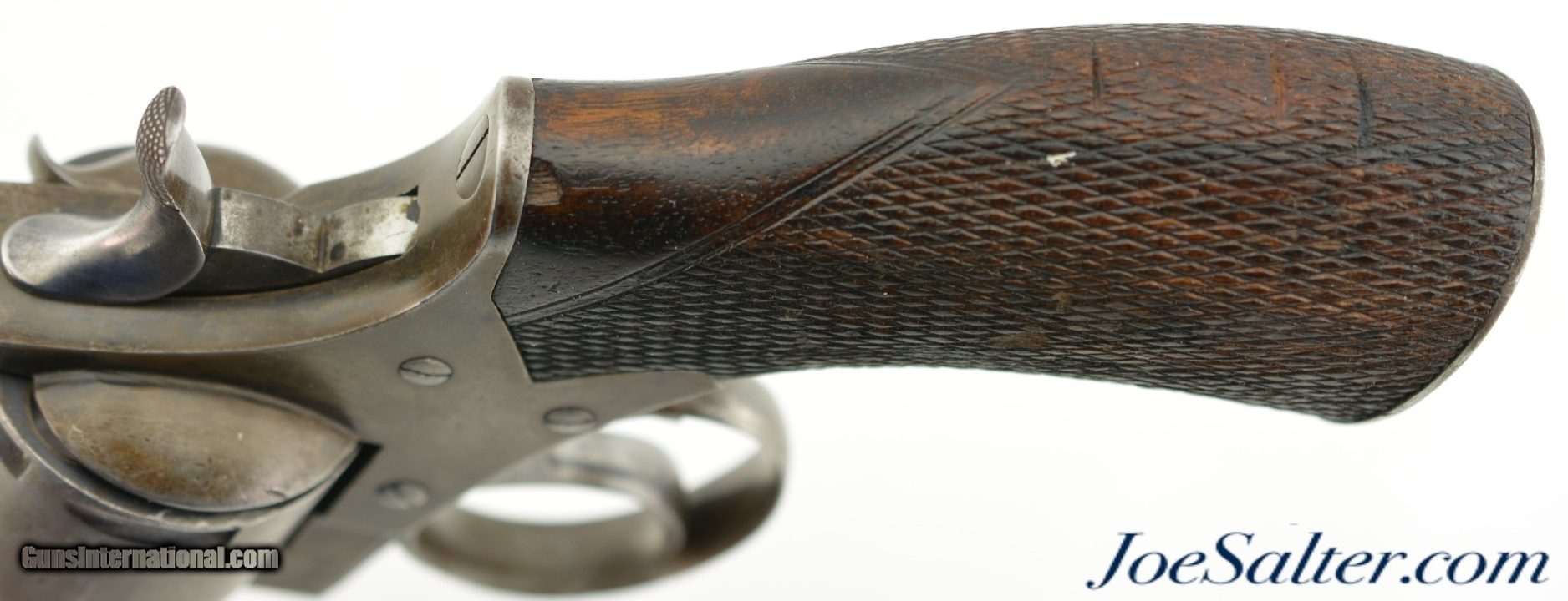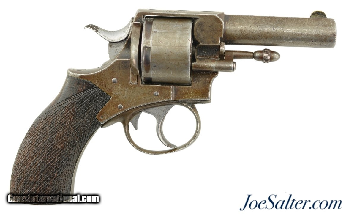Description: Serial #34191, .442 CF, 3 1/2" barrel with a fine, bright bore that has some traces of mild freckling within the grooves. This is a great looking, transitional model revolver that has all matching serial and assembly numbers. The metal retains traces of the original bright blue on protected areas, with the balance flaked to a mottled, gray and plum-brown patina. The topstrap is marked, "DAVID BENTLEY / BIRMINGHAM," and the left side of the frame has the Webley "Winged Bullet" trademark. Additionally, Toronto Police Force property and inventory markings are present on the left side of the frame: "TPF / 160". The checkered walnut grip is in very good shape with flattening of the points and minor handling marks throughout the original oil finish. Additionally, there are a few very small chips at the top of the grip where it meets the frame knuckle. David Bentley was a well-known Birmingham maker and retailer (in business from 1845 & 1883), and supplied many British dominion and colonial constabularies with Webley revolvers during that time. This is a very good example of a Canadian police-marked RIC revolver, and would make a great addition to a collection. Antique SOLD Antique: Yes |