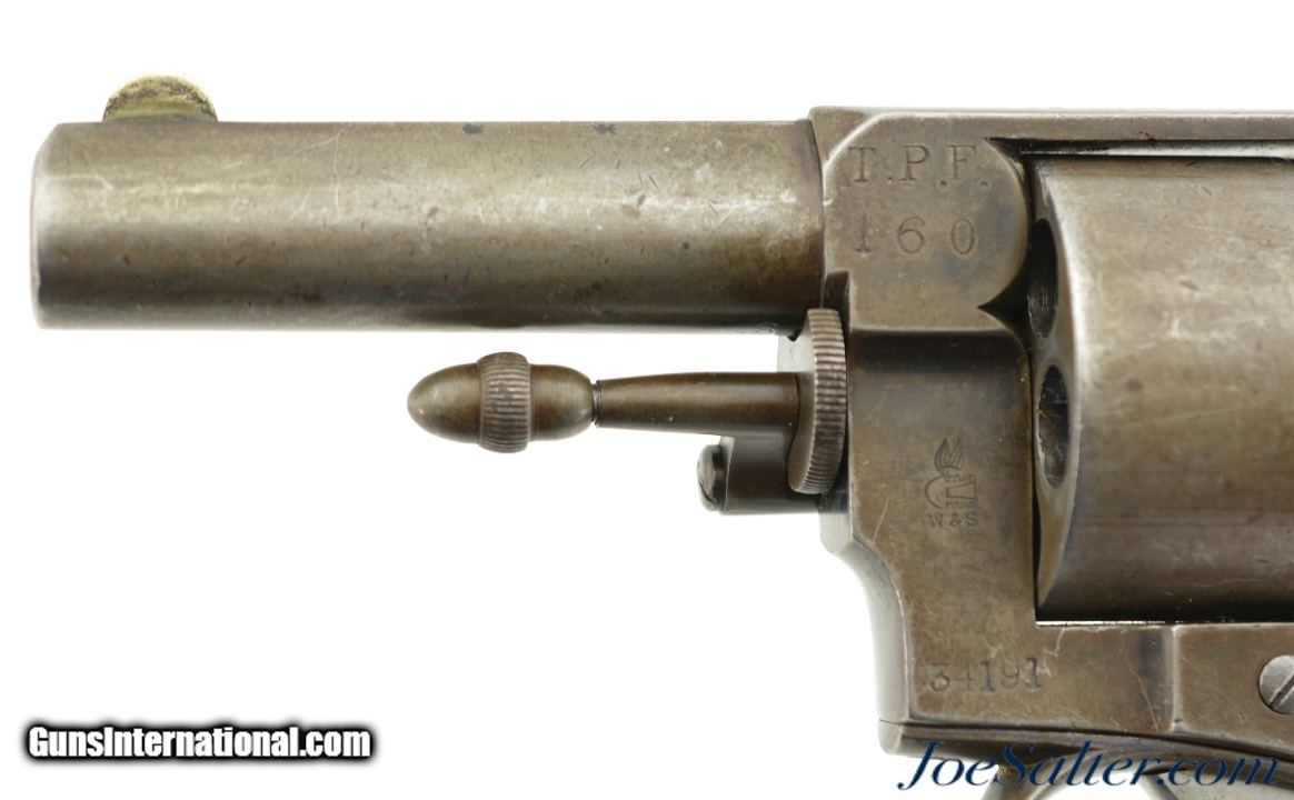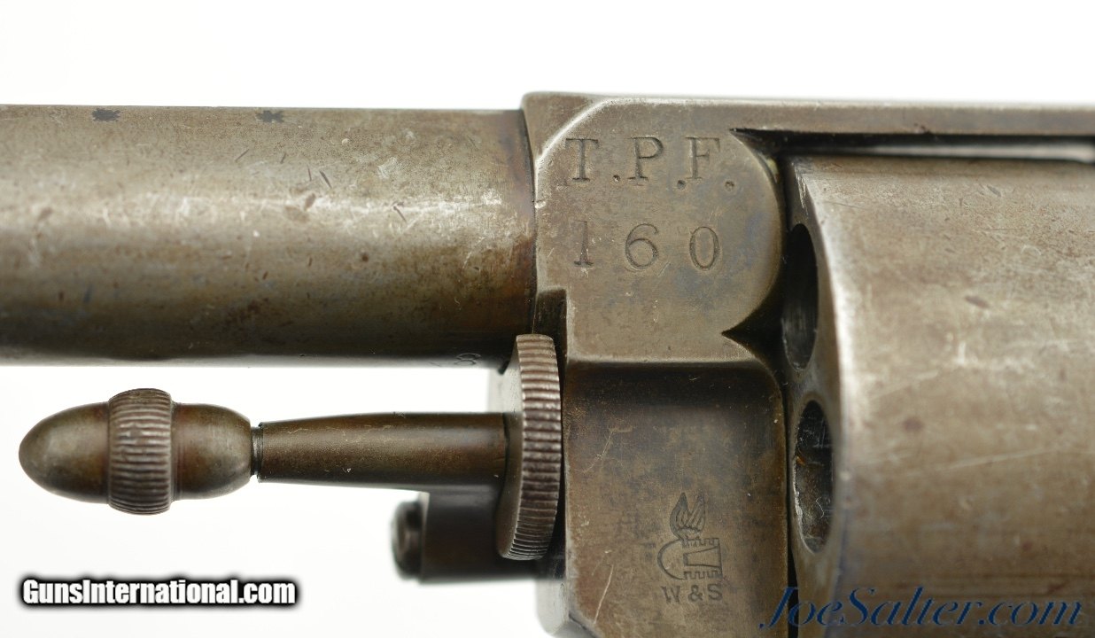 Description: Serial #34191, .442 CF, 3 1/2" barrel with a fine, bright bore that has some traces of mild freckling within the grooves. This is a great looking, transitional model revolver that has all matching serial and assembly numbers. The metal retains traces of the original bright blue on protected areas, with the balance flaked to a mottled, gray and plum-brown patina. The topstrap is marked, "DAVID BENTLEY / BIRMINGHAM," and the left side of the frame has the Webley "Winged Bullet" trademark. Additionally, Toronto Police Force property and inventory markings are present on the left side of the frame: "TPF / 160". The checkered walnut grip is in very good shape with flattening of the points and minor handling marks throughout the original oil finish. Additionally, there are a few very small chips at the top of the grip where it meets the frame knuckle. David Bentley was a well-known Birmingham maker and retailer (in business from 1845 & 1883), and supplied many British dominion and colonial constabularies with Webley revolvers during that time. This is a very good example of a Canadian police-marked RIC revolver, and would make a great addition to a collection. Antique SOLD |
