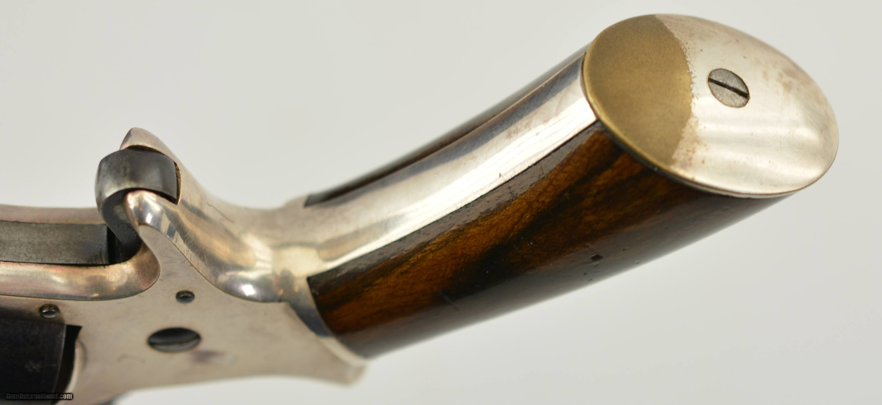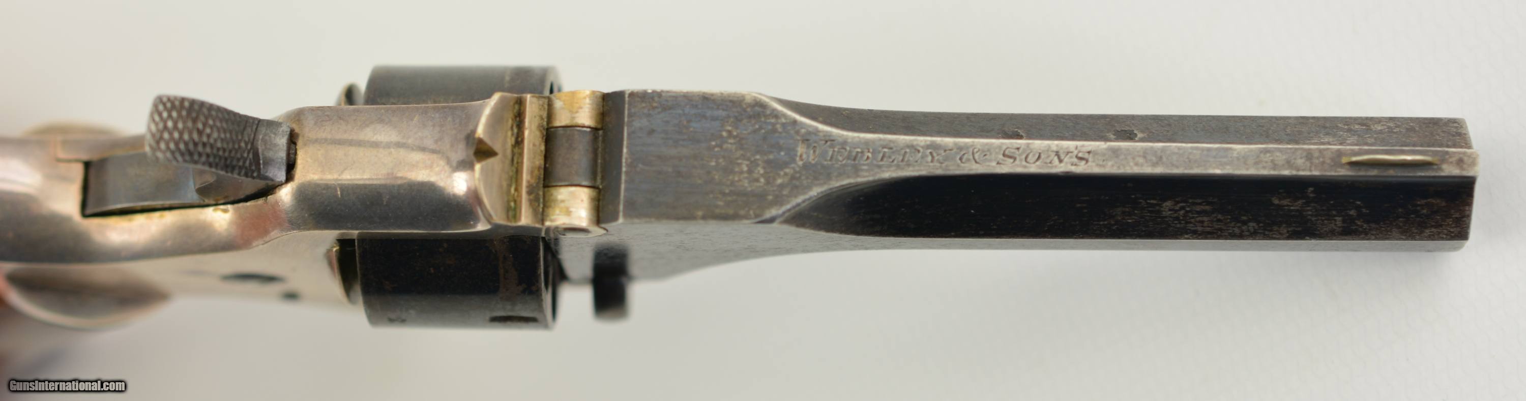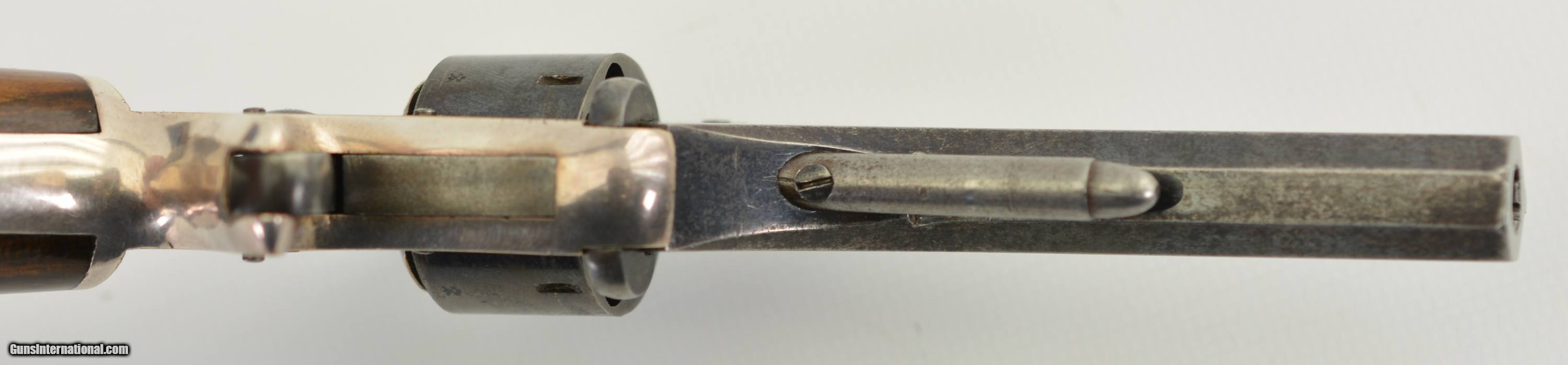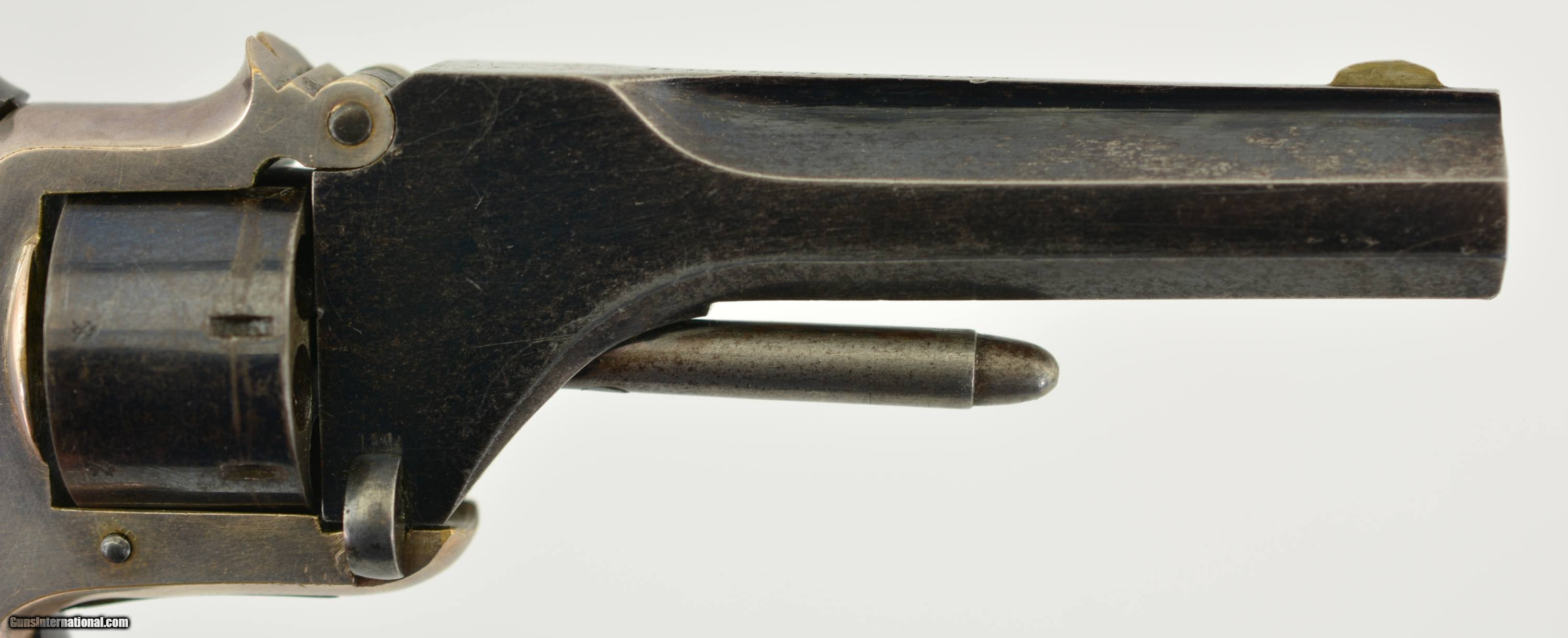 Description: NSN (Assembly #2), .230 RF, 3 1/8 inch octagon barrel with a very good bore that has mild freckling within the grooves. This is a very handsome little revolver that has matching assembly numbers on the barrel and cylinder, with the metal retaining 80-85% of the original, lightly tarnished silver finish that has faded to dull ochre brass along the edges, as well as on the toe and heel of the butt where the metal has rubbed against the case lining. About 70-75% of the original blue remains on the "WEBLEY & SONS" marked barrel, with gray fading at the muzzle, and on the high edges. Traces of original blue remain on the cylinder, with a mixture of gray and plum-brown mottling on the balance. The walnut grips are in fine shape with very few handling marks or blemishes in the original varnish. The lock-up is tight, and the action functions flawlessly. The revolver is housed in a burled walnut, British case with blank, two-piece metal shield escutcheon and riband inlays on the lid, and a restored, blue baize interior. A cleaning rod, pewter oil bottle, and key are included. This is an excellent little S&W No. 1 analog, in a desirable British casing. Antique SOLD Antique: Yes Manufacturer: Webley Model: No. 1 Caliber Info: .230 Gauge Info: .230 |