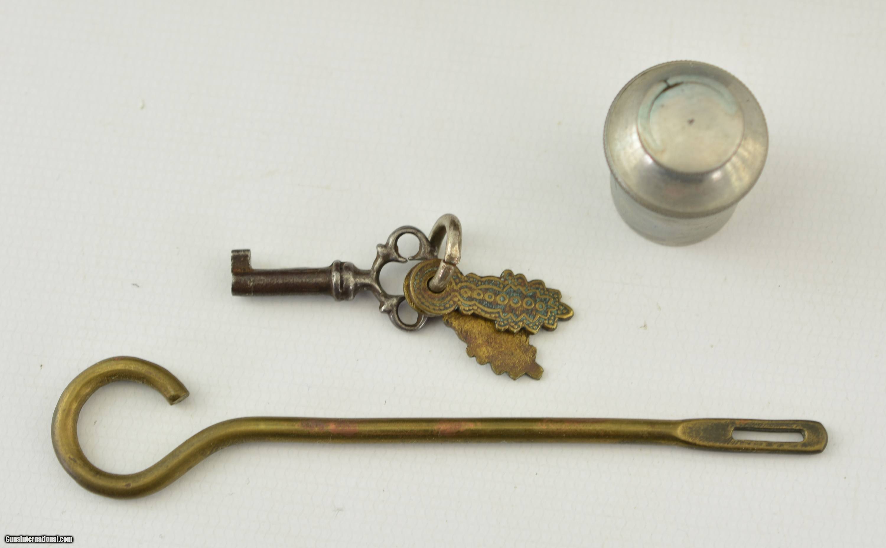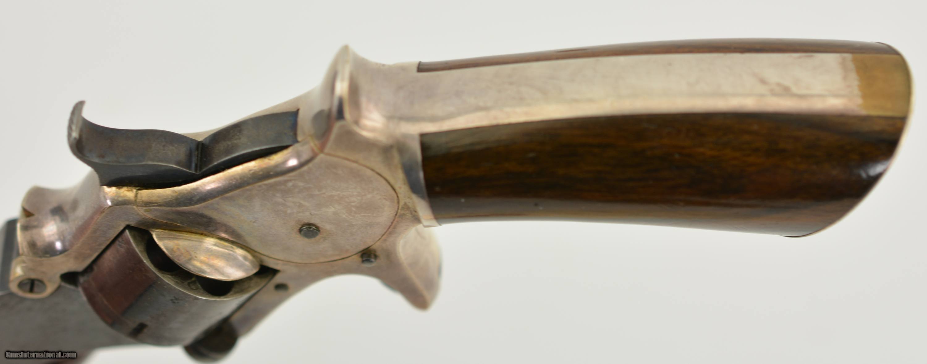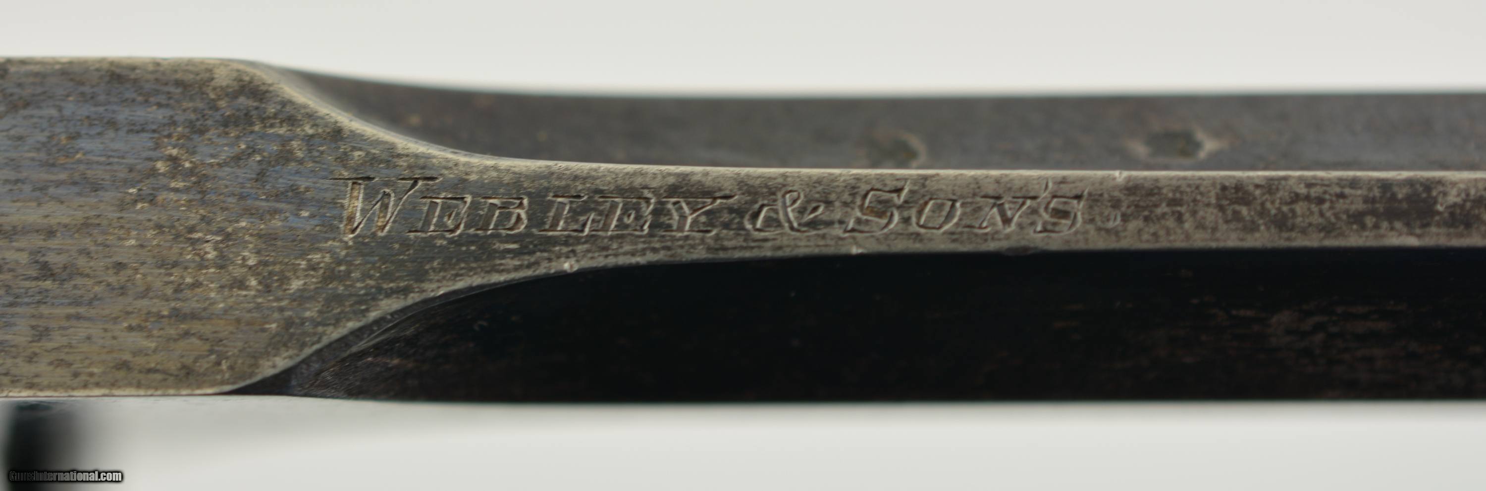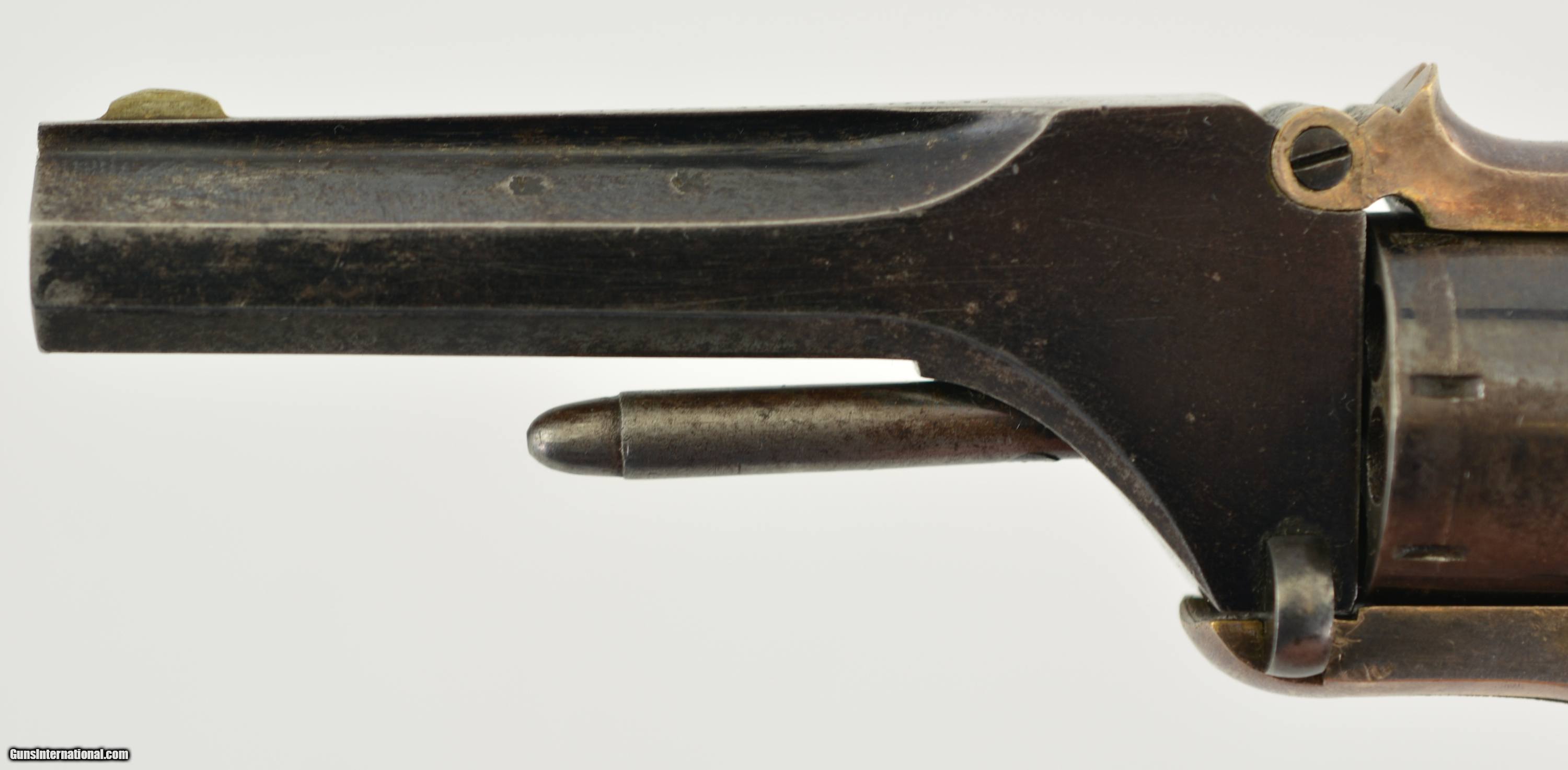 Description: NSN (Assembly #2), .230 RF, 3 1/8 inch octagon barrel with a very good bore that has mild freckling within the grooves. This is a very handsome little revolver that has matching assembly numbers on the barrel and cylinder, with the metal retaining 80-85% of the original, lightly tarnished silver finish that has faded to dull ochre brass along the edges, as well as on the toe and heel of the butt where the metal has rubbed against the case lining. About 70-75% of the original blue remains on the "WEBLEY & SONS" marked barrel, with gray fading at the muzzle, and on the high edges. Traces of original blue remain on the cylinder, with a mixture of gray and plum-brown mottling on the balance. The walnut grips are in fine shape with very few handling marks or blemishes in the original varnish. The lock-up is tight, and the action functions flawlessly. The revolver is housed in a burled walnut, British case with blank, two-piece metal shield escutcheon and riband inlays on the lid, and a restored, blue baize interior. A cleaning rod, pewter oil bottle, and key are included. This is an excellent little S&W No. 1 analog, in a desirable British casing. Antique SOLD Antique: Yes Manufacturer: Webley Model: No. 1 Caliber Info: .230 Gauge Info: .230 |