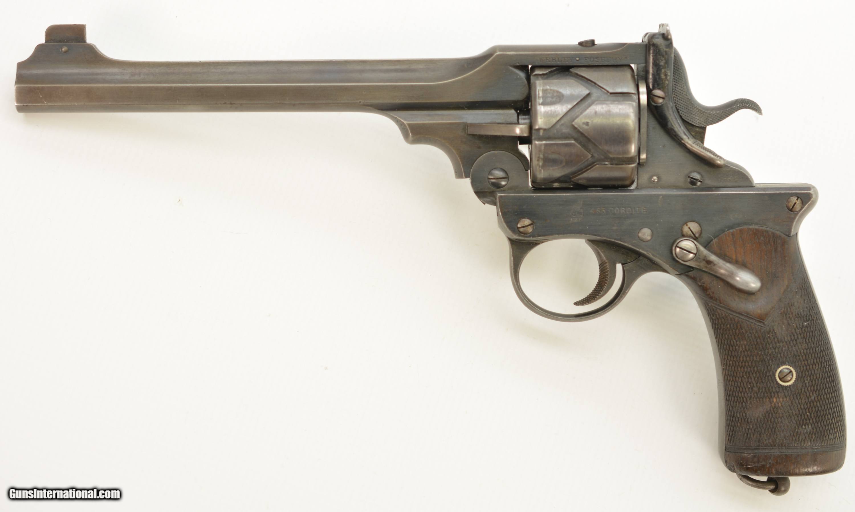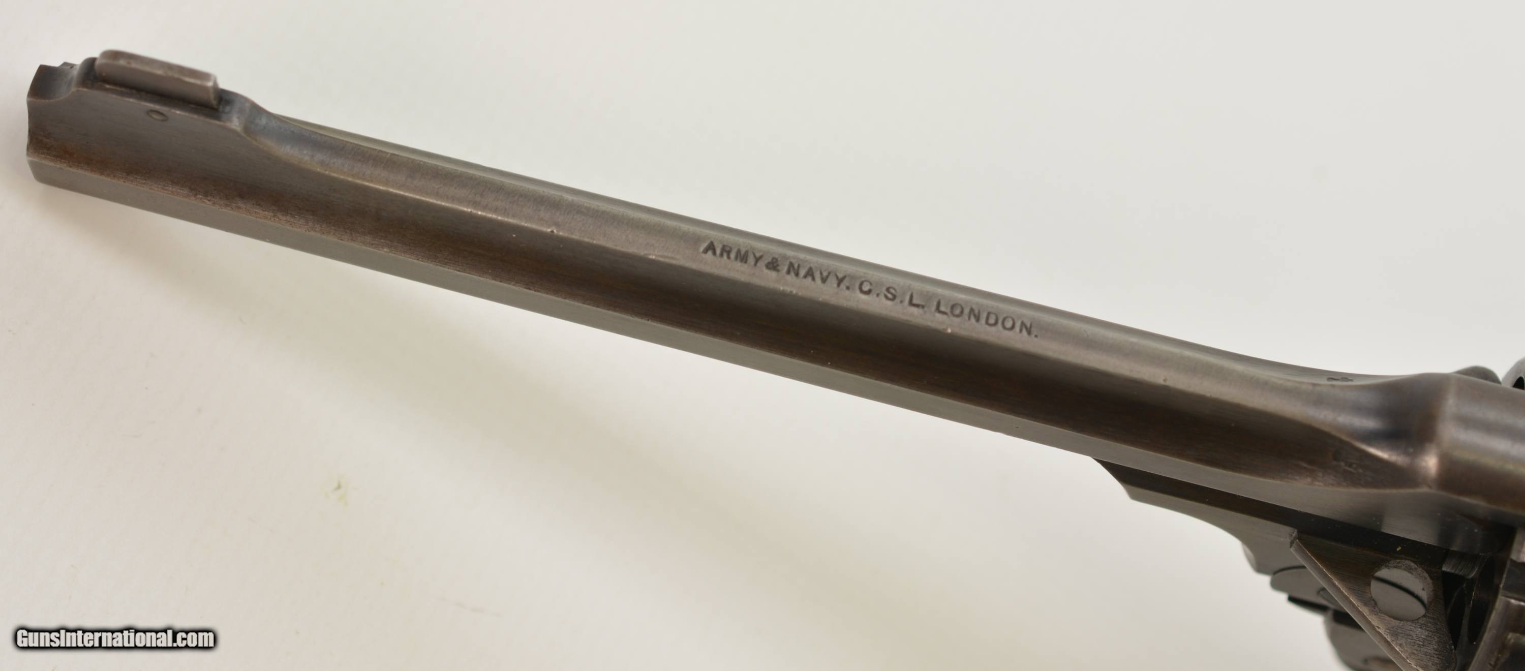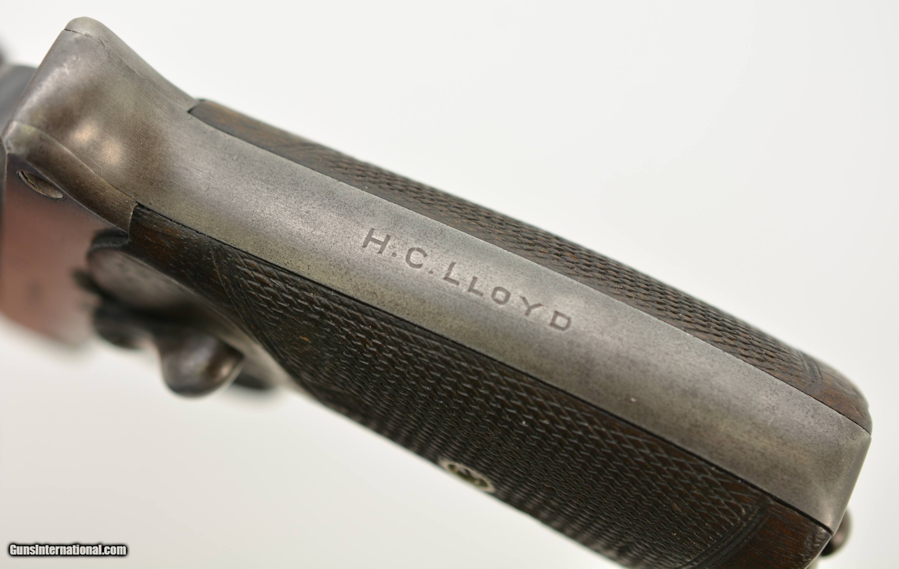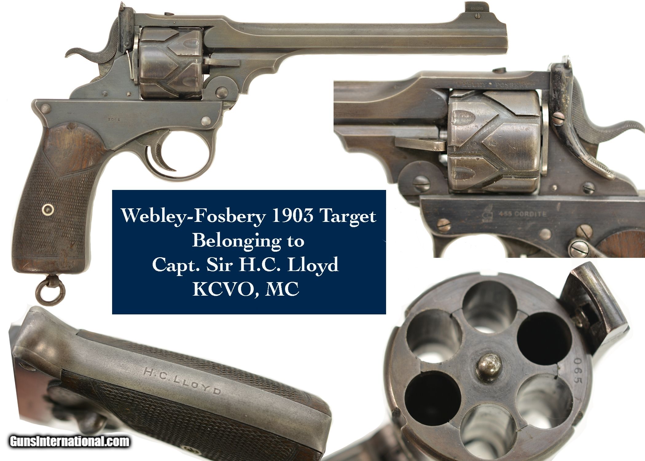 Description: Serial #3065, .455 Webley, 7 1/2" barrel with a fine, bright bore that has some mild freckling within the grooves. This is a handsome revolver that has retained 80-85% of the original blue that has faded to dark gray along the barrel and high edges. Silvering is present on the bearing surfaces of the frame rails, and there is gray metal along the gripstraps, which have an engraved name along the back: "H.C. LLOYD". The checkered walnut grips are in about very good shape with minor handling marks and blemishes on either side, as well as general flattening of the points. The right panel has some moderate bruises at the butt, and the locking stirrup has a flaked Suncorite finish. The lock-up is tight, and the revolver functions flawlessly. Army & Navy CSL records list this revolver as being sold to "Col. W.N. Lloyd, 3rd Welsh Brigade" on December 18, 1911. Wilford Neville Lloyd was born on September 15, 1855 at St. Johns, New Brunswick, Canada, to Col. Robert Clifford Lloyd of Losset, County Cavan. W.N. Lloyd was a keen cricketer, and for a time was the captain of the Royal Military Academy team. He obtained a commission in the Royal Artillery in 1876, and fought in the South African War of 1878-1879, where he was mentioned in despatches. In 1882, he was a temporary resident magistrate in Ireland, and, following his promotion to Captain in 1884, was requested to accompany the Sudan Expedition. In 1888, he was appointed Staff Captain for Royal Artillery for the Northern Military District (York); and in 1896 became the private secretary to the Duke of Westminster. He would’ve bought this revolver when he was Asst. QM-General for the Southern Command HQ, and later, Asst. to the Maj. General in Charge of Administration of the Southern Command. Evidently, the gun was given, or possibly inherited by his son: Sir Humphrey Clifford Lloyd, who was born on April 24, 1893 in London. Lloyd was educated at Eton and the Royal Military College, Sandhurst. He was commissioned a 2nd Lieutenant in the 1st Bn., King’s Royal Rifle Corps in 1913. He was severely wounded in the arm during an attack on German positions on the Aisne on September 14, 1914. He was mentioned despatches in June, 1915, and awarded the Military Cross. In 1915, upon his recovery, he was made Aide-de-Camp to the Viceroy of Ireland. The next year he was made Aide-de-Camp to General Lord Rawlinson, Cmdr. 4th Army, and was later transferred to the Royal Flying Corps. He served past the change from Royal Flying Corps to Royal Air Force, and retired as a Captain on October 17, 1923. Following his retirement, he became a Gentleman Usher for King George V; serving in this office until the reign of Queen Elizabeth II. He was in Queen Elizabeth’s Coronation procession, and led the Portcullis Pursuivant of Arms into Westminster Abbey. He was awarded the Commander of the Royal Victorian Order in 1953, and the Knight’s Commander of the Royal Victorian Order in 1962. He passed away in 1966. This is a splendid, double-identified Fosbery that is in very good-fine condition, and belonged to two very important British officers who served from Queen Victoria to Queen Elizabeth II. FFL or C&R SOLD Curio/Relic: Yes Manufacturer: Webley Model: Fosbery Serial Number: 3065 Caliber Info: .455 Gauge Info: .455 |