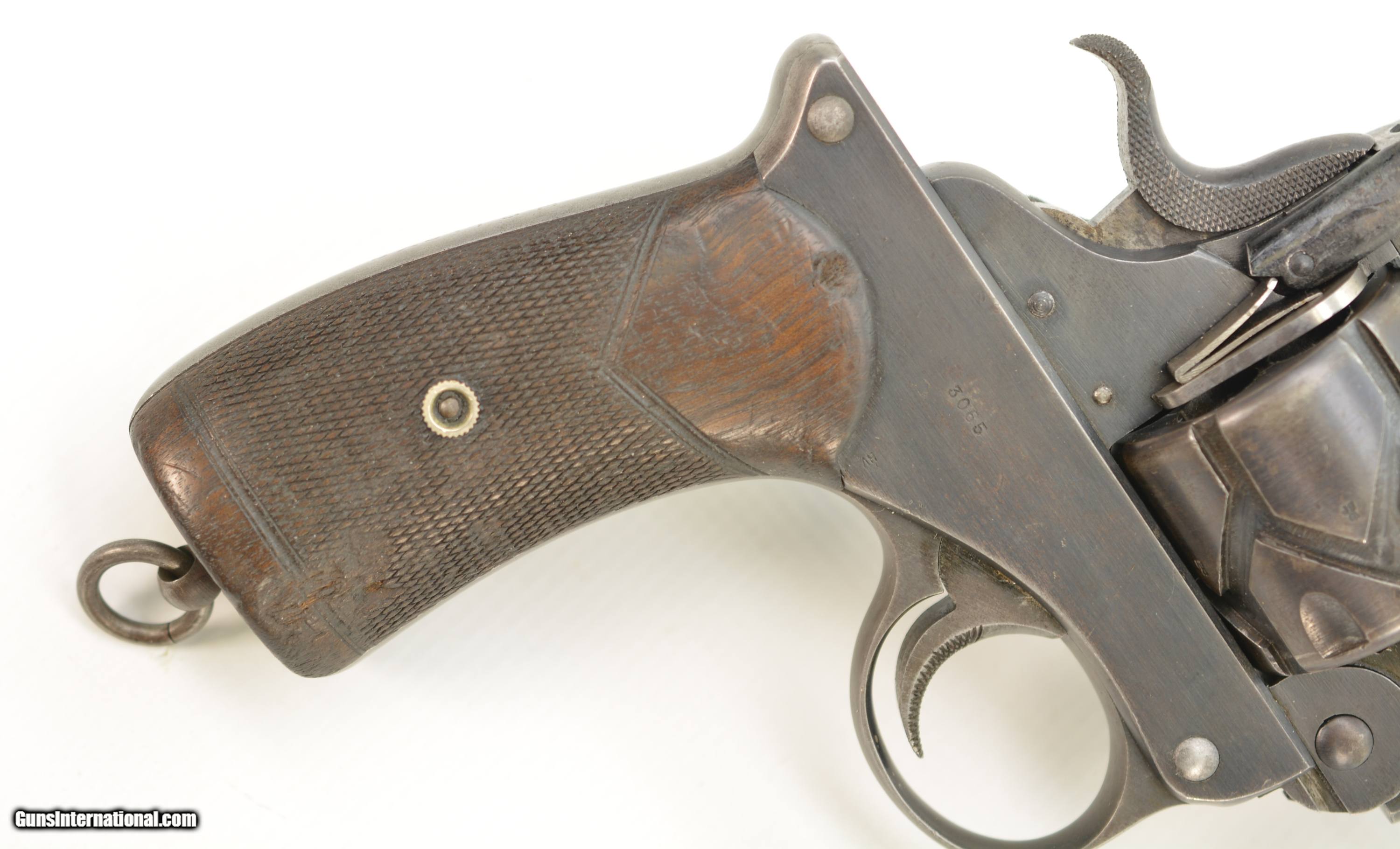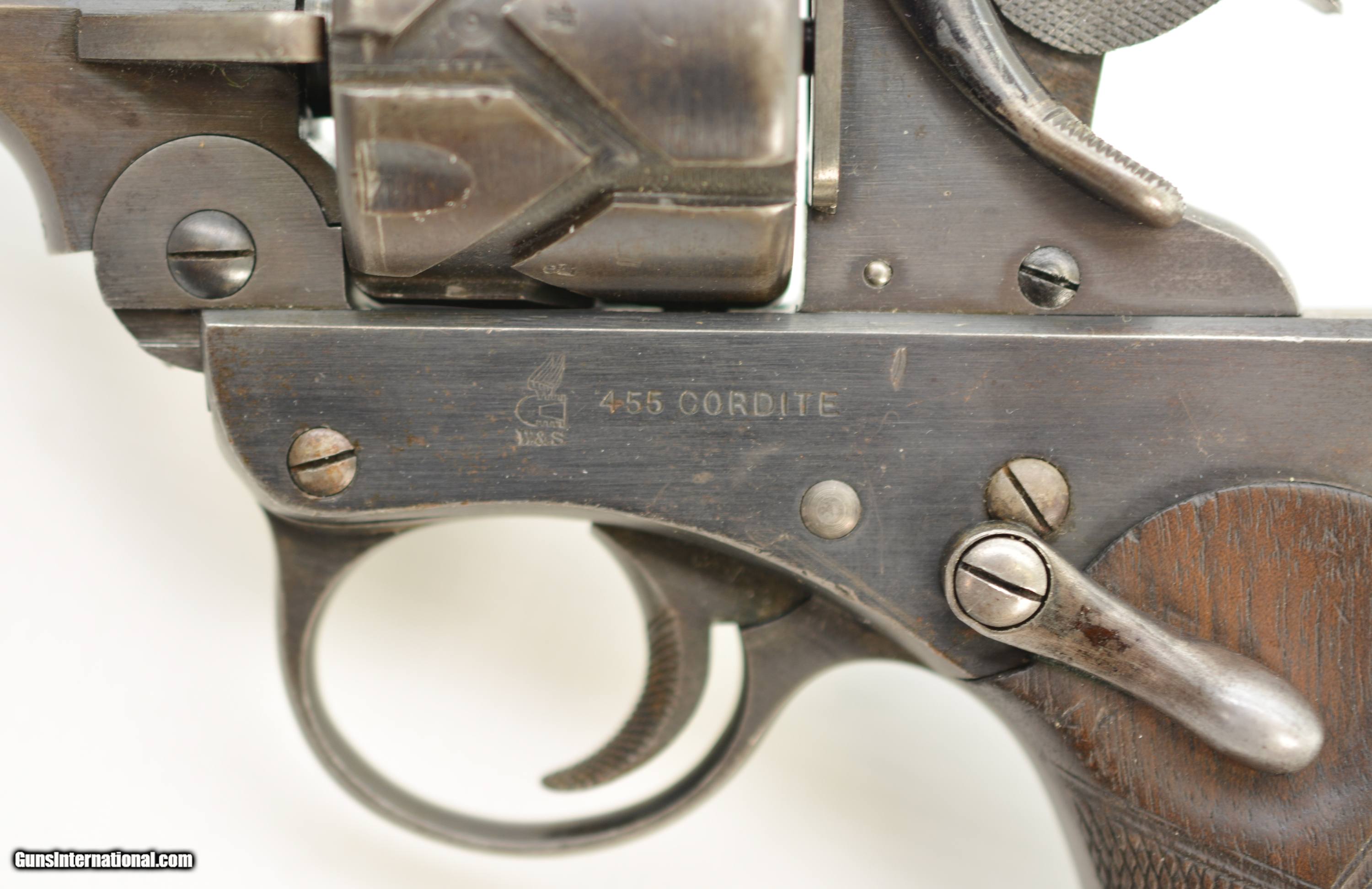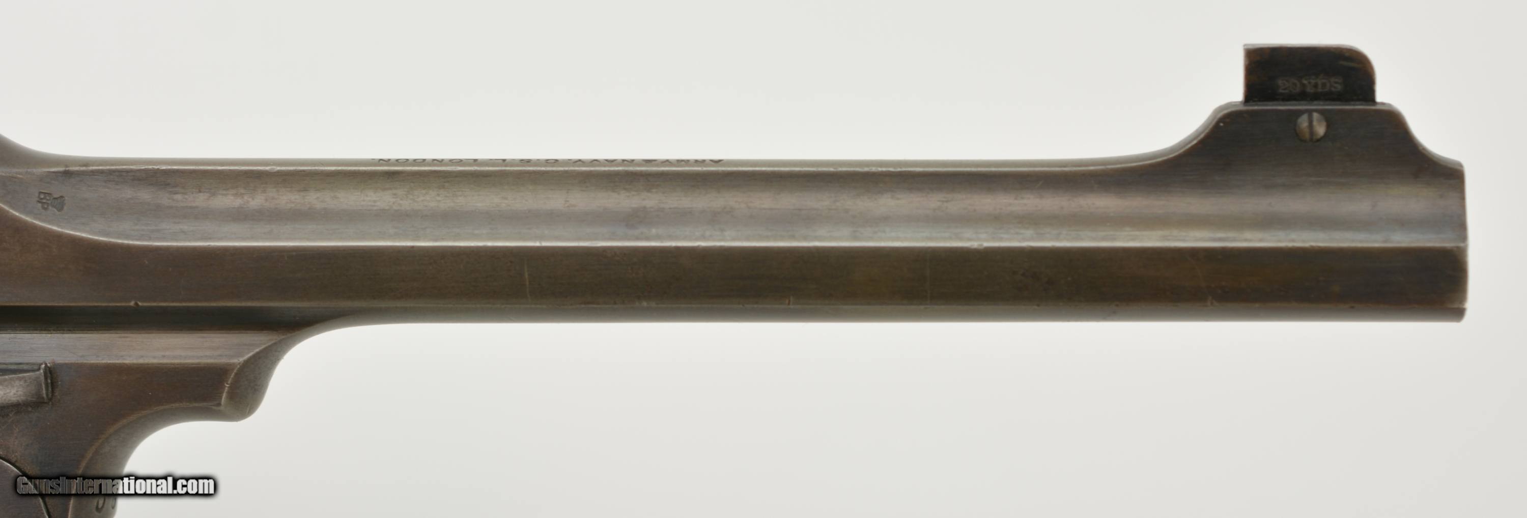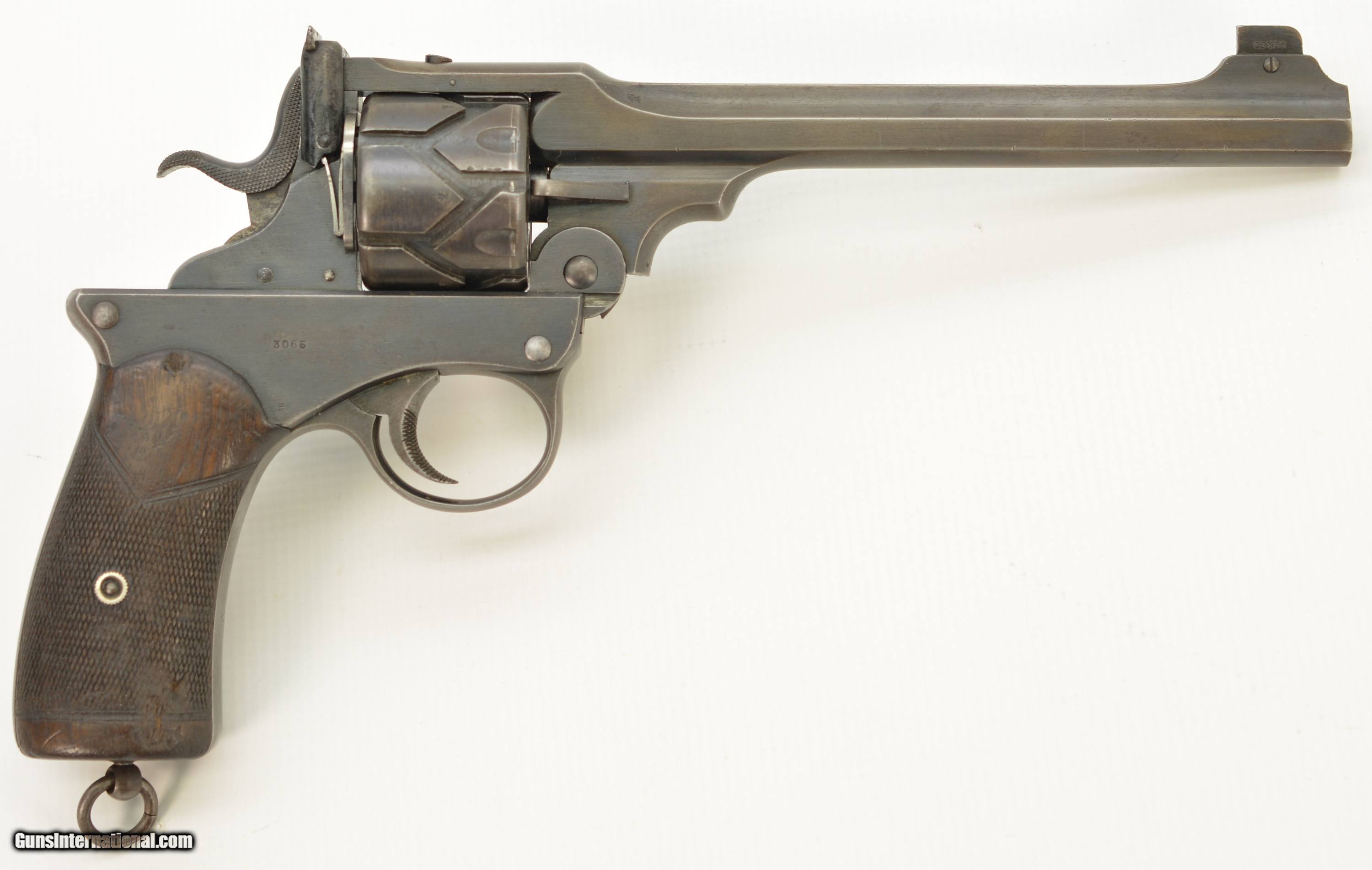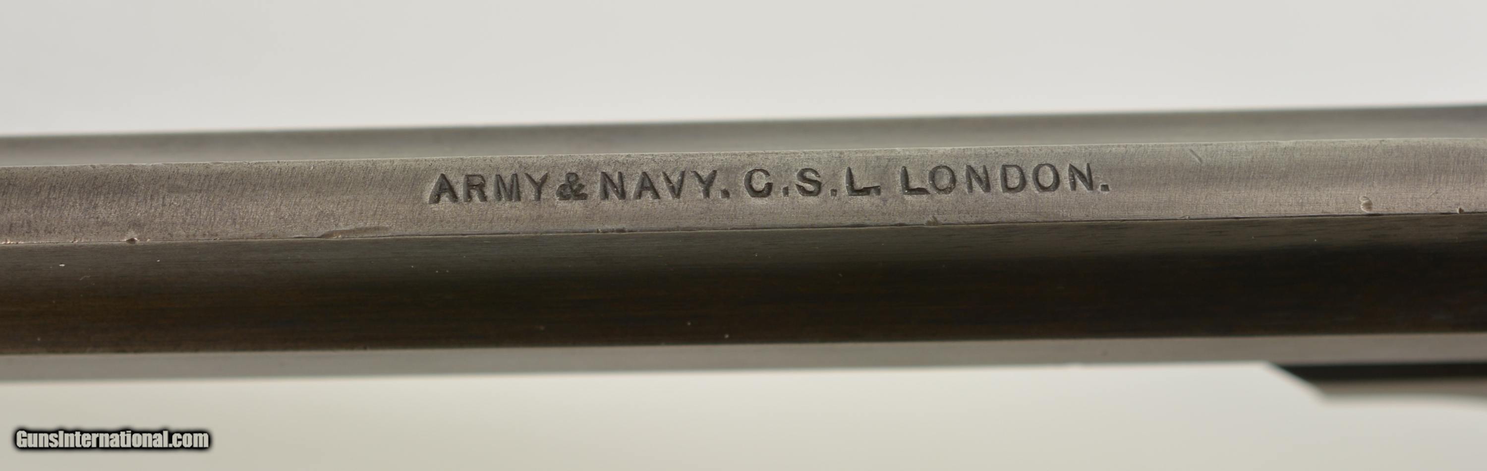 Description: Serial #3065, .455 Webley, 7 1/2" barrel with a fine, bright bore that has some mild freckling within the grooves. This is a handsome revolver that has retained 80-85% of the original blue that has faded to dark gray along the barrel and high edges. Silvering is present on the bearing surfaces of the frame rails, and there is gray metal along the gripstraps, which have an engraved name along the back: "H.C. LLOYD". The checkered walnut grips are in about very good shape with minor handling marks and blemishes on either side, as well as general flattening of the points. The right panel has some moderate bruises at the butt, and the locking stirrup has a flaked Suncorite finish. The lock-up is tight, and the revolver functions flawlessly. Army & Navy CSL records list this revolver as being sold to "Col. W.N. Lloyd, 3rd Welsh Brigade" on December 18, 1911. Wilford Neville Lloyd was born on September 15, 1855 at St. Johns, New Brunswick, Canada, to Col. Robert Clifford Lloyd of Losset, County Cavan. W.N. Lloyd was a keen cricketer, and for a time was the captain of the Royal Military Academy team. He obtained a commission in the Royal Artillery in 1876, and fought in the South African War of 1878-1879, where he was mentioned in despatches. In 1882, he was a temporary resident magistrate in Ireland, and, following his promotion to Captain in 1884, was requested to accompany the Sudan Expedition. In 1888, he was appointed Staff Captain for Royal Artillery for the Northern Military District (York); and in 1896 became the private secretary to the Duke of Westminster. He would’ve bought this revolver when he was Asst. QM-General for the Southern Command HQ, and later, Asst. to the Maj. General in Charge of Administration of the Southern Command. Evidently, the gun was given, or possibly inherited by his son: Sir Humphrey Clifford Lloyd, who was born on April 24, 1893 in London. Lloyd was educated at Eton and the Royal Military College, Sandhurst. He was commissioned a 2nd Lieutenant in the 1st Bn., King’s Royal Rifle Corps in 1913. He was severely wounded in the arm during an attack on German positions on the Aisne on September 14, 1914. He was mentioned despatches in June, 1915, and awarded the Military Cross. In 1915, upon his recovery, he was made Aide-de-Camp to the Viceroy of Ireland. The next year he was made Aide-de-Camp to General Lord Rawlinson, Cmdr. 4th Army, and was later transferred to the Royal Flying Corps. He served past the change from Royal Flying Corps to Royal Air Force, and retired as a Captain on October 17, 1923. Following his retirement, he became a Gentleman Usher for King George V; serving in this office until the reign of Queen Elizabeth II. He was in Queen Elizabeth’s Coronation procession, and led the Portcullis Pursuivant of Arms into Westminster Abbey. He was awarded the Commander of the Royal Victorian Order in 1953, and the Knight’s Commander of the Royal Victorian Order in 1962. He passed away in 1966. This is a splendid, double-identified Fosbery that is in very good-fine condition, and belonged to two very important British officers who served from Queen Victoria to Queen Elizabeth II. FFL or C&R SOLD Curio/Relic: Yes Manufacturer: Webley Model: Fosbery Serial Number: 3065 Caliber Info: .455 Gauge Info: .455 |