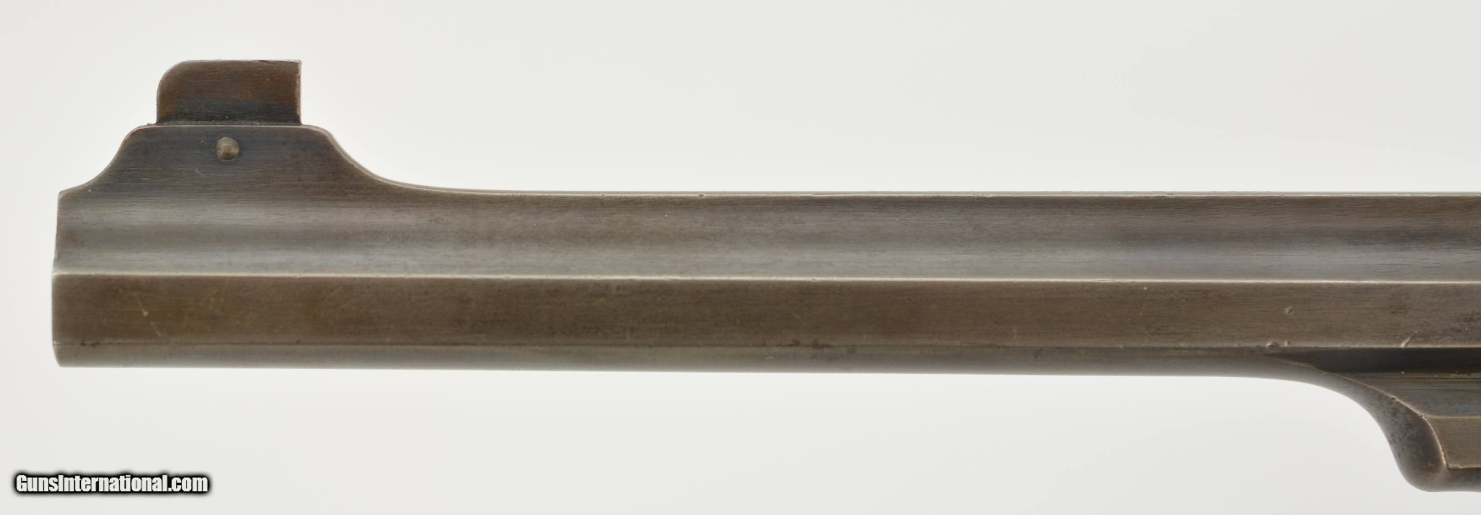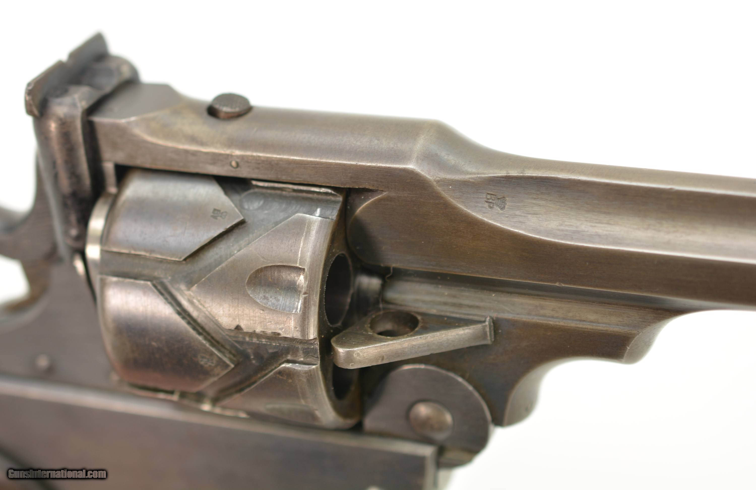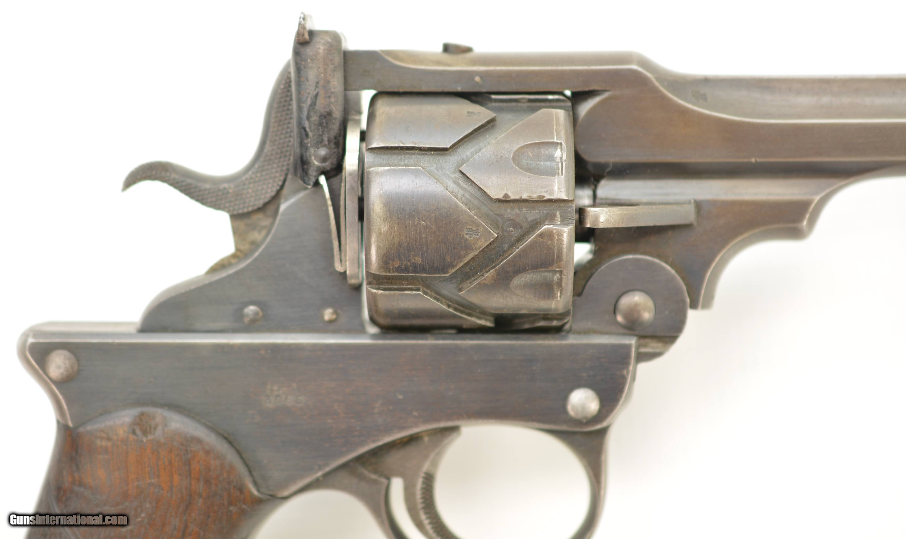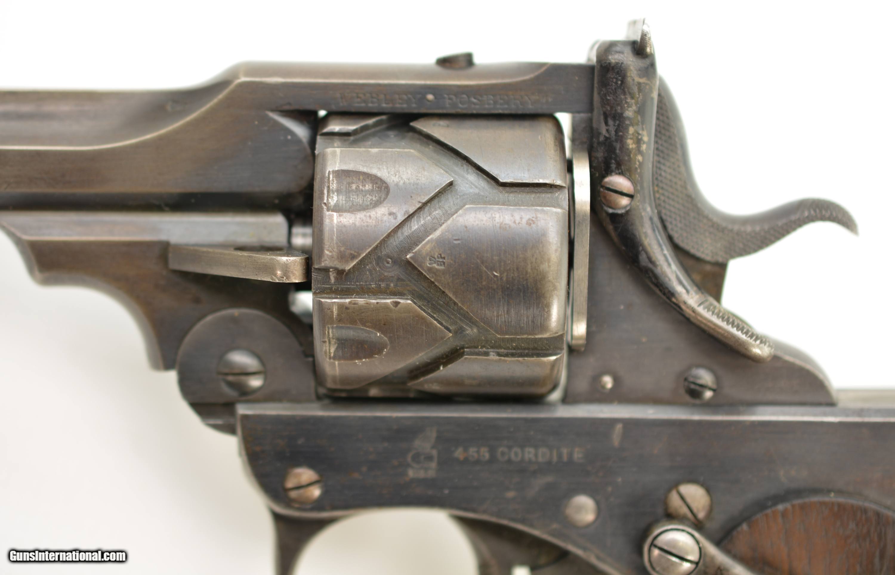 Description: Serial #3065, .455 Webley, 7 1/2" barrel with a fine, bright bore that has some mild freckling within the grooves. This is a handsome revolver that has retained 80-85% of the original blue that has faded to dark gray along the barrel and high edges. Silvering is present on the bearing surfaces of the frame rails, and there is gray metal along the gripstraps, which have an engraved name along the back: "H.C. LLOYD". The checkered walnut grips are in about very good shape with minor handling marks and blemishes on either side, as well as general flattening of the points. The right panel has some moderate bruises at the butt, and the locking stirrup has a flaked Suncorite finish. The lock-up is tight, and the revolver functions flawlessly. Army & Navy CSL records list this revolver as being sold to "Col. W.N. Lloyd, 3rd Welsh Brigade" on December 18, 1911. Wilford Neville Lloyd was born on September 15, 1855 at St. Johns, New Brunswick, Canada, to Col. Robert Clifford Lloyd of Losset, County Cavan. W.N. Lloyd was a keen cricketer, and for a time was the captain of the Royal Military Academy team. He obtained a commission in the Royal Artillery in 1876, and fought in the South African War of 1878-1879, where he was mentioned in despatches. In 1882, he was a temporary resident magistrate in Ireland, and, following his promotion to Captain in 1884, was requested to accompany the Sudan Expedition. In 1888, he was appointed Staff Captain for Royal Artillery for the Northern Military District (York); and in 1896 became the private secretary to the Duke of Westminster. He would’ve bought this revolver when he was Asst. QM-General for the Southern Command HQ, and later, Asst. to the Maj. General in Charge of Administration of the Southern Command. Evidently, the gun was given, or possibly inherited by his son: Sir Humphrey Clifford Lloyd, who was born on April 24, 1893 in London. Lloyd was educated at Eton and the Royal Military College, Sandhurst. He was commissioned a 2nd Lieutenant in the 1st Bn., King’s Royal Rifle Corps in 1913. He was severely wounded in the arm during an attack on German positions on the Aisne on September 14, 1914. He was mentioned despatches in June, 1915, and awarded the Military Cross. In 1915, upon his recovery, he was made Aide-de-Camp to the Viceroy of Ireland. The next year he was made Aide-de-Camp to General Lord Rawlinson, Cmdr. 4th Army, and was later transferred to the Royal Flying Corps. He served past the change from Royal Flying Corps to Royal Air Force, and retired as a Captain on October 17, 1923. Following his retirement, he became a Gentleman Usher for King George V; serving in this office until the reign of Queen Elizabeth II. He was in Queen Elizabeth’s Coronation procession, and led the Portcullis Pursuivant of Arms into Westminster Abbey. He was awarded the Commander of the Royal Victorian Order in 1953, and the Knight’s Commander of the Royal Victorian Order in 1962. He passed away in 1966. This is a splendid, double-identified Fosbery that is in very good-fine condition, and belonged to two very important British officers who served from Queen Victoria to Queen Elizabeth II. FFL or C&R SOLD Curio/Relic: Yes Manufacturer: Webley Model: Fosbery Serial Number: 3065 Caliber Info: .455 Gauge Info: .455 |