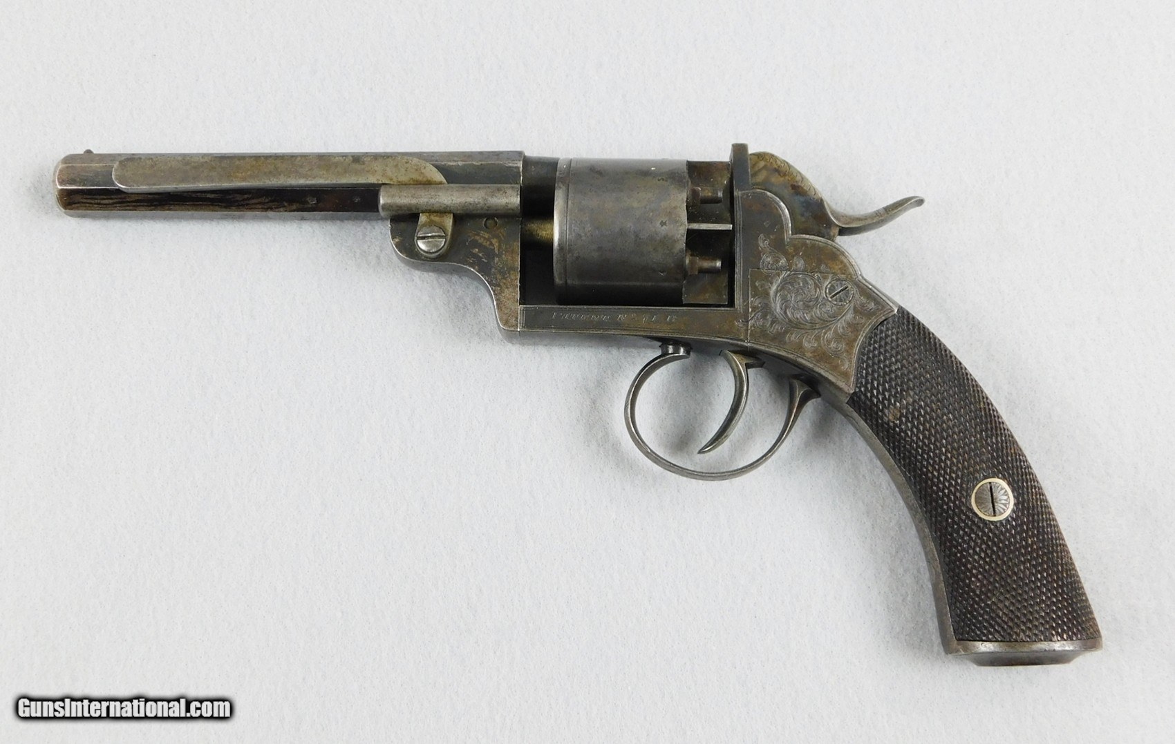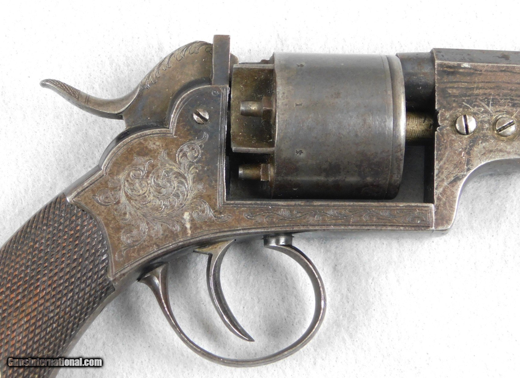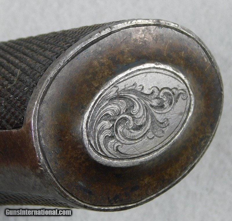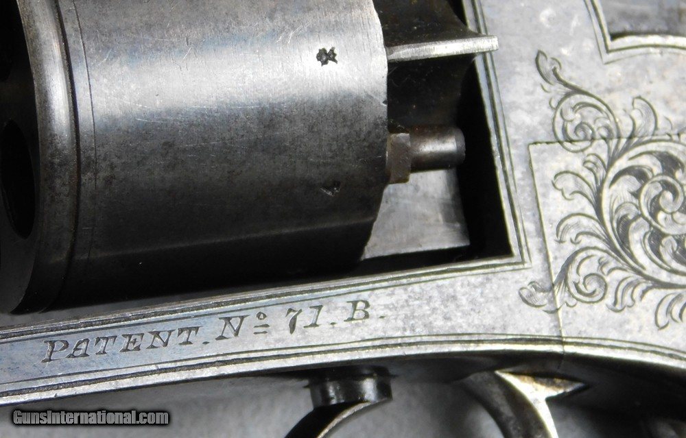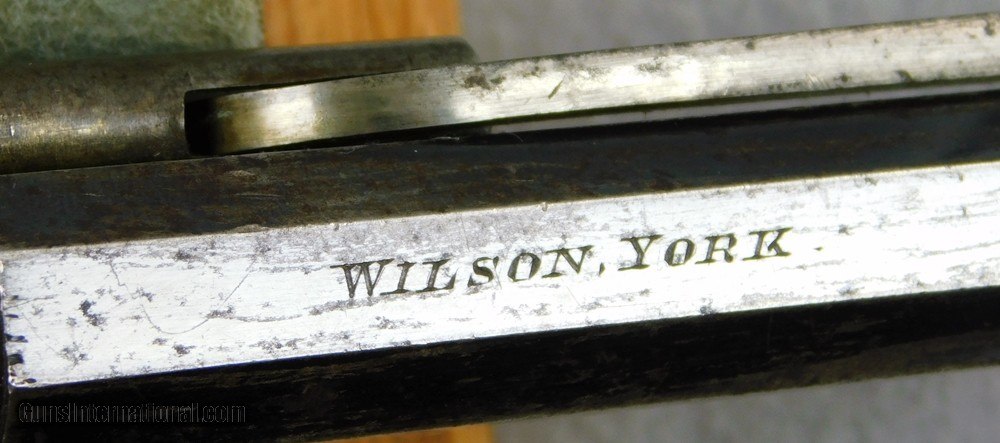 Description: This is a well-made Longspur Copy by Wilson of York England with Patent No. 71 B. It is a 5 shot single action 40 caliber percussion revolver with side-mounted rammer. The mechanical function and index is very good and the bore is very good bright and shiny with strong rifling. It retains 45% blue with nice engraving on the frame, hammer, trigger guard and butt cap. The grips are very good with sharp checkering. James Webley, Birmingham, England 1858-1864 exhibited Thomas Wilson’s patent breach loading .577-caliber breech-loading military rifles and carbines and sporting arms at the International Exhibition, London, 1862. I would consider trades for pre 1899 ANTIQUE PISTOLS and rifles on any of my items.. WHAT DO YOU HAVE TO TRADE? Ask about our 30-90 day lay-away program. We accept Bank Check, Money order, Personal checks or wire transfer. SOLD Antique: Yes |
