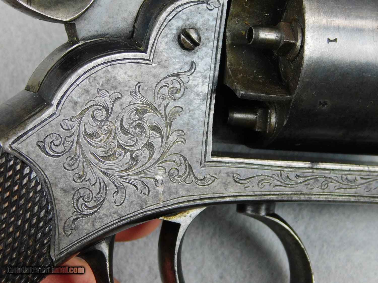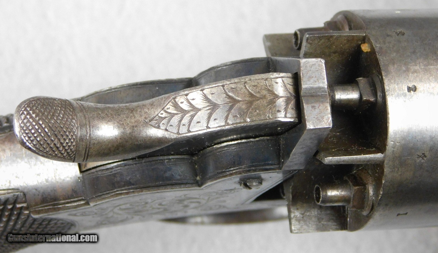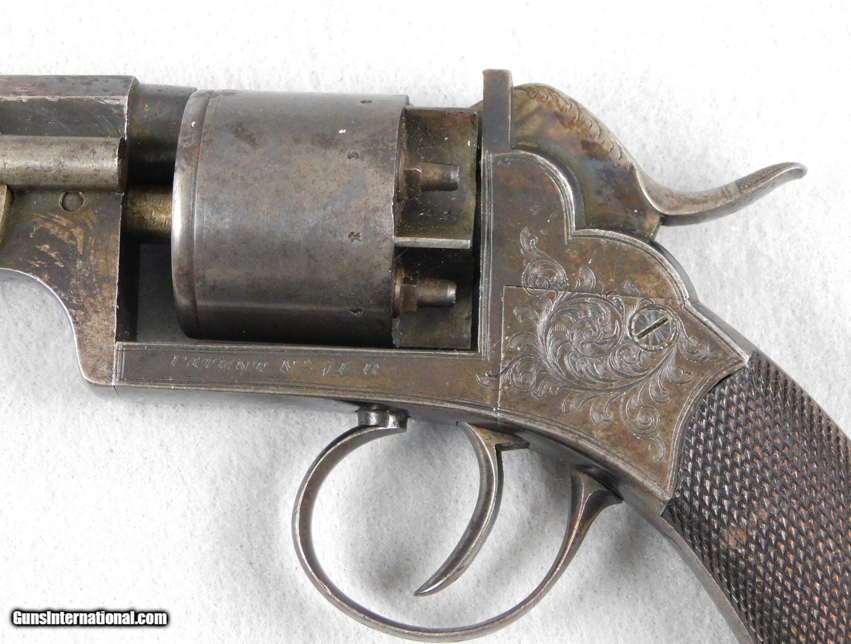 Description: This is a well-made Longspur Copy by Wilson of York England with Patent No. 71 B. It is a 5 shot single action 40 caliber percussion revolver with side-mounted rammer. The mechanical function and index is very good and the bore is very good bright and shiny with strong rifling. It retains 45% blue with nice engraving on the frame, hammer, trigger guard and butt cap. The grips are very good with sharp checkering. James Webley, Birmingham, England 1858-1864 exhibited Thomas Wilson’s patent breach loading .577-caliber breech-loading military rifles and carbines and sporting arms at the International Exhibition, London, 1862. I would consider trades for pre 1899 ANTIQUE PISTOLS and rifles on any of my items.. WHAT DO YOU HAVE TO TRADE? Ask about our 30-90 day lay-away program. We accept Bank Check, Money order, Personal checks or wire transfer. SOLD Antique: Yes |