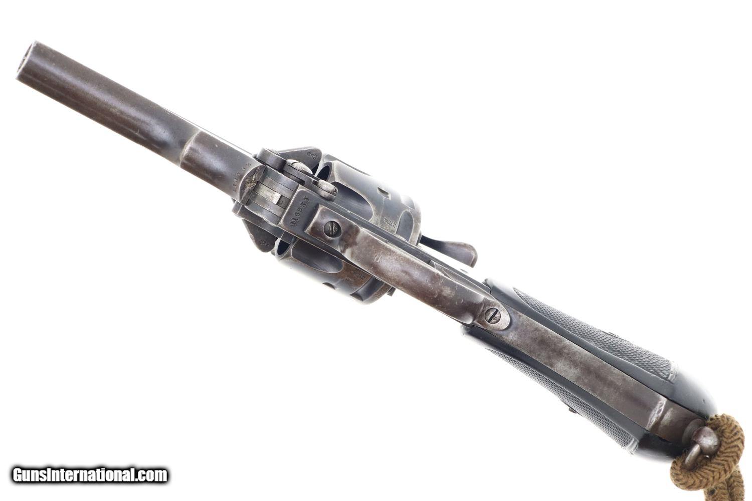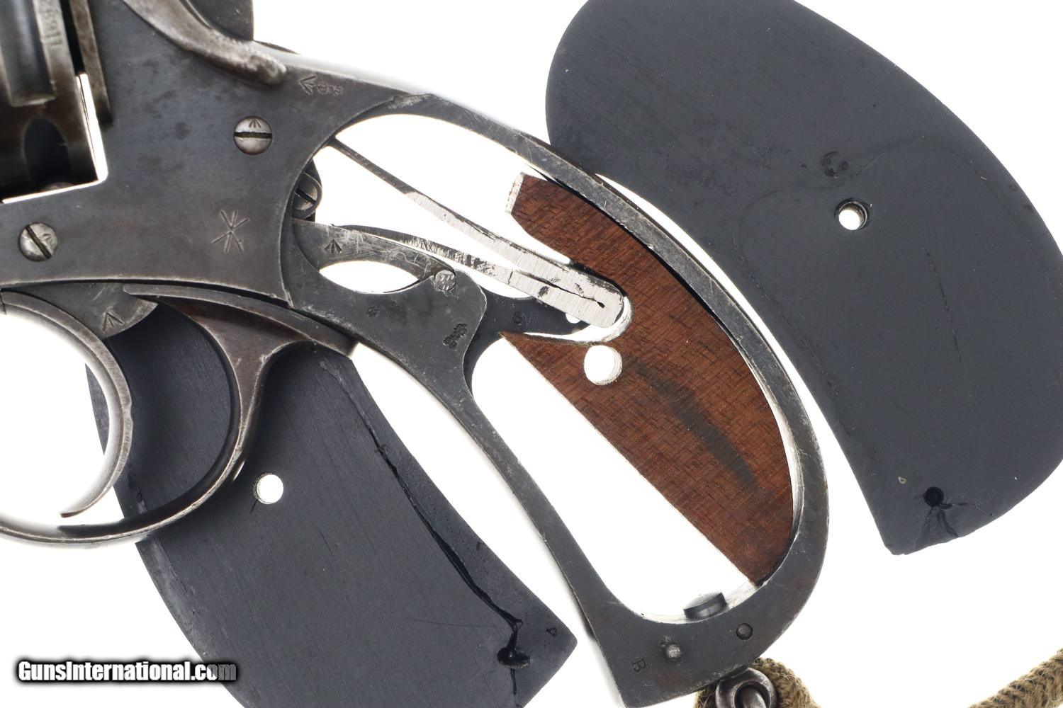 G/VG with extensive fading and toning as one might expect from a frequently carried service revolver. Added wood insert under grips that, while well fitting, are likely reproductions. EXC lanyard cord from a later era revolver. Near Mirror bore. Correct manual mechanics, each cylinder indexing properly upon deliberate cocking.
