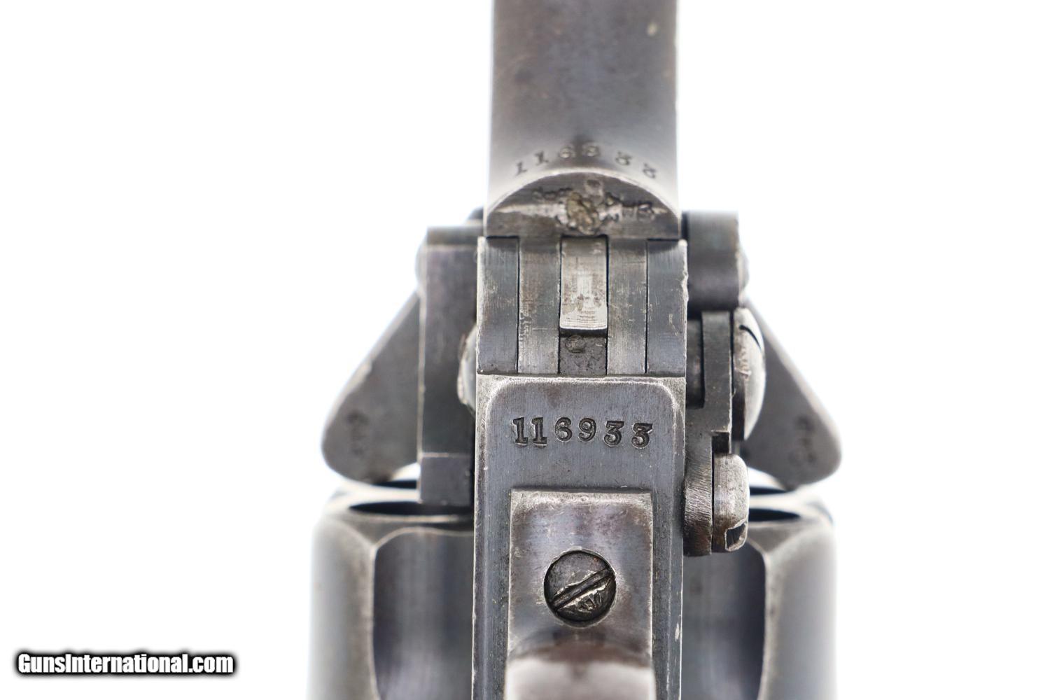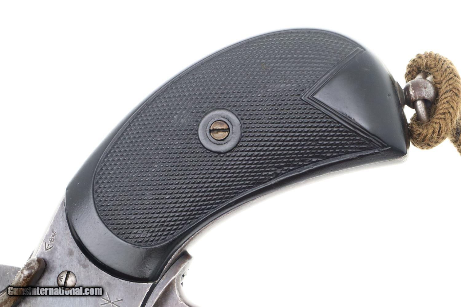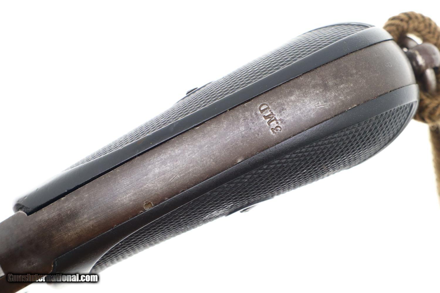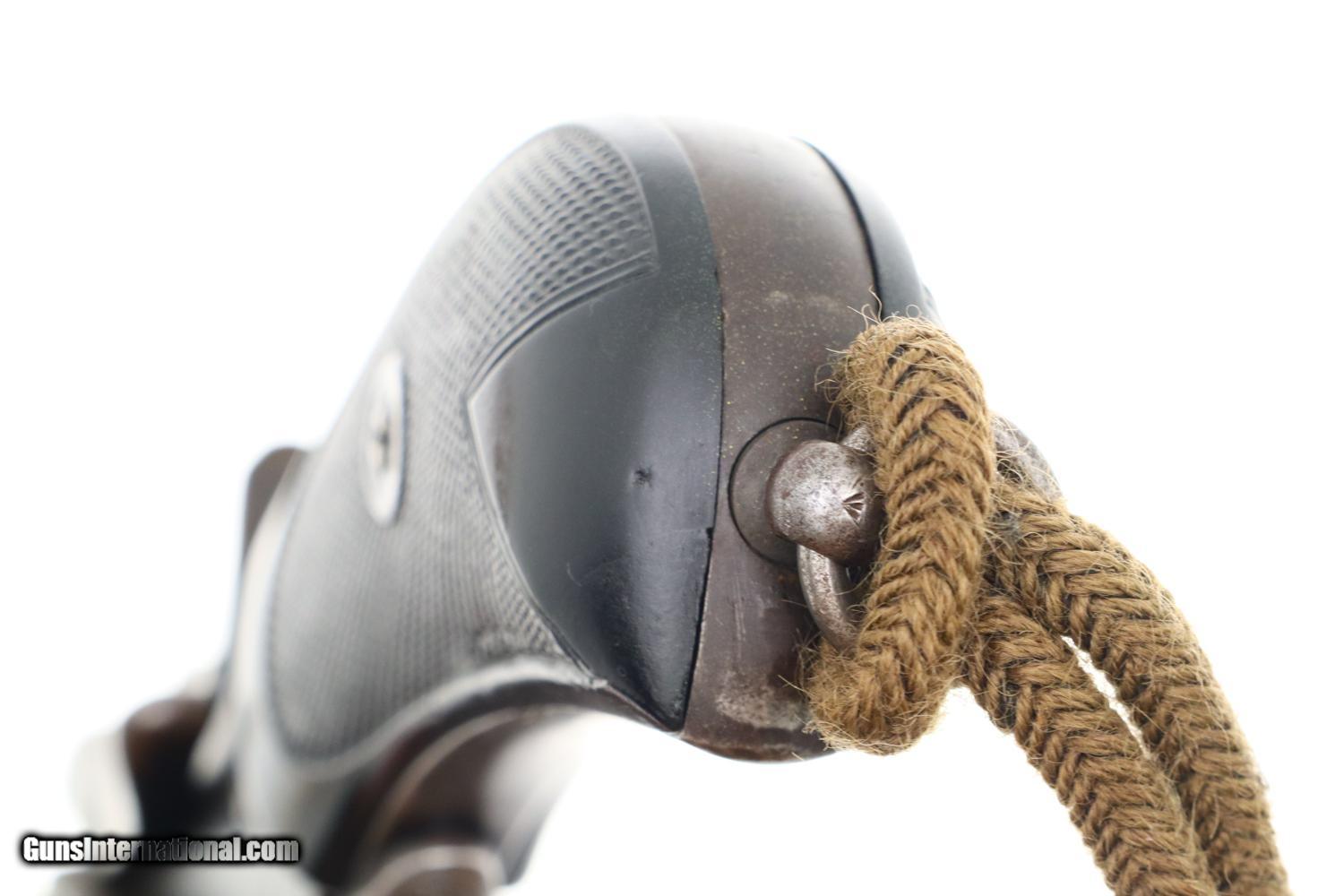 Description: Synopsis: Classic British Webley Mark IV Revolver with bird’s head grip, Cal .455, made 1899-1913, extensively used during the Boer War, sometimes referenced as the “Boer War Model”. Description: Typical WEBLEY MARK IV revolver, cal. .455, with bird’s head grip as issued to the British Military with 4” barrel and fixed front and rear sights. Top break. Model reference on left side of top-strap and repeated on left side of frame. Matching barrel, frame, and unshaved cylinder. Usual scattering of British proofs with testing reference on right side of barrel lug. Black checkered grips with bordering. Fitted with original khaki lanyard cord. Condition: G/VG with extensive fading and toning as one might expect from a frequently carried service revolver. Added wood insert under grips that, while well fitting, are likely reproductions. EXC lanyard cord from a later era revolver. Near Mirror bore. Correct manual mechanics, each cylinder indexing properly upon deliberate cocking. SOLD Manufacturer: Webley Model: MK IV Serial Number: 116933 Caliber Info: 0.38 Condition: G/VG |