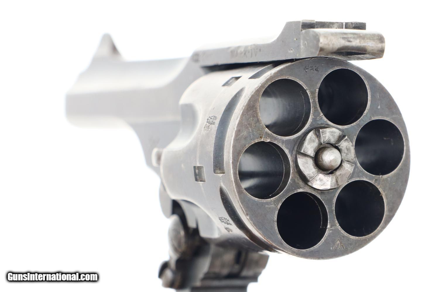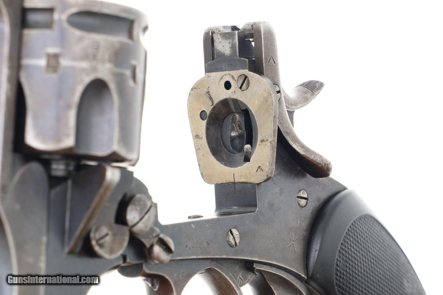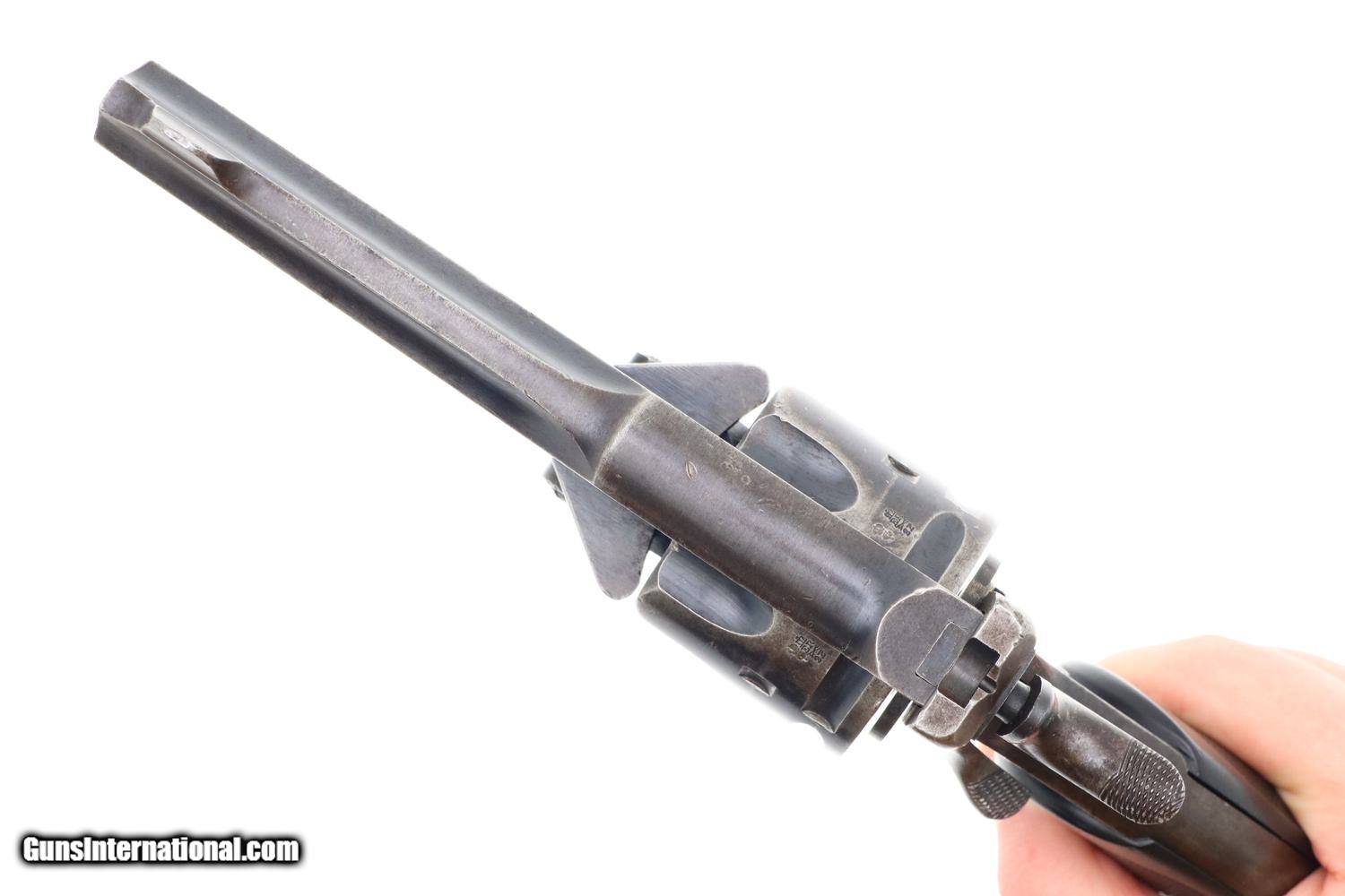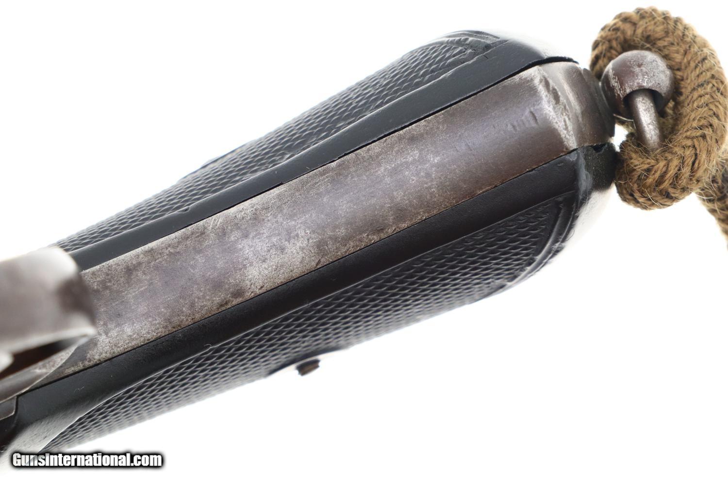 Description: Synopsis: Classic British Webley Mark IV Revolver with bird’s head grip, Cal .455, made 1899-1913, extensively used during the Boer War, sometimes referenced as the “Boer War Model”. Description: Typical WEBLEY MARK IV revolver, cal. .455, with bird’s head grip as issued to the British Military with 4” barrel and fixed front and rear sights. Top break. Model reference on left side of top-strap and repeated on left side of frame. Matching barrel, frame, and unshaved cylinder. Usual scattering of British proofs with testing reference on right side of barrel lug. Black checkered grips with bordering. Fitted with original khaki lanyard cord. Condition: G/VG with extensive fading and toning as one might expect from a frequently carried service revolver. Added wood insert under grips that, while well fitting, are likely reproductions. EXC lanyard cord from a later era revolver. Near Mirror bore. Correct manual mechanics, each cylinder indexing properly upon deliberate cocking. SOLD Manufacturer: Webley Model: MK IV Serial Number: 116933 Caliber Info: 0.38 Condition: G/VG |