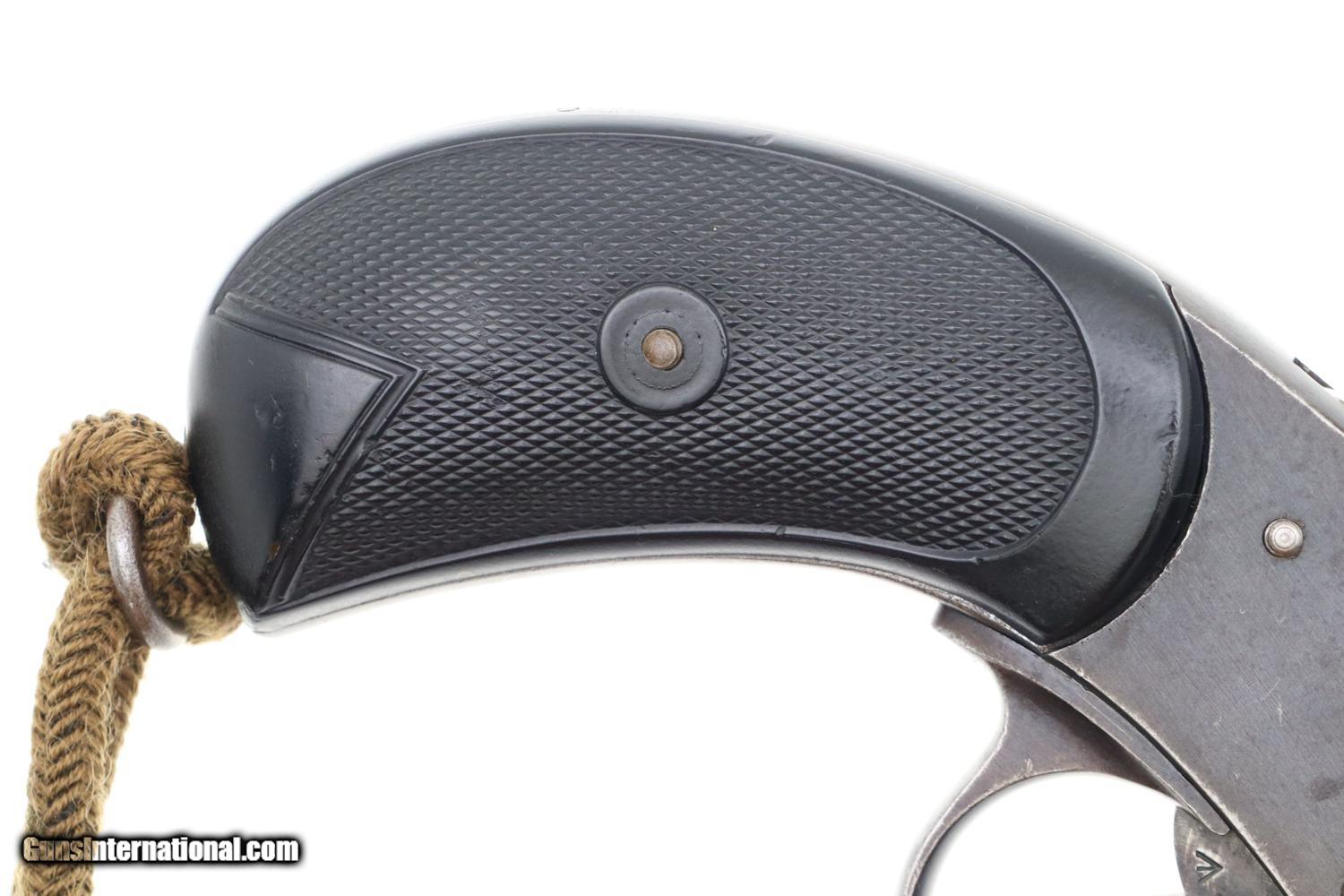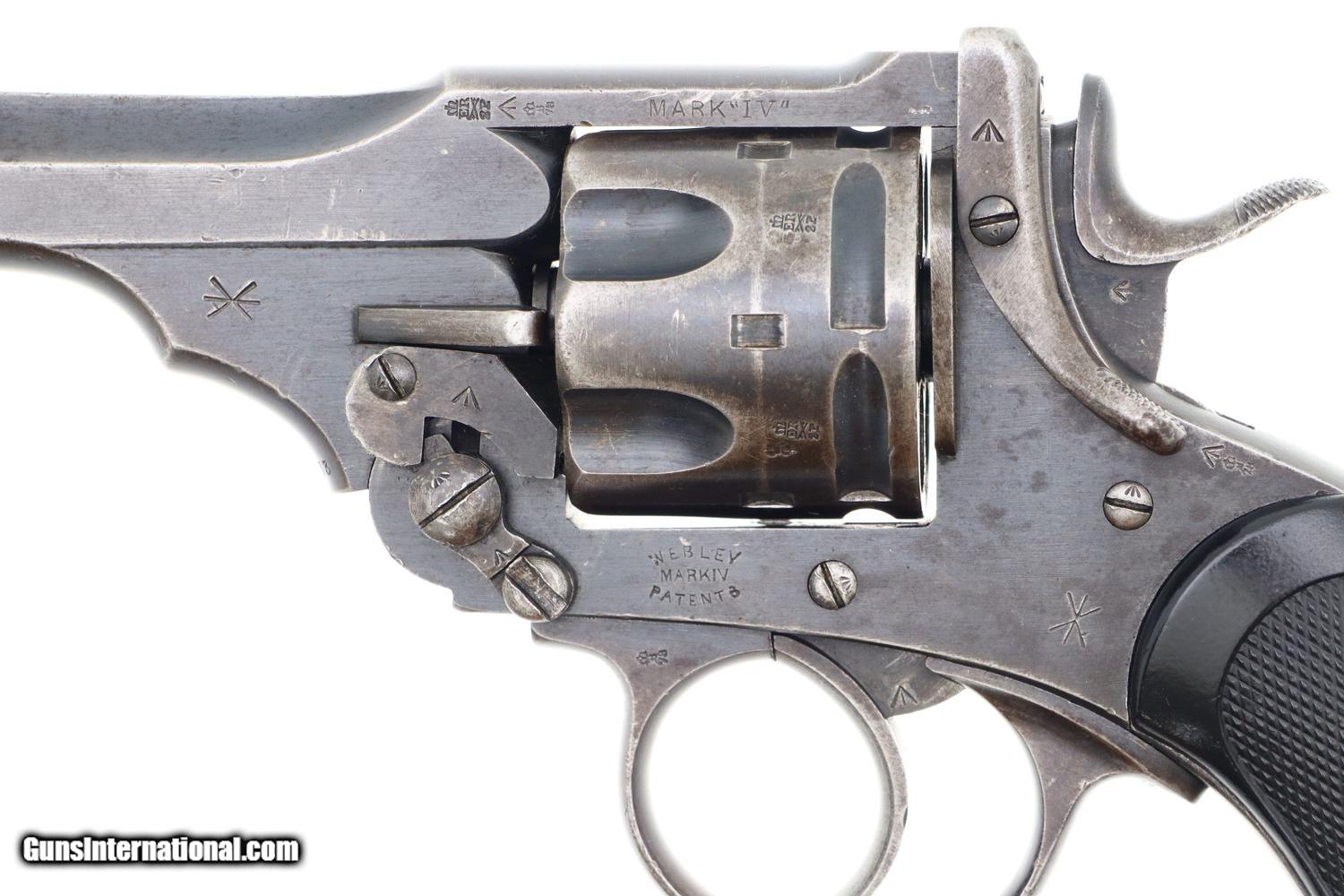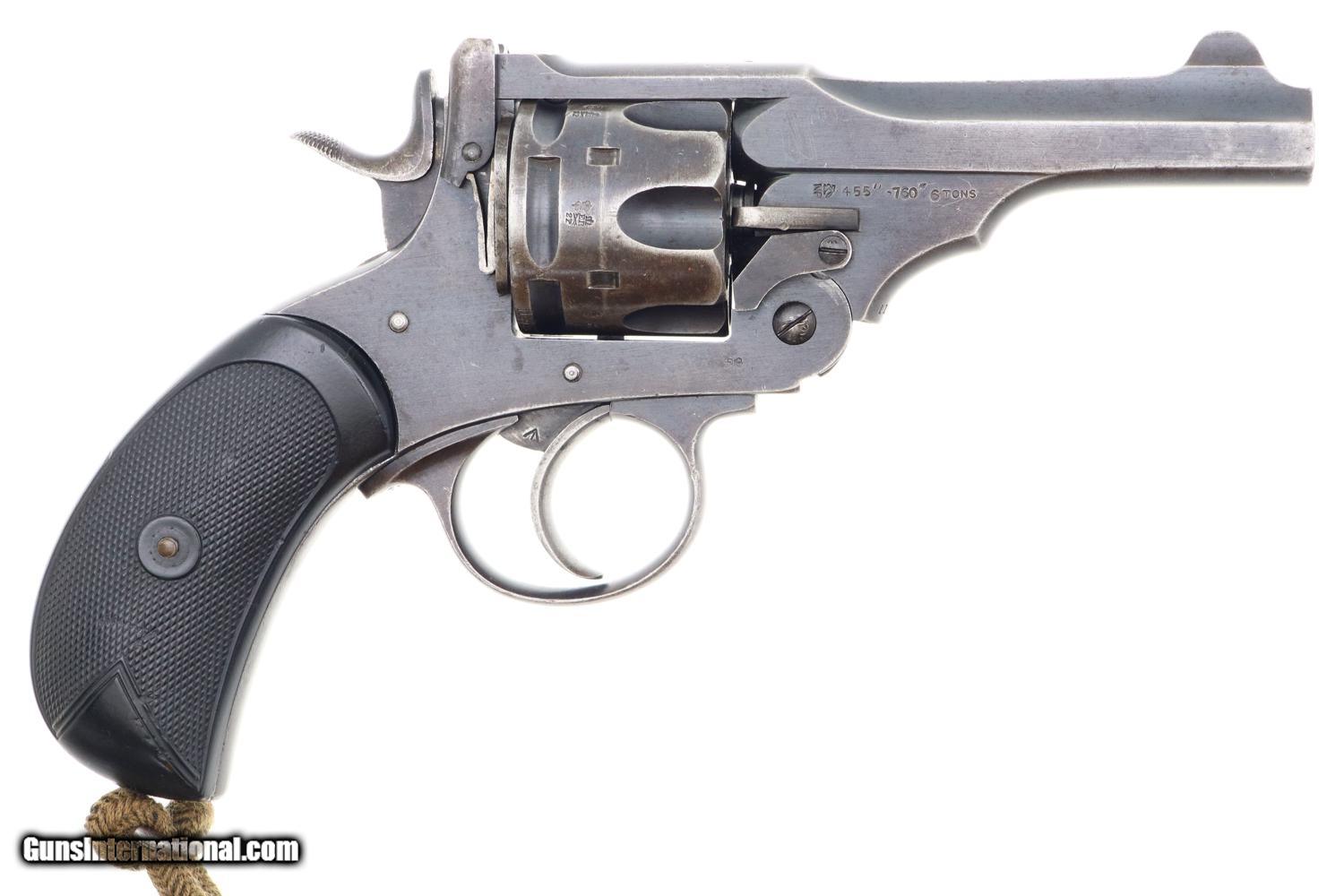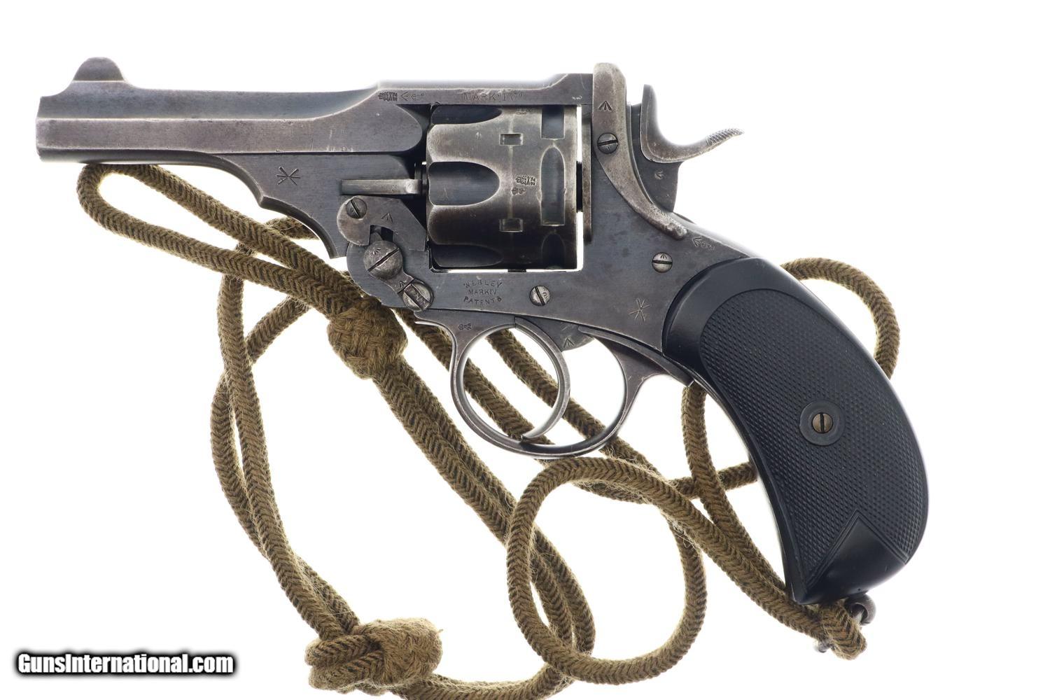Typical WEBLEY MARK IV revolver, cal. .455, with bird’s head grip as issued to the British Military with 4” barrel and fixed front and rear sights. Top break. Model reference on left side of top-strap and repeated on left side of frame. Matching barrel, frame, and unshaved cylinder. Usual scattering of British proofs with testing reference on right side of barrel lug. Black checkered grips with bordering. Fitted with original khaki lanyard cord.