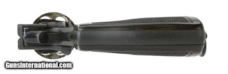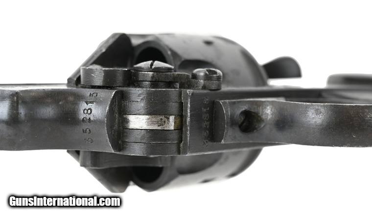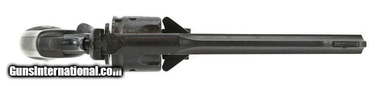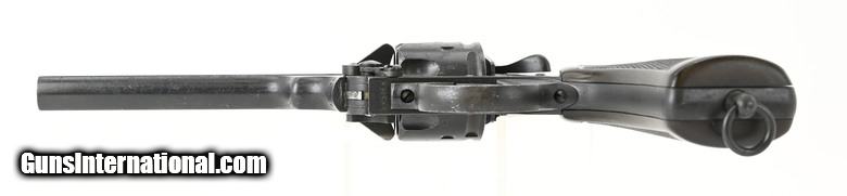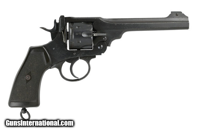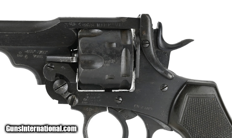Webley Mark VI .45 ACP caliber revolver. Webley 6” barrel. British WWI Service revolver. Bore is perfect. Action works perfectly. Revolver has approximately 95% blue/ black finish. Grips are excellent. No chips, no cracks. Note: The rear of the cylinder has been milled down to accept the .45 ACP round using Halfman grips. All military marking are sharp and clear.