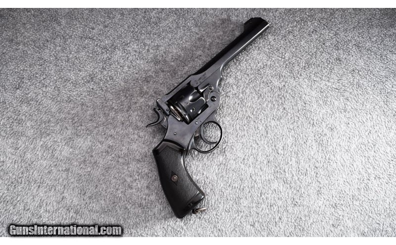 Description: This Webley Mark VI in .455 Webley remains in very good condition. It does show some blue wear on the high edges, near the muzzle and on the bottom of the trigger guard. Serial numbers match and a patent date of 1917 is stamped on the frame under the cylinder. Several proof marks are shown in the photographs. The Mark VI was first introduced in 1915. This is a top break revolver. A very nice collector's piece. No box or other accessories included. None SOLD Metal Condition: Very Good Bore Condition: Very Good Barrels: 6 Triggers: Factory DA / SA Butt Pad: Checkered Two Panel Grips Weight: 36 Oz Sights: Blade Front - U Notch Rear Item Location: Wheeling |