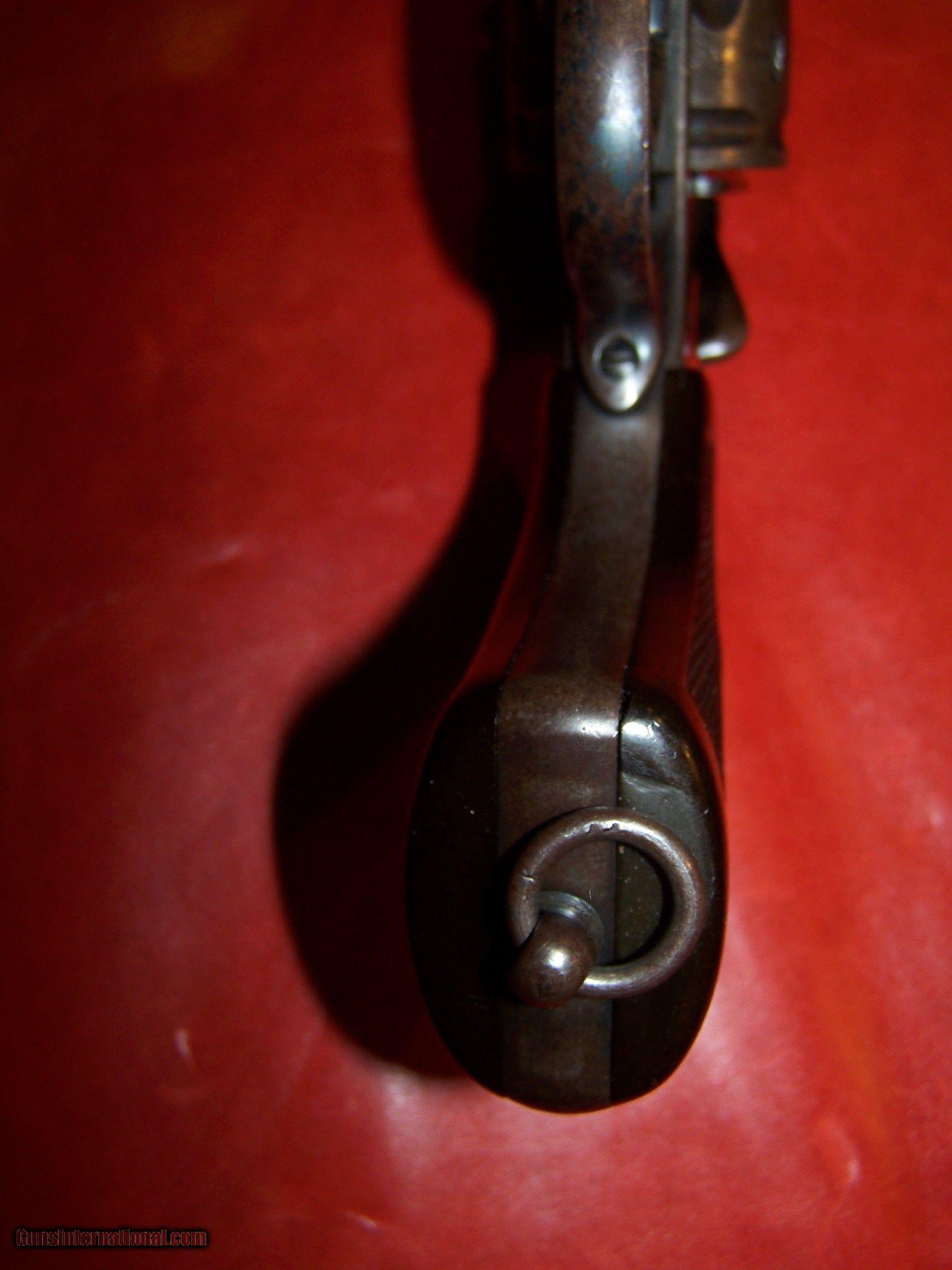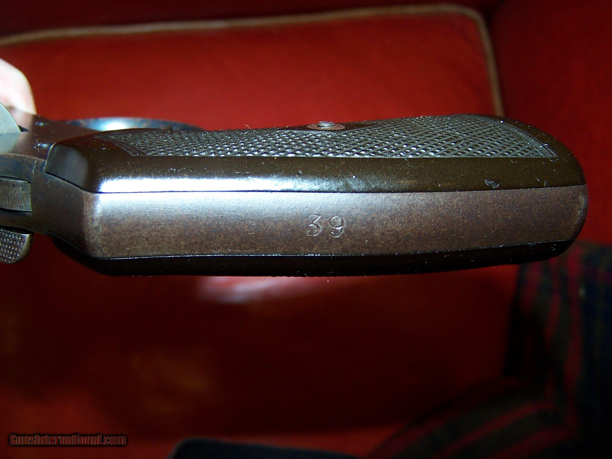 Description: WEBLEY large frame revolver MARK VI World War I dated 1915 All original including original .455 cylinder (NOT shaved down to chamber .45 ACP thereby shaving off half of the S/N on cylinder and ruining the gun for an authentic WWI pistol collection) Overall a pleasing patina - no damage, no rust. All matching S/N 161320 (cylinder, frame, and barrel) Black plastic grips virtually mint , no cracks or chips. Lanyard ring intact and original. Marked on left frame below cylinder "WEBLEY / MARK VI / PATENTS / 1915 Loaded with broad arrow proofs. All screws original and not boogered (I saw a photo of a Webley with a Phillips head screw!) Bore bright and shiny) I do not know what the "39" on the back strap is, may be an unit marking number - not part of the S/N. Mechanicaly perfect except for a slight cylinder loseness. You can buy cheaper shooters, but if you want an as-issued military hand-gun for an authentic WWI collection, this is it ! SOLD Curio/Relic: Yes |