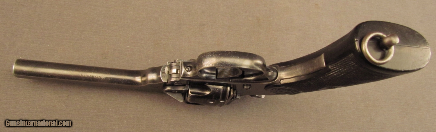 Description: Serial #A38277, .38/200 (.38 S&W), 5” barrel with an excellent, bright bore. This is a Birmingham proofed revolver that has a retained 92-95% of the original blue finish and has the rear of the frame knuckle marked: “SPF/120” (Singapore Police Force). There is a small import stamp on the underside of the barrel, but all numbers match on the frame, cylinder, and barrel. The checkered black “Webley” composite grips are in good shape with light wear and flattening of the points on both panels, as well as a few minor bruises along the flare of the butt on both sides. The lock-up is still tight, although there is a small amount of lateral play in the barrel, and the action functions flawlessly. This is a very good example of a police-used Webley and would make a nice addition to any collection. FFL or C&R SOLD Curio/Relic: Yes Manufacturer: Webley Model: MkIV Serial Number: A38277 Caliber Info: .38 S&W Gauge Info: .38 S&W |