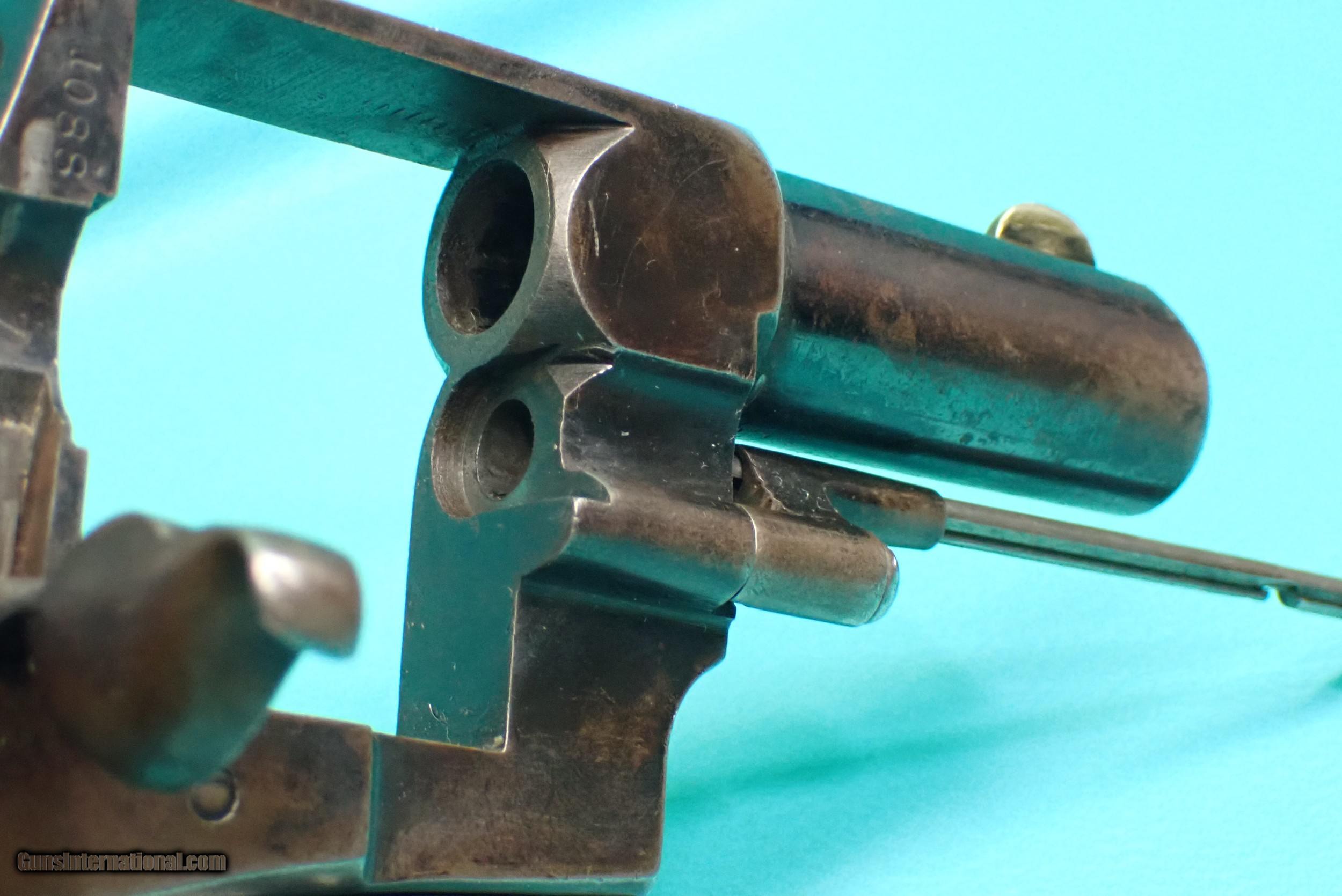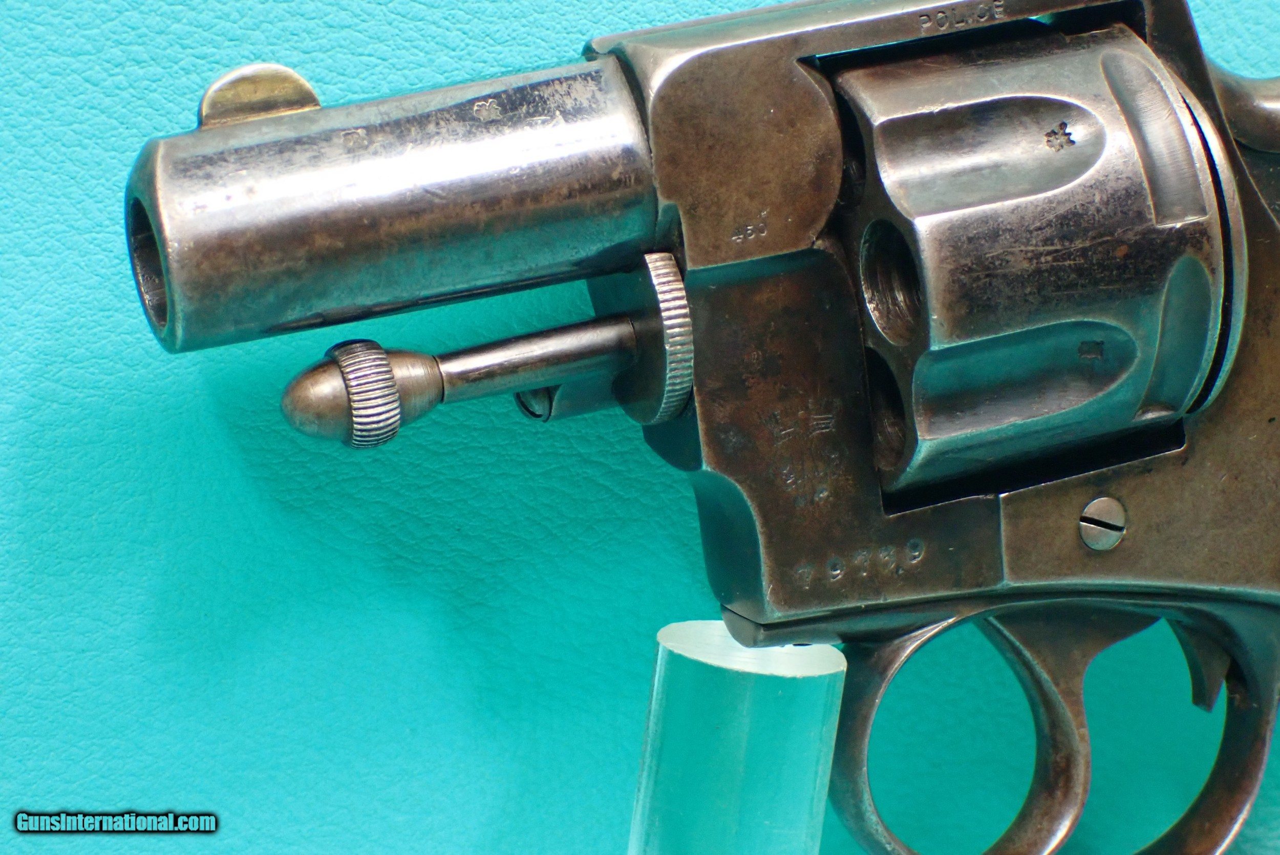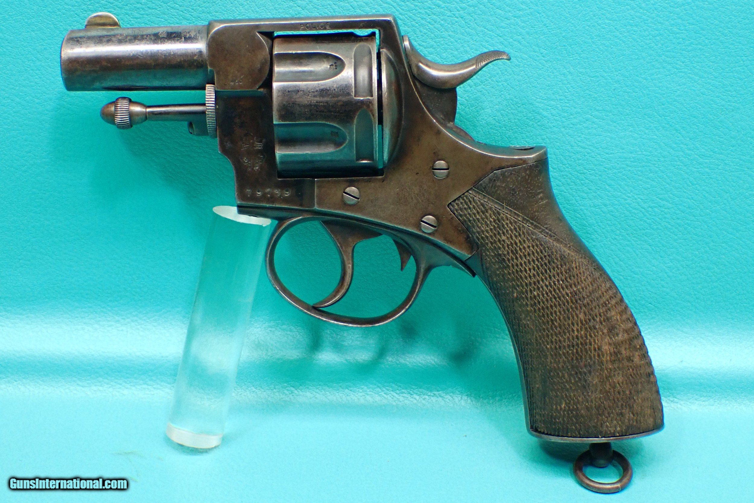 Description: ***SOLD *** P. Webley & Son Metropolitan Police .450 Adams 2 1/2" barrel blued revolver. The revolver has a rack number of 1088 which makes it part of the 3rd of 5 groups released. The revolver features double/single action firing, 6 shot cylinder capacity, checkered wood grips, fluted cylinder, lanyard loop, half moon front sight, and acorn extractor. The finish is bright in spots with some wear in the contact areas. The revolver functions as it should with proper timing and lockup. The grips have a small stress crack on the top as well as a crack in the bottom which the photos show. The cylinder has smooth chambers. The barrel has sharp rifling with a very small amount of rougher spots. Awesome for anyone who collects police firearms or English revolvers! Please refer to the photos for the overall condition. FFL required. Shipping $35.00 SOLD Handgun Caliber: .450 Revolver (.450 Adams) Manufacturer: Webley Model: Metropolitan Police Serial Number: 79739 |