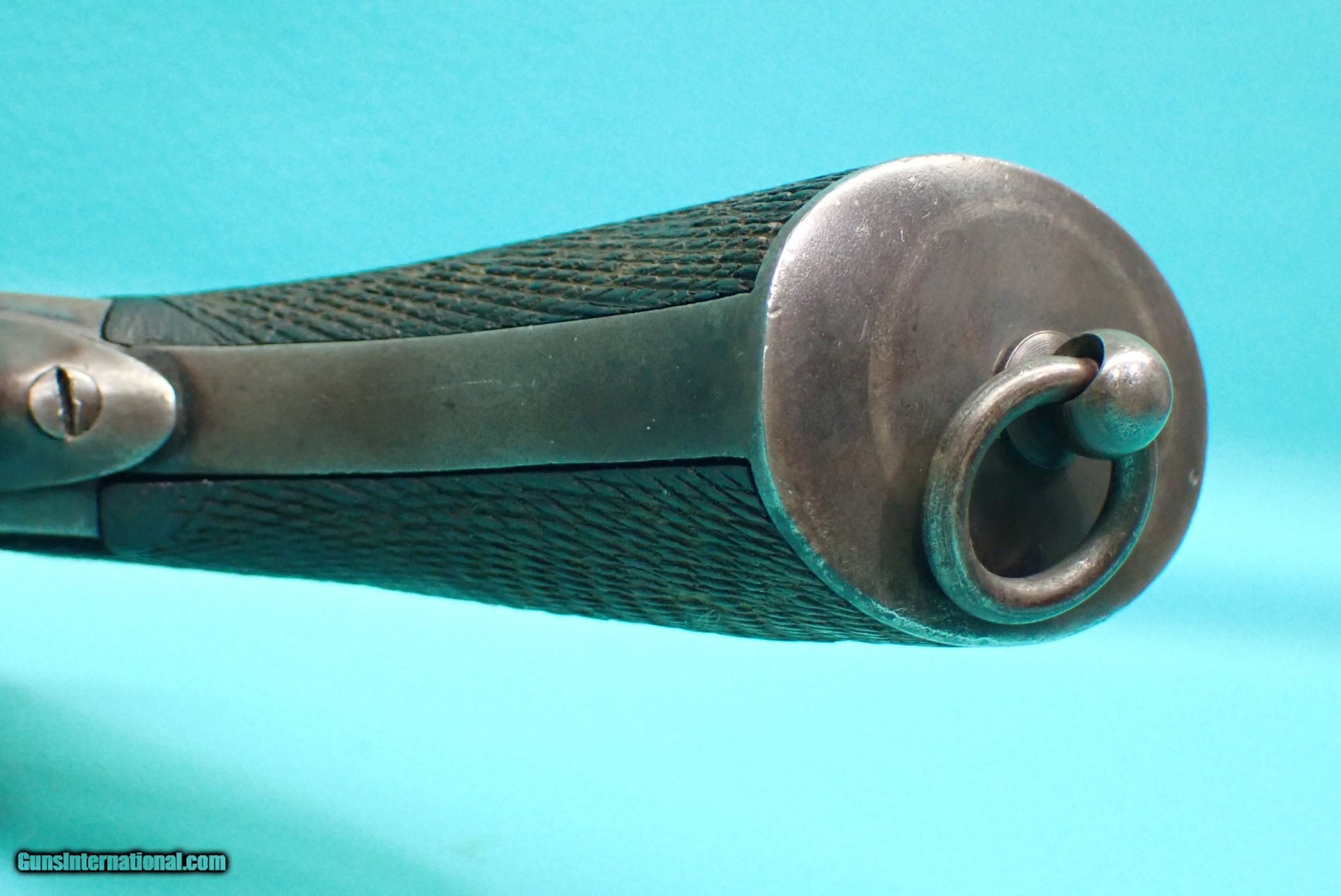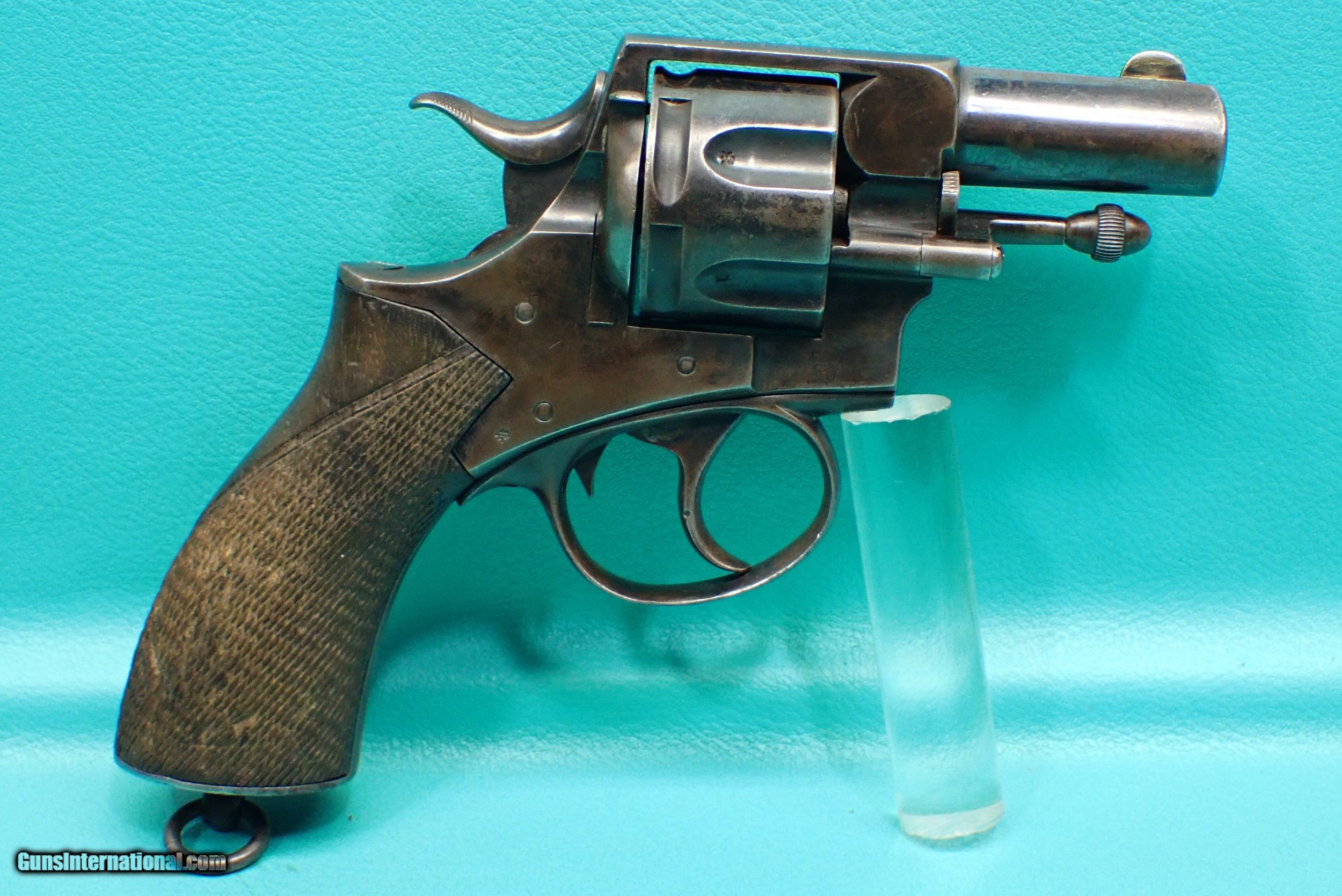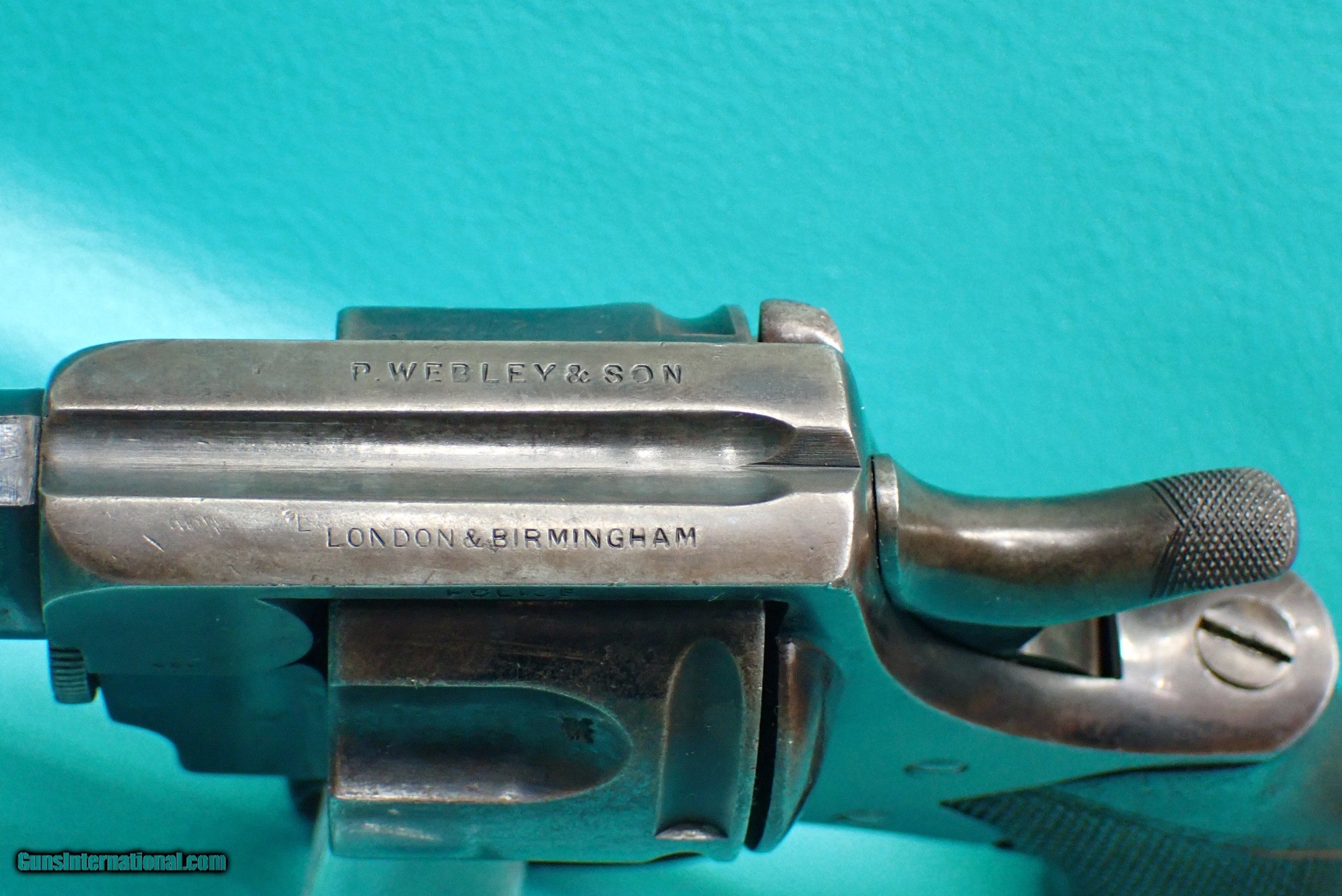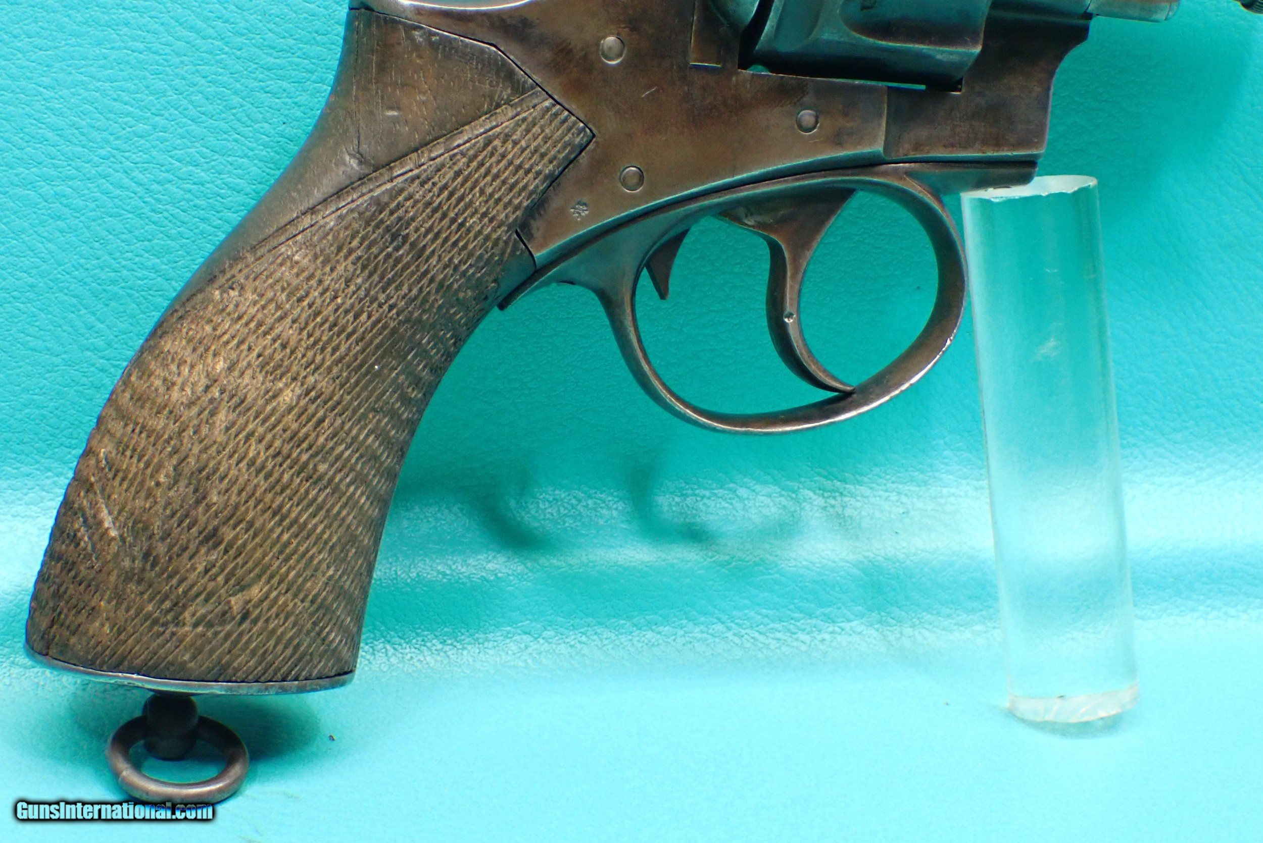 Description: ***SOLD *** P. Webley & Son Metropolitan Police .450 Adams 2 1/2" barrel blued revolver. The revolver has a rack number of 1088 which makes it part of the 3rd of 5 groups released. The revolver features double/single action firing, 6 shot cylinder capacity, checkered wood grips, fluted cylinder, lanyard loop, half moon front sight, and acorn extractor. The finish is bright in spots with some wear in the contact areas. The revolver functions as it should with proper timing and lockup. The grips have a small stress crack on the top as well as a crack in the bottom which the photos show. The cylinder has smooth chambers. The barrel has sharp rifling with a very small amount of rougher spots. Awesome for anyone who collects police firearms or English revolvers! Please refer to the photos for the overall condition. FFL required. Shipping $35.00 SOLD Handgun Caliber: .450 Revolver (.450 Adams) Manufacturer: Webley Model: Metropolitan Police Serial Number: 79739 |