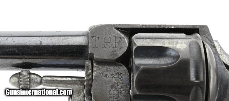 Webley RIC No 1 .442 .T.P.F (Toronto Police Force) T.P.F No 425. Bore is mirror bright. Action works perfectly. Revolver has approximately 80% bright original blue. Grips are excellent. Barrel length 3 ½”. Note: Bruce and Reinharts Book Webley Revolvers states on page 67 that 36 revolvers were ordered by the Toronto Police Force on April 14, 1913 and were numbered 461 to 496. This revolver is numbered 425 possibly the first.