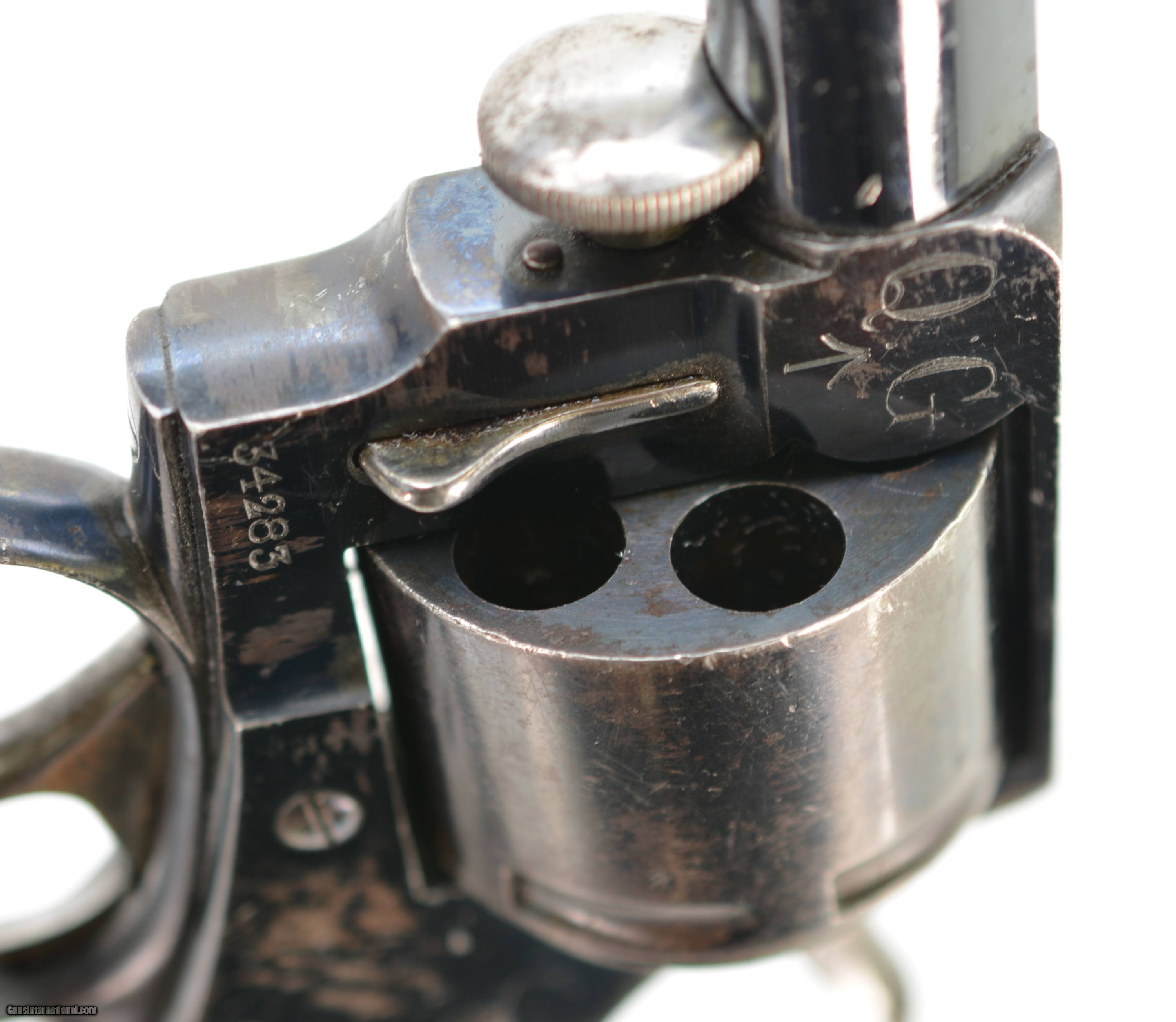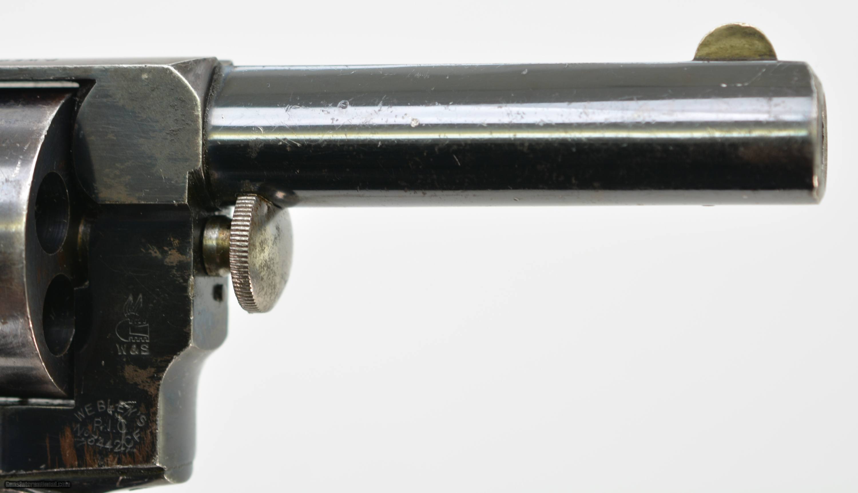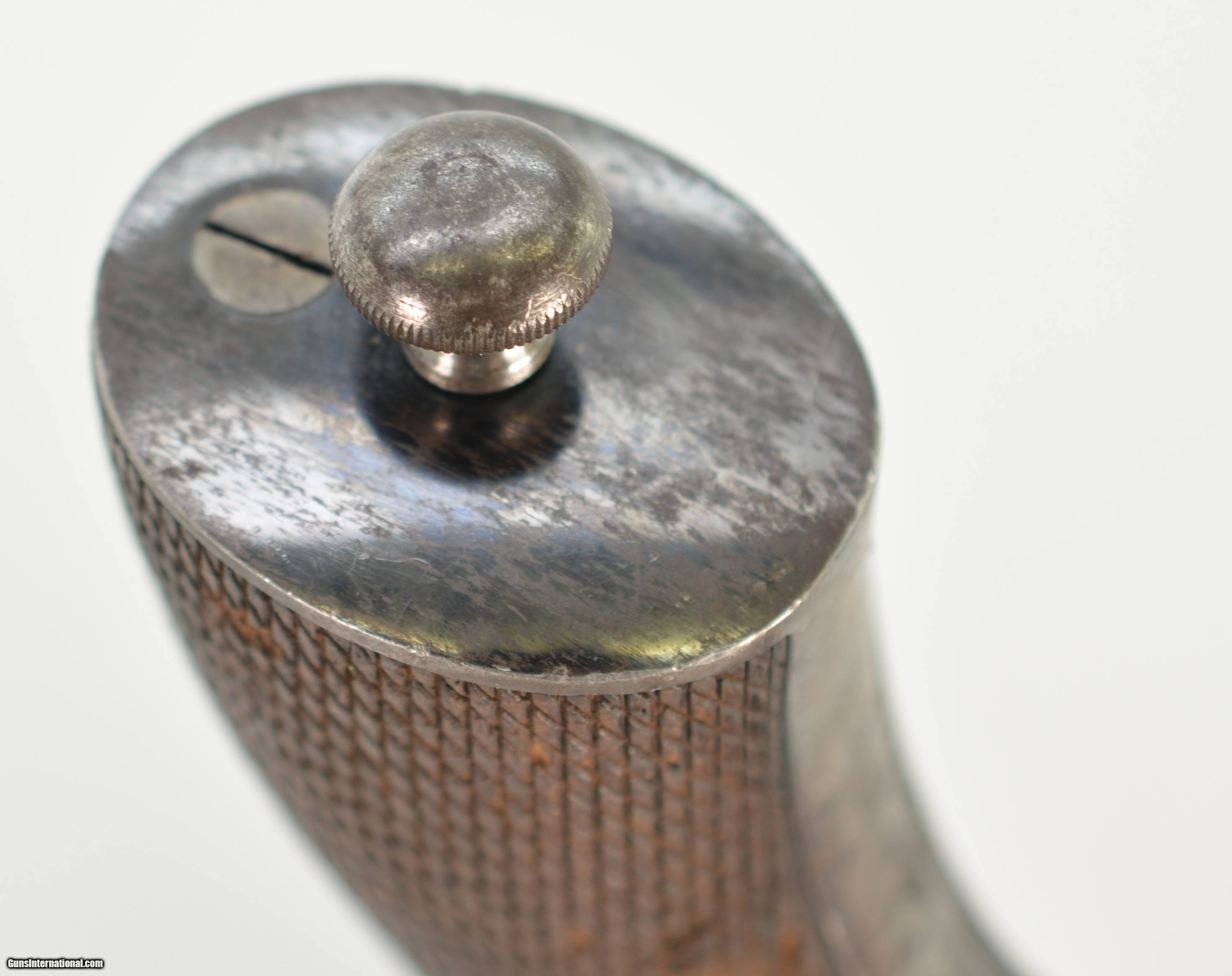 Description: Serial #34283, .442 CF, 4" barrel with a fine, bright bore that has some mild freckling within the grooves. This is a handsome revolver that has retained 90-95% of the original bright blue finish with scattered small surface scratches, and some small areas of flaking with plum-brown freckling where the finish is gone. The hammer, trigger, and cylinder pin have most of their original arsenal bright finish remaining, with some mild freckling along the edges. The topstrap is marked: “P. WEBLEY & SON / BIRMINGHAM"; the right side of the frame has the Webley “Winged Bullet" trademark; as well as a large Queensland Government property mark engraved onto the left side of frame: “QG / (Broad Arrow)". The checkered walnut grip is in very good shape with flattening of the points and scattered bruises marring the oil finish. This very revolver is illustrated on page 76 of “Webley Revolvers" by Bruce and Reinhart (1988), as well as on page 175 of “Webley Solid Frame Revolvers – Models RIC, MP, and No. 5" by Black, Davis, and Michaud (2010). This is a very good example of an Australian military-marked RIC revolver that has been published in two of the most respected Webley reference books. Antique SOLD Antique: Yes Manufacturer: Webley Model: RIC Serial Number: 34283 Caliber Info: .442 Gauge Info: .442 |