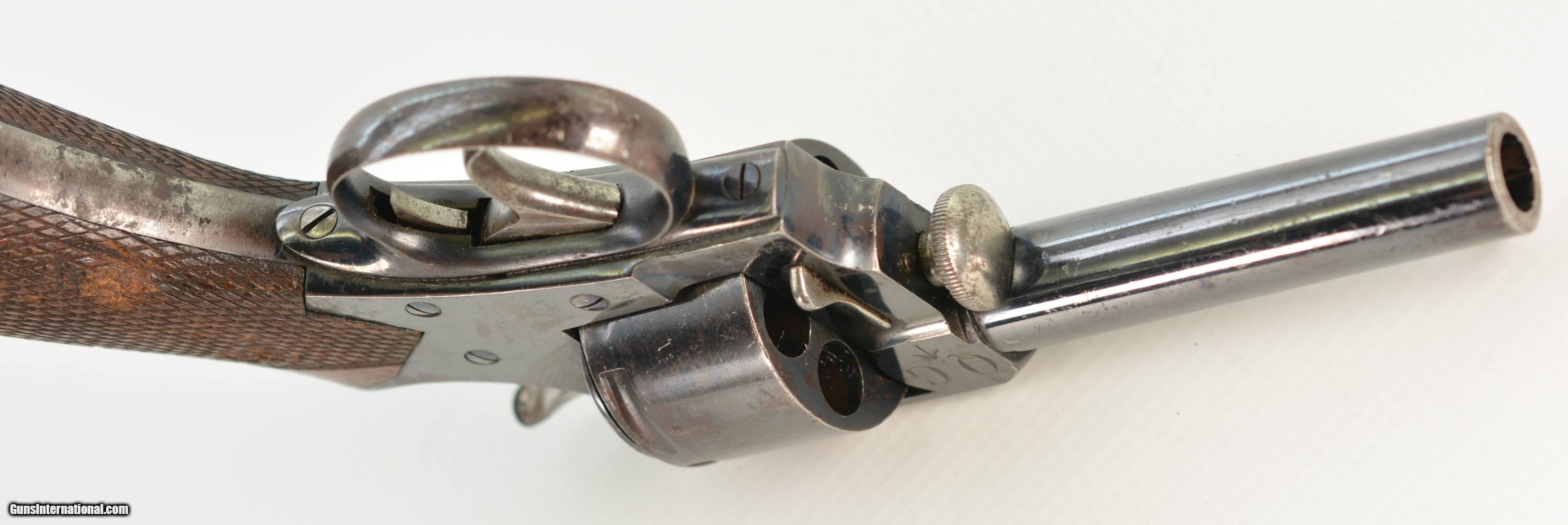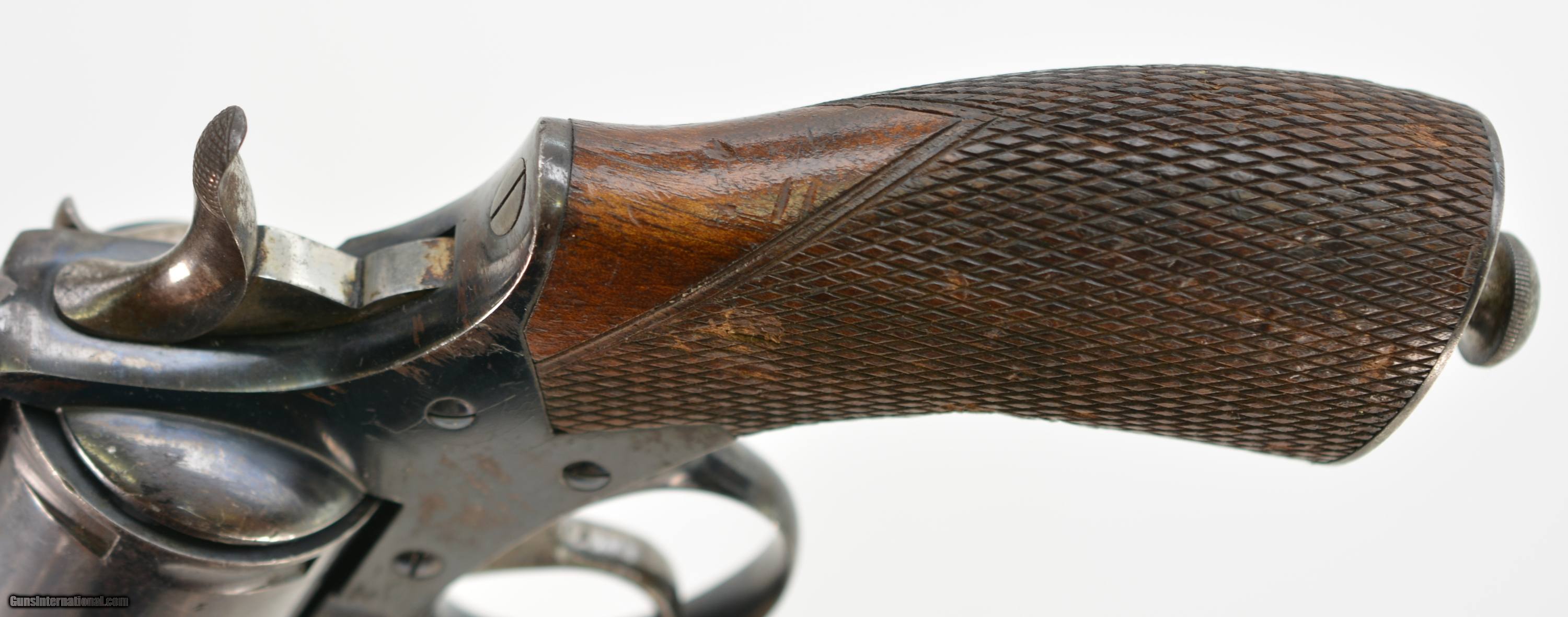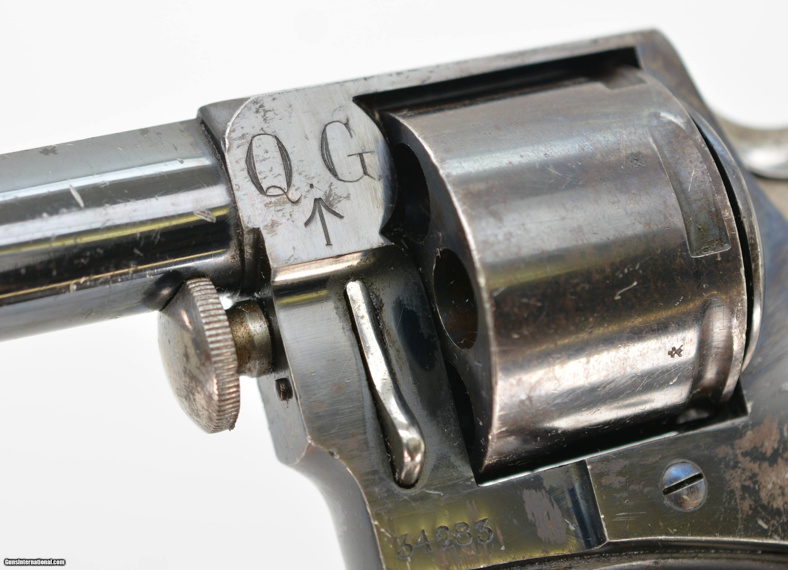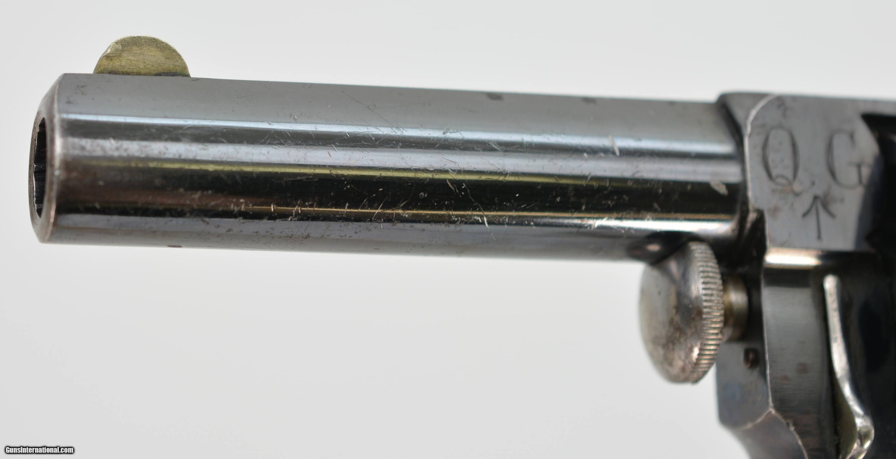 Description: Serial #34283, .442 CF, 4" barrel with a fine, bright bore that has some mild freckling within the grooves. This is a handsome revolver that has retained 90-95% of the original bright blue finish with scattered small surface scratches, and some small areas of flaking with plum-brown freckling where the finish is gone. The hammer, trigger, and cylinder pin have most of their original arsenal bright finish remaining, with some mild freckling along the edges. The topstrap is marked: “P. WEBLEY & SON / BIRMINGHAM"; the right side of the frame has the Webley “Winged Bullet" trademark; as well as a large Queensland Government property mark engraved onto the left side of frame: “QG / (Broad Arrow)". The checkered walnut grip is in very good shape with flattening of the points and scattered bruises marring the oil finish. This very revolver is illustrated on page 76 of “Webley Revolvers" by Bruce and Reinhart (1988), as well as on page 175 of “Webley Solid Frame Revolvers – Models RIC, MP, and No. 5" by Black, Davis, and Michaud (2010). This is a very good example of an Australian military-marked RIC revolver that has been published in two of the most respected Webley reference books. Antique SOLD Antique: Yes Manufacturer: Webley Model: RIC Serial Number: 34283 Caliber Info: .442 Gauge Info: .442 |