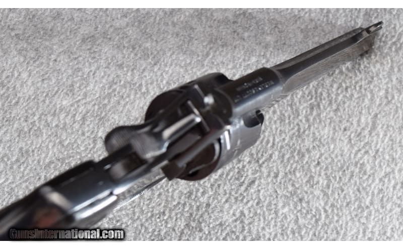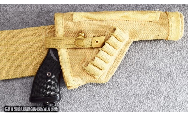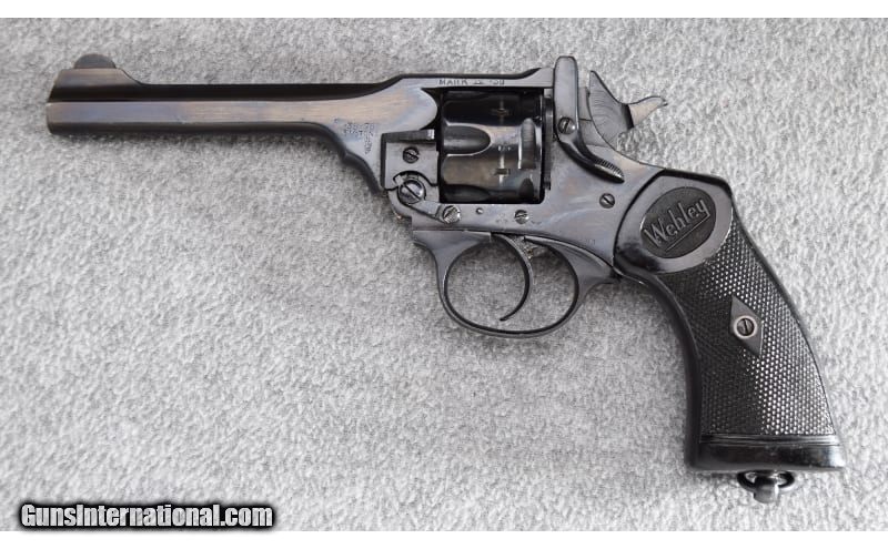 Description: This Webley & Scott Ltd. Mark IV was manufactured in Birmingham England in 1942. Gun is marked "War Finish" on right receiver under cylinder. May be an older reblue. Still traces of cosmoline in hard to reach places. Bore is excellent. Light cylinder wear with some light wear from holster. Complete with heavy canvas holster. .38 S&W SOLD Curio/Relic: Yes Metal Condition: Very Good Bore Condition: Excellent Barrels: 5 Triggers: Factory Butt Pad: Checkered Black Hard Rubber Webley Grips Weight: 26 oz. Sights: Blade Front - Notched Rear Item Location: Wheeling |