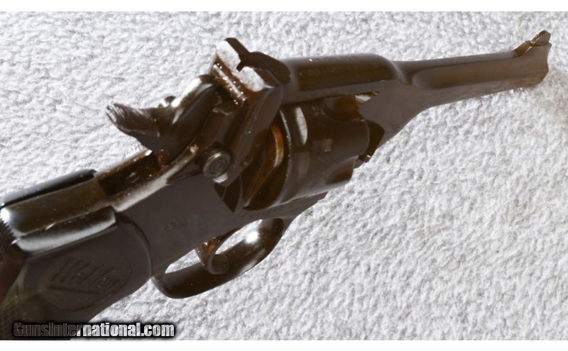 Description: The Webley Mark IV was the standard issue service revolver for the United Kingdom and may still remain in use as a police sidearm in some countries. This gun was made in England and imported by Century Arms International. Bluing is excellent but has dried and hardened cosmoline in all the tight spots on the gun. Grips are in excellent condition. No box. Cool piece of history. .38 S&W SOLD Metal Condition: Excellent Bore Condition: Excellent Barrels: 5 Triggers: Original Butt Pad: Checkered Hard Rubber Webley Grips Weight: 31 Oz. Sights: Blade Front - Fixed Square Notch Rear Item Location: Wheeling |
