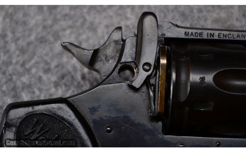 Description: This nice Webley & Scott Mark IV is straight out of the history books. This model unfortunately has the Century Arms hole drilled through the rear of the frame by the hammer for a crossbar safety for import and some minor pitting on the barrel. The lock-up when the hammer is cocked is pretty good and even better when used in double action. Perfect as a shooter or for historical reenactment! .38 S&W SOLD Metal Condition: Fair w/ Minor Pitting on One Cylinder (Pictured) Bore Condition: Good w/ Clear Rifling Barrels: 5.0 Weight: 2 lbs Item Location: Hammond, IN |