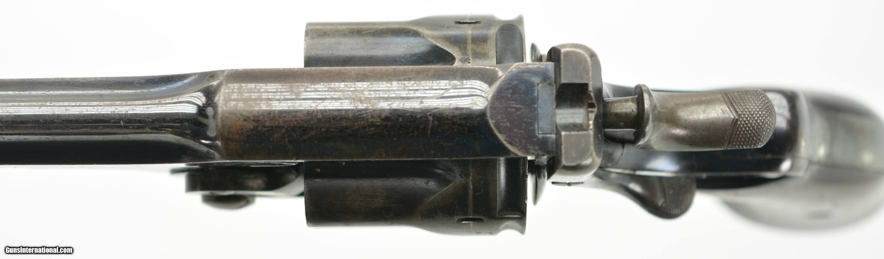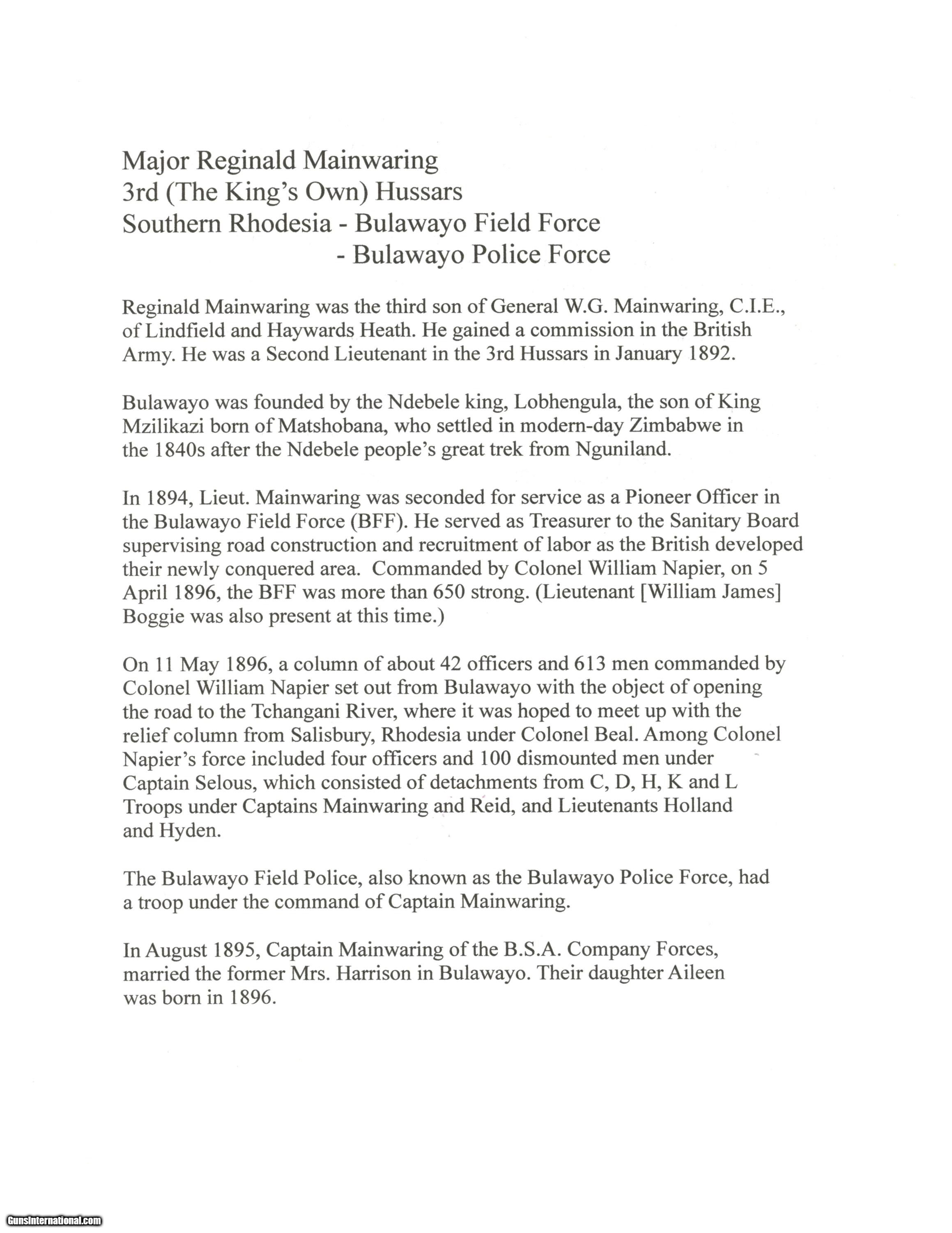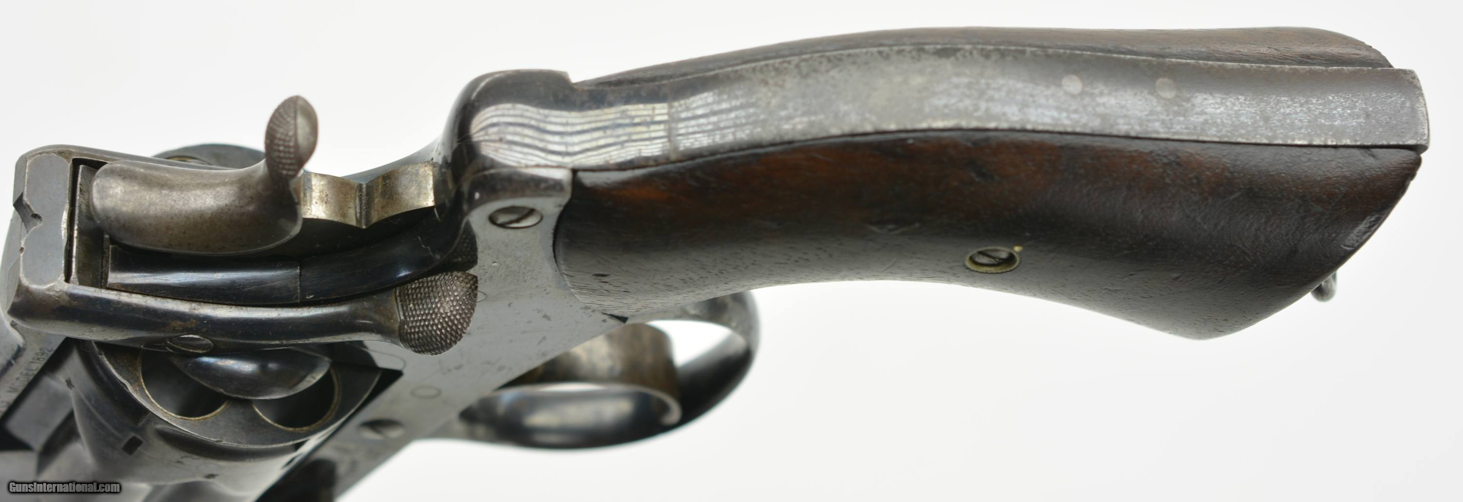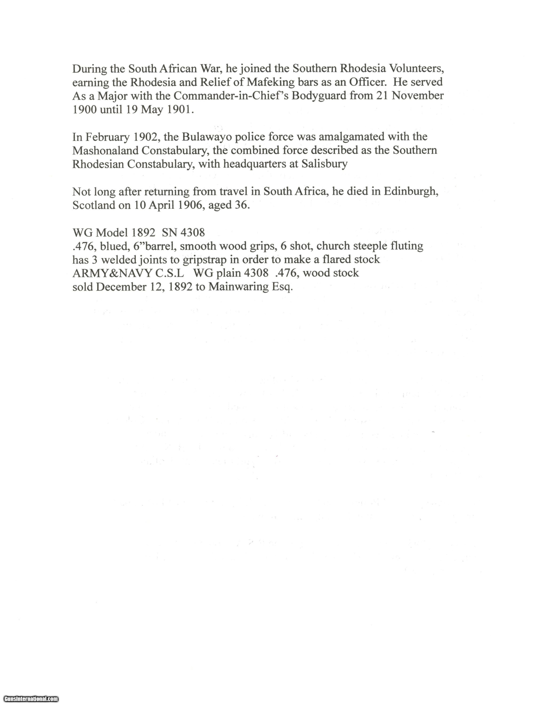 Description: Serial #4308, .476, 6" barrel with an excellent, bright bore. This is a handsome revolver that retains 80-85% of the original blue finish, with the balance faded to a mellow plum-brown patina, and some silvering along the high edges as well. The “church steeple"-fluted cylinder is serial numbered to the gun (308), and the frame and barrel have matching assembly numbers (3433). The topstrap has Webley “'WG' ARMY MODEL 1892" marking with the Webley & Scott “Winged Bullet" on the lower left side of the frame, and the “ARMY & NAVY CSL" retailer marking along the barrel rib. The walnut grips are in fine condition with some scattered small scratches and blemishes, and are also assembly numbered to the gun on the interior. The barrel lock-up is tight, with merely a hint of lateral play when closed, and the mechanism functions flawlessly. Army & Navy CSL records list this revolver as having been sold on December 12, 1892 to “Mainwaring Esq". Reginald Mainwaring was born in 1870 and was the third son of Gen. W.G. Mainwaring, CIE, and was commissioned a 2nd Lieutenant of the 3rd (King’s Own) Hussars in January of 1892. He was seconded for service as a Pioneer Officer with the Bulawayo Field Force in what eventually become Rhodesia/Zimbabwe. He served as Treasurer to the Sanitary Board supervising road construction and labor recruitment and also as a Troop Commander of the BFF upon receiving a promotion to Captain. Upon the outbreak of the Boer War he joined the Southern Rhodesia Volunteers, earning the “Rhodesia" and “Relief of Mafeking" bars as a Major in the Commander-in-Chief’s Bodyguard from November 21, 1900 to May 19, 1901. The following year the Bulawayo Field Force was amalgamated with the Mashonaland Constabulary to form the Southern Rhodesia Constabulary, headquartered in Salisbury (Harare). He returned to Britain between 1905 and 1906, but passed away in Edinburgh, Scotland on April 10, 1906 at the age of 36. This is a handsome WG, with Rhodesian and Boer War history, and is in fine condition overall. Antique SOLD Antique: Yes Manufacturer: Webley Model: WG Serial Number: 4308 Caliber Info: .476 Gauge Info: .476 |
