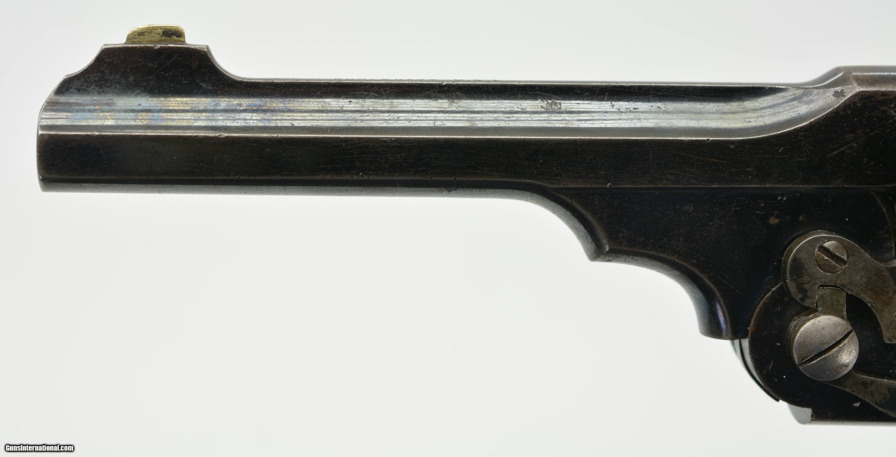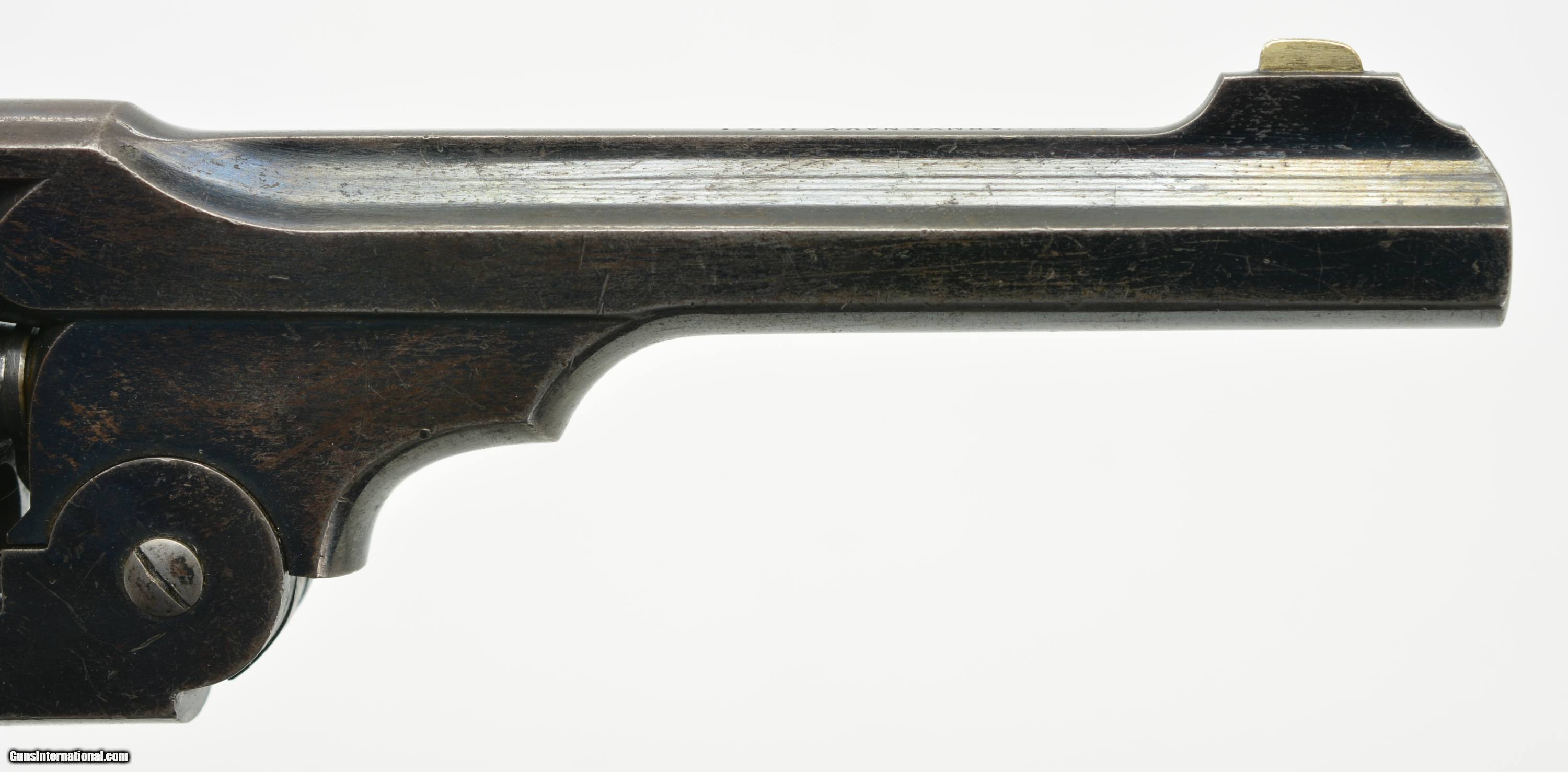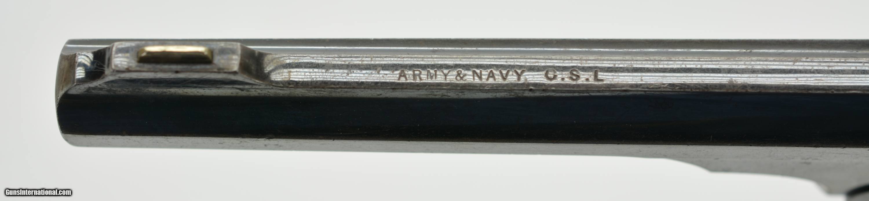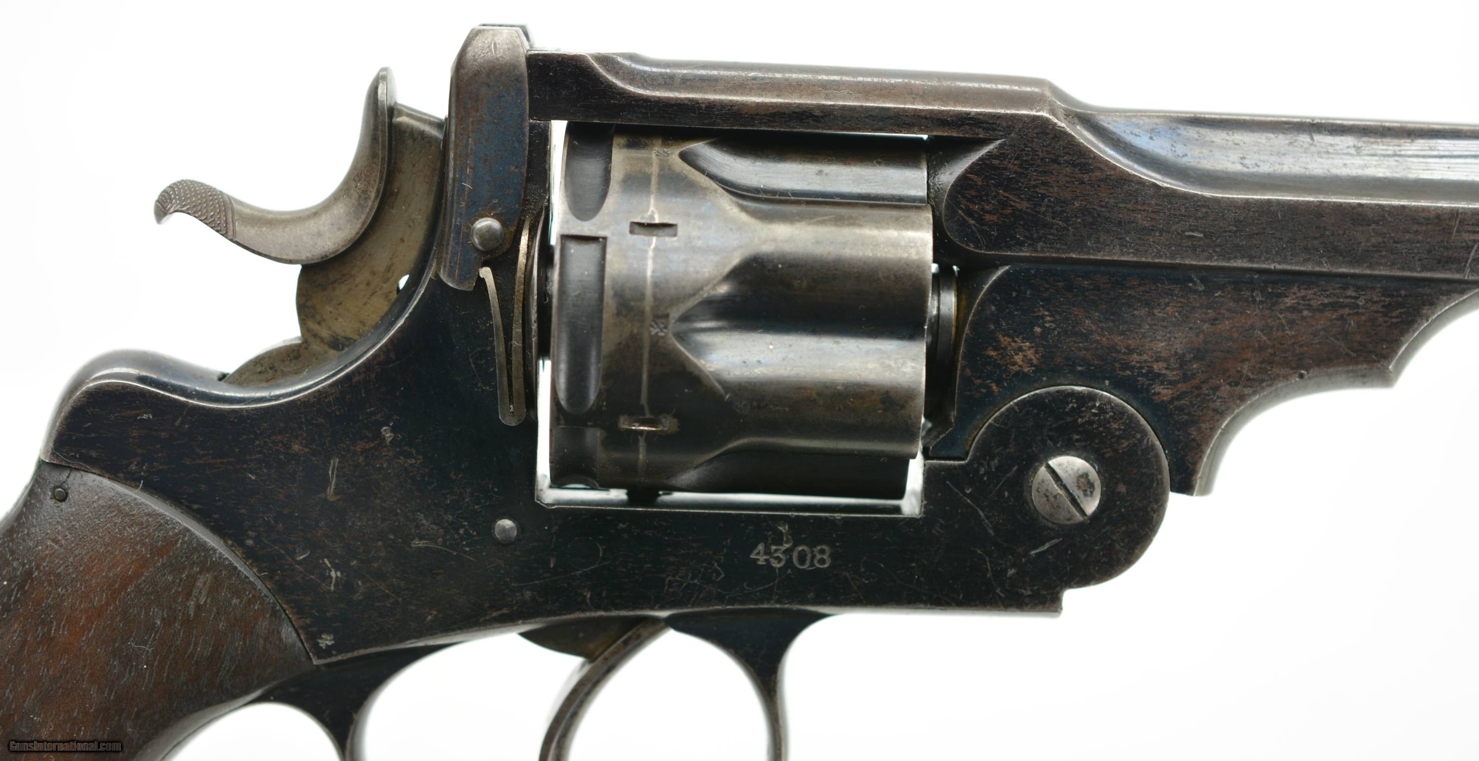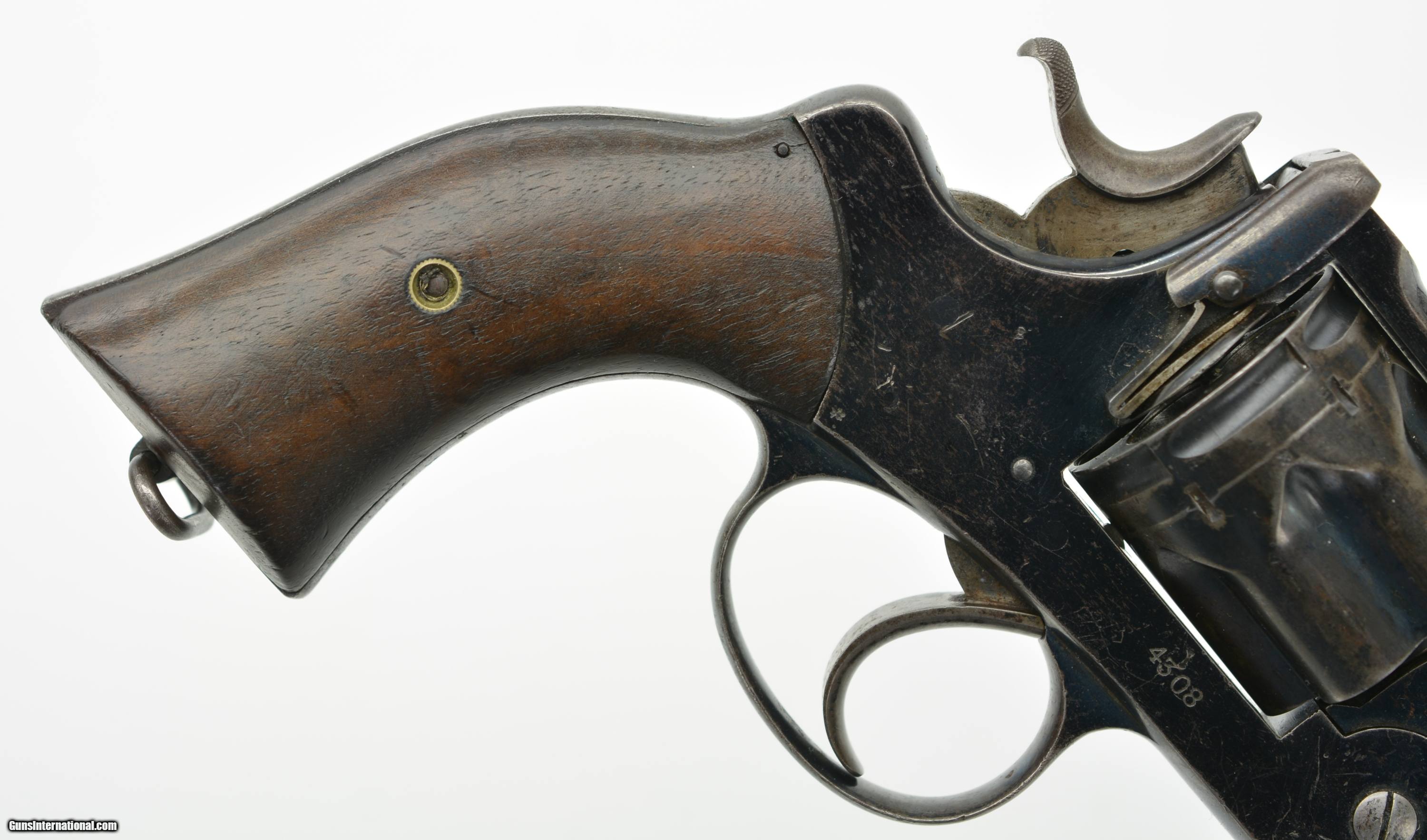 Description: Serial #4308, .476, 6" barrel with an excellent, bright bore. This is a handsome revolver that retains 80-85% of the original blue finish, with the balance faded to a mellow plum-brown patina, and some silvering along the high edges as well. The “church steeple"-fluted cylinder is serial numbered to the gun (308), and the frame and barrel have matching assembly numbers (3433). The topstrap has Webley “'WG' ARMY MODEL 1892" marking with the Webley & Scott “Winged Bullet" on the lower left side of the frame, and the “ARMY & NAVY CSL" retailer marking along the barrel rib. The walnut grips are in fine condition with some scattered small scratches and blemishes, and are also assembly numbered to the gun on the interior. The barrel lock-up is tight, with merely a hint of lateral play when closed, and the mechanism functions flawlessly. Army & Navy CSL records list this revolver as having been sold on December 12, 1892 to “Mainwaring Esq". Reginald Mainwaring was born in 1870 and was the third son of Gen. W.G. Mainwaring, CIE, and was commissioned a 2nd Lieutenant of the 3rd (King’s Own) Hussars in January of 1892. He was seconded for service as a Pioneer Officer with the Bulawayo Field Force in what eventually become Rhodesia/Zimbabwe. He served as Treasurer to the Sanitary Board supervising road construction and labor recruitment and also as a Troop Commander of the BFF upon receiving a promotion to Captain. Upon the outbreak of the Boer War he joined the Southern Rhodesia Volunteers, earning the “Rhodesia" and “Relief of Mafeking" bars as a Major in the Commander-in-Chief’s Bodyguard from November 21, 1900 to May 19, 1901. The following year the Bulawayo Field Force was amalgamated with the Mashonaland Constabulary to form the Southern Rhodesia Constabulary, headquartered in Salisbury (Harare). He returned to Britain between 1905 and 1906, but passed away in Edinburgh, Scotland on April 10, 1906 at the age of 36. This is a handsome WG, with Rhodesian and Boer War history, and is in fine condition overall. Antique SOLD Antique: Yes Manufacturer: Webley Model: WG Serial Number: 4308 Caliber Info: .476 Gauge Info: .476 |