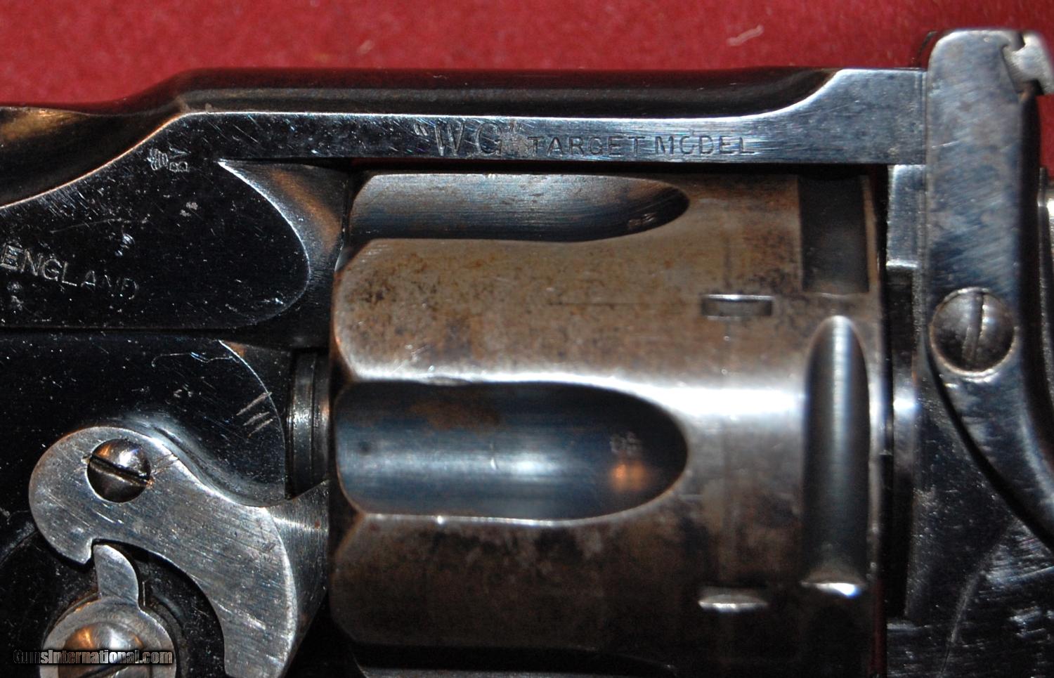 Description: Rare Webley WG Target revolver.Built in the late 1880s,this revolver retains at least 85% of the original blue finish.The 6" barrel has a bright bore with sharp rifling and no pits or rust.The original target grips are in excellent condition with no cracks or chips.The hammer is strong and smooth and the cylinder indexes perfectly.The cylinders have been lengthend to accept 45 Colt cartridges.A fine example of a Webley target.C&R eligible. SOLD Curio/Relic: Yes Manufacturer: Webley Model: W.G.Target Serial Number: 21823 Caliber Info: 45 Colt/455 Webley |