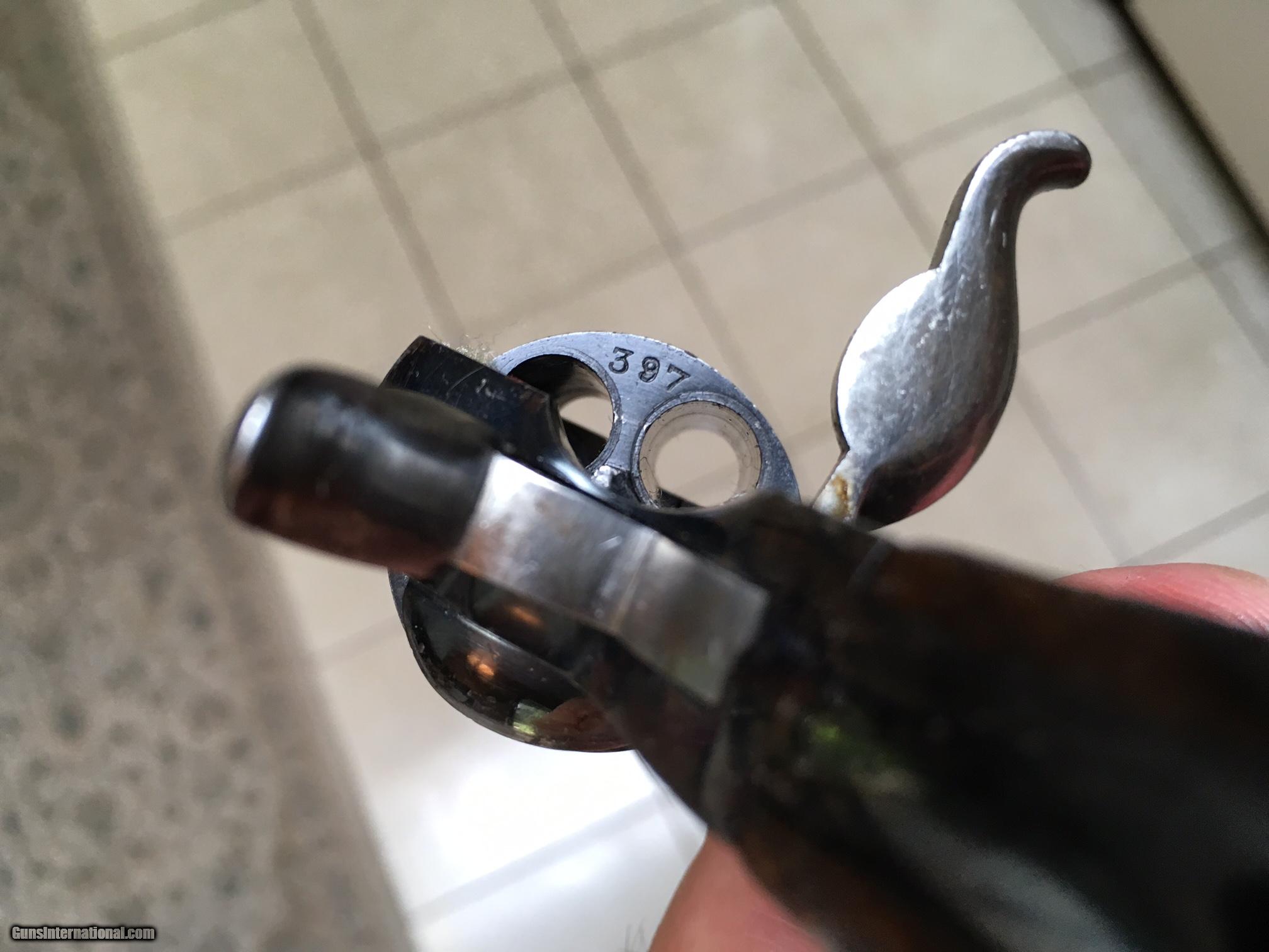 Description: Webley #2 Bulldog, Ser# 92397 Mfg Pre 1898, 32 caliber.All correct and matching. Nice wood grips , 95% of original high polish finish (Blue) .Mechanically perfect , nice bore and cylinder.longer grip shape.Gun is retail marked to J.Venables &Son ,Oxford . England of course. Nice little high finish revolver in excellent condition with a few pitting areas, cylinder flute left side rear on frame otherwise very nice high polish blue . Hard to come by in this condition. Most are blue and patina. call any time 612 859 5673 Tom SOLD Curio/Relic: Yes Antique: Yes |