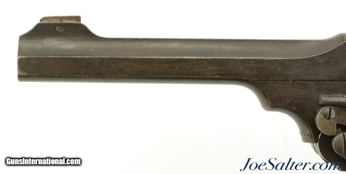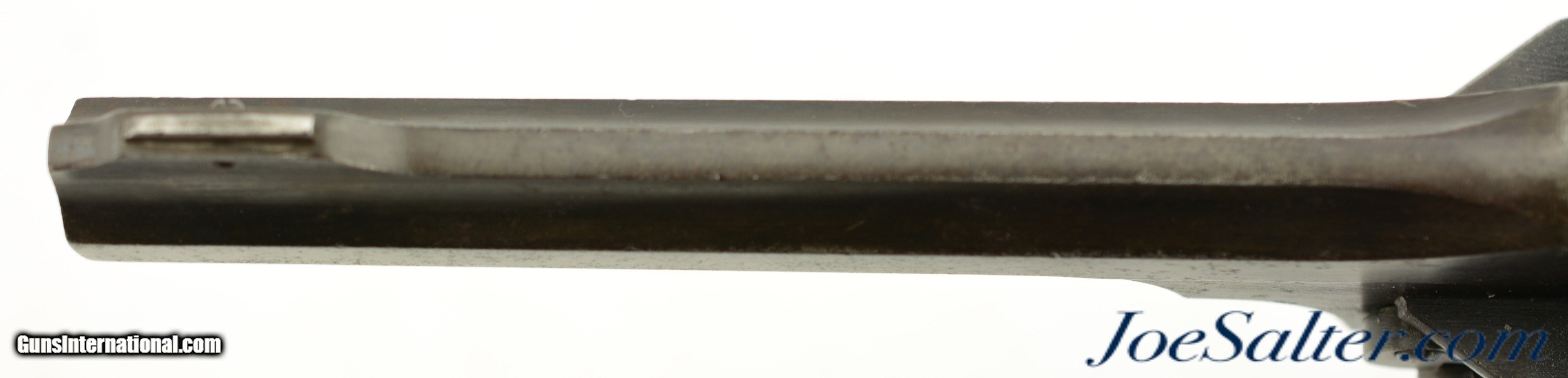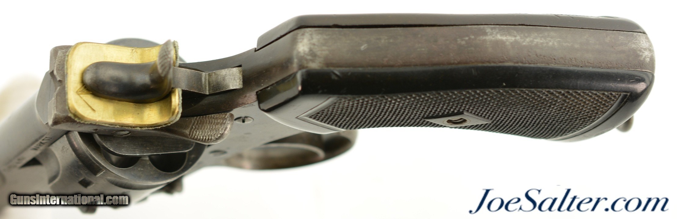 Description: Serial #227347, .45 ACP, 6 inch barrel with an excellent bore. This is the Webley Mark VI British Service revolver dated 1916 with all of the appropriate British proofs, unit markings and Broad arrows. The non-import marked WWI issued top break shows much of a later applied blue finish with scattered light freckling and tiny surface pitting. The grips are intact except for a chip on the bottom of the right one. It has had the cylinder shaved to accept the .45 Auto Rim or 45 ACP with half moon clips, a common conversion, and comes a custom made brass and leather hammer block. FFL or C&R Curio/Relic: Yes Price: $895.00 Contact Seller |
