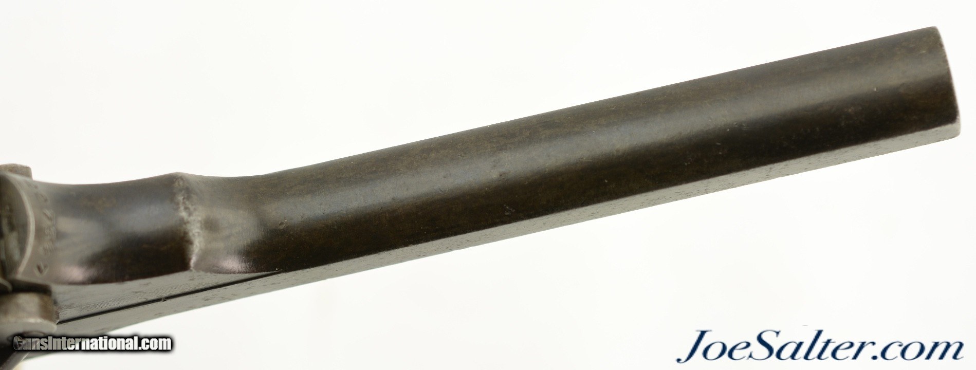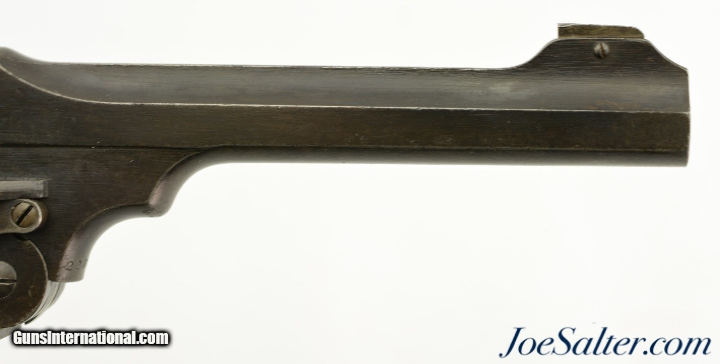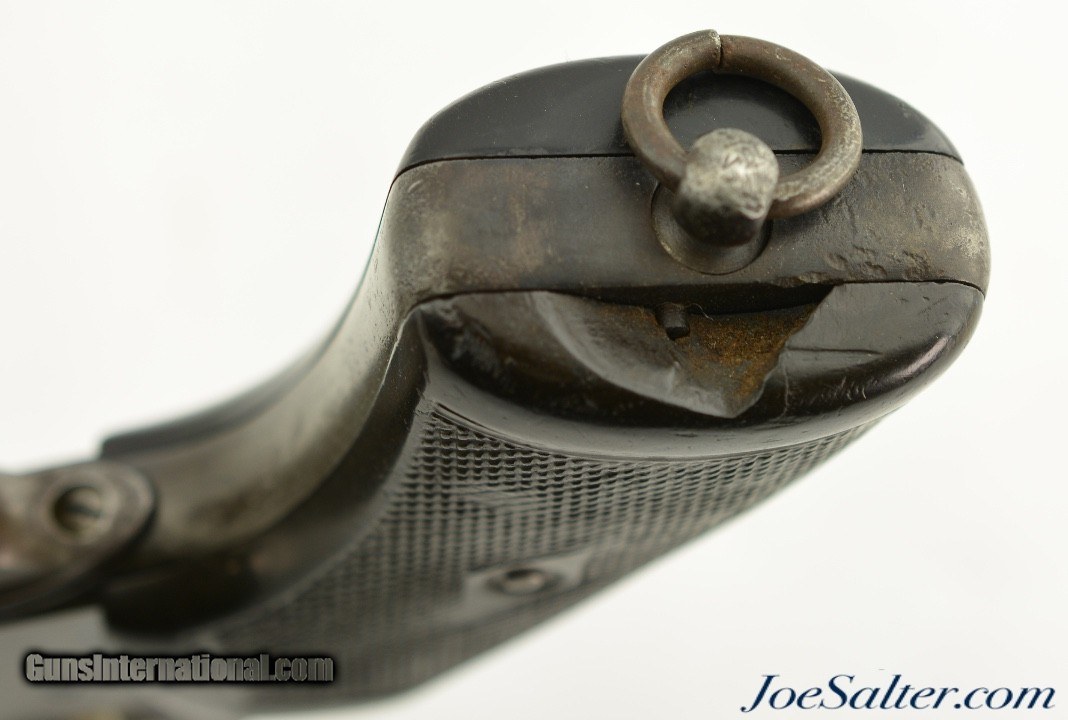 Description: Serial #227347, .45 ACP, 6 inch barrel with an excellent bore. This is the Webley Mark VI British Service revolver dated 1916 with all of the appropriate British proofs, unit markings and Broad arrows. The non-import marked WWI issued top break shows much of a later applied blue finish with scattered light freckling and tiny surface pitting. The grips are intact except for a chip on the bottom of the right one. It has had the cylinder shaved to accept the .45 Auto Rim or 45 ACP with half moon clips, a common conversion, and comes a custom made brass and leather hammer block. FFL or C&R Curio/Relic: Yes Price: $895.00 Contact Seller |
